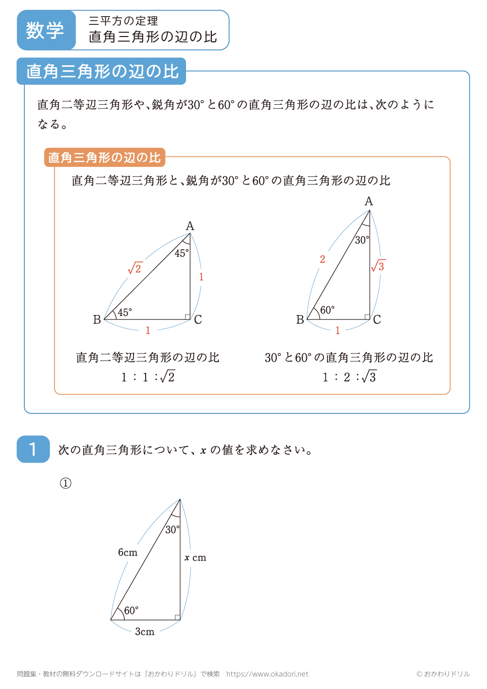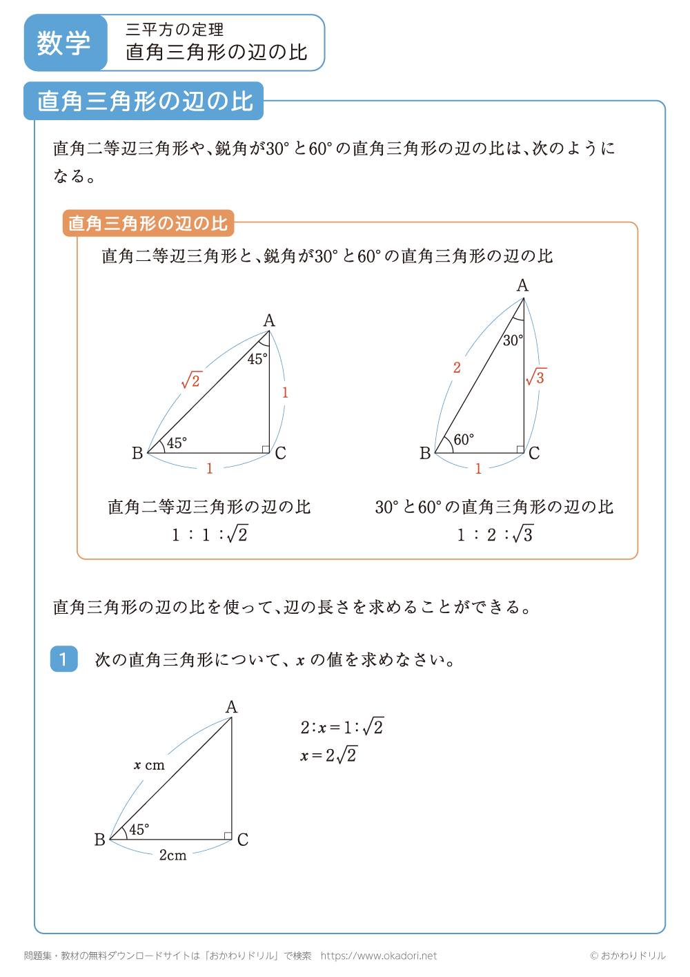 ・直角二等辺三角形や、鋭角が30°と60°の直角三角形の辺の比は、次のようになっています。