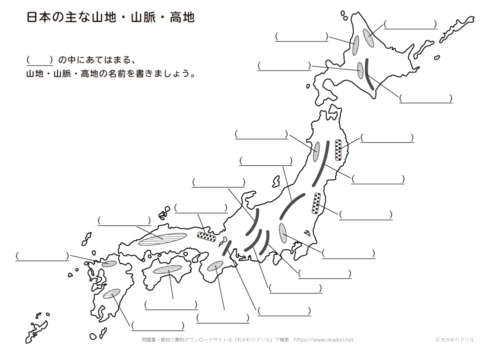 ・山脈・山地・高地の位置と名前を、地図を見ながら確認できるプリントです。