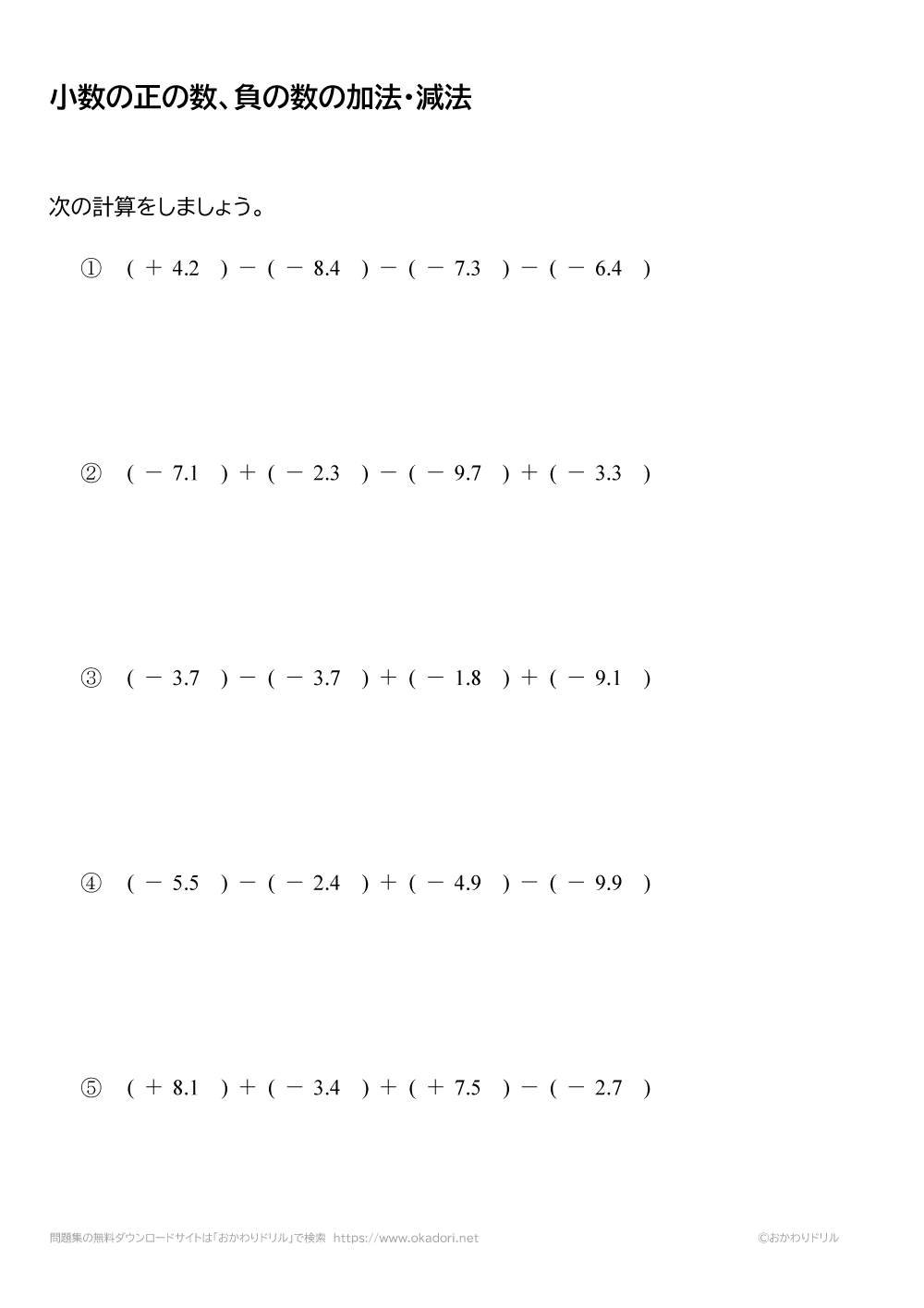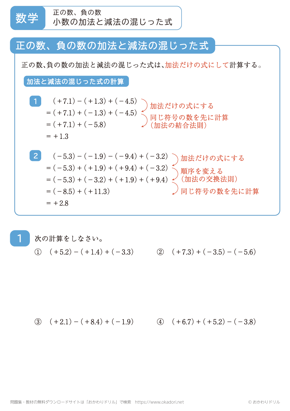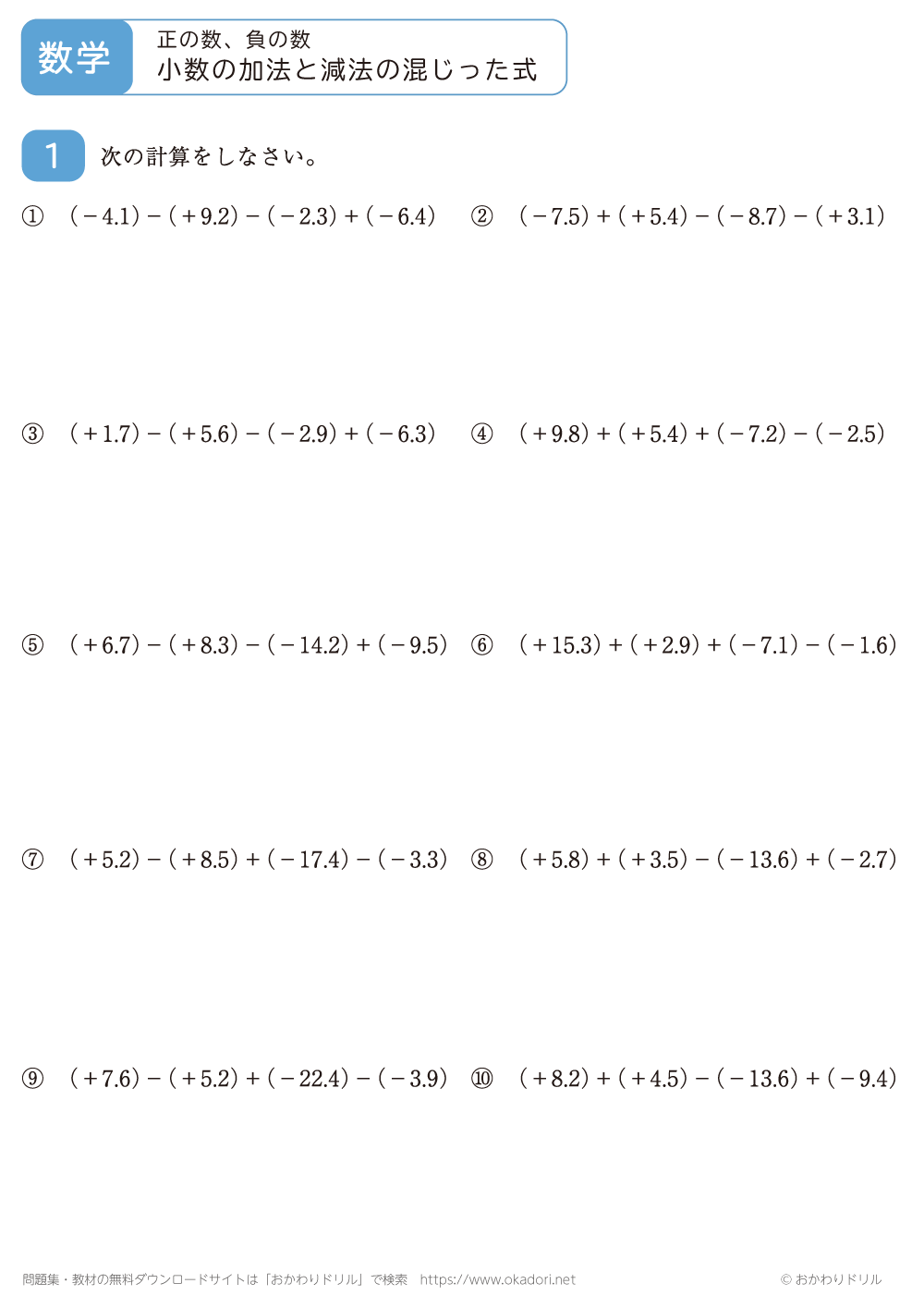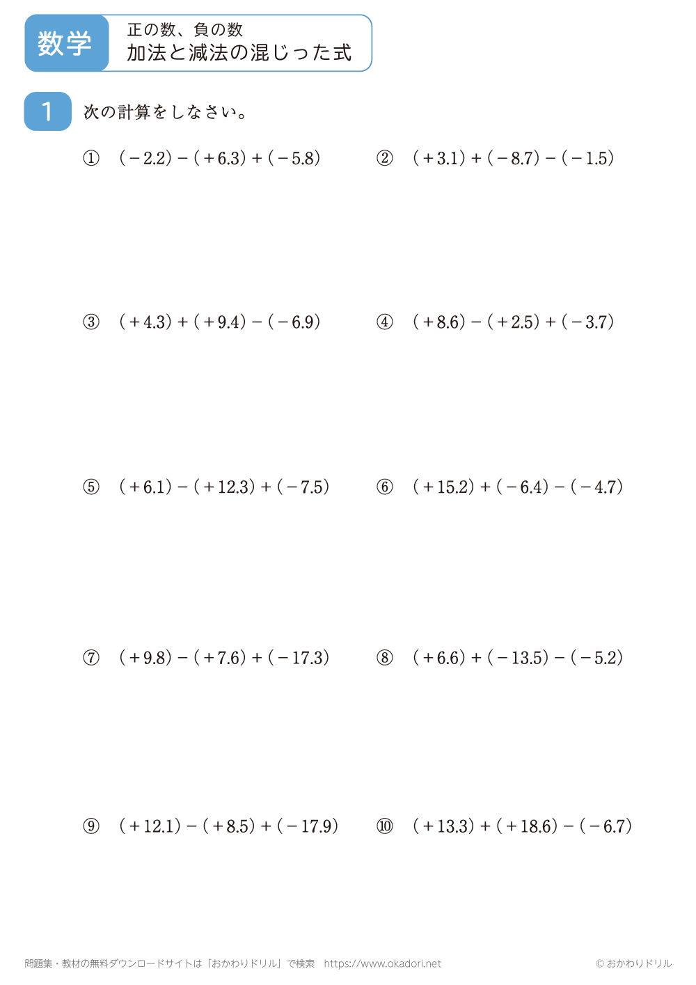 このページは、中学1年生で習う「小数の正の数・負の数の加法と減法の混じった式」が ...