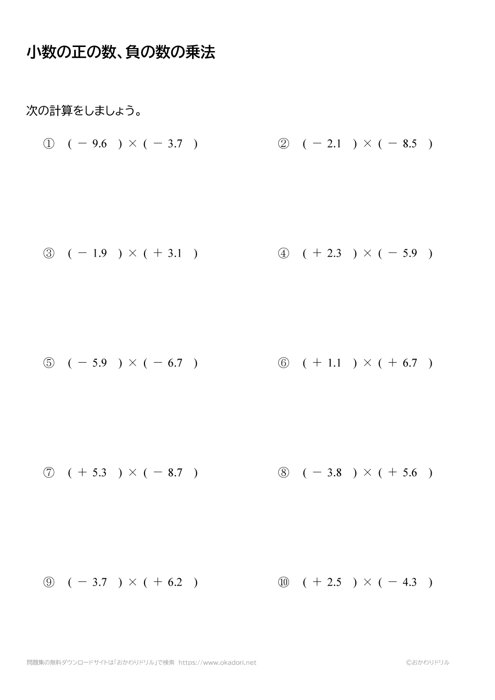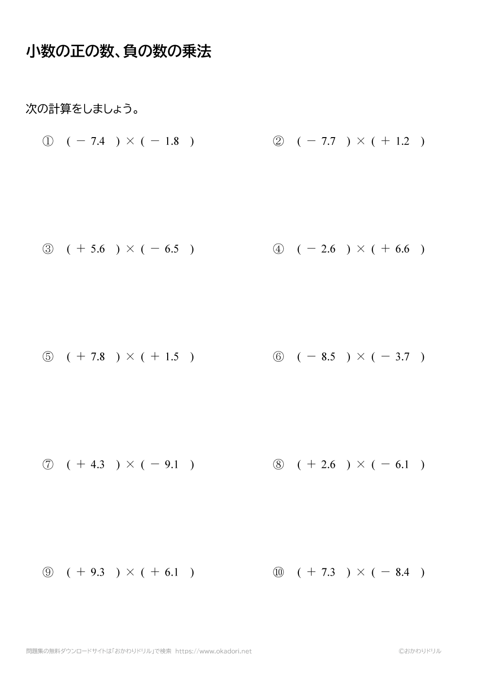 小数の正の数、負の数も、整数と同じように乗法の規則を使って解くことができます。掛ける負の数の個数などに注意して問題を解いてみて下さい。