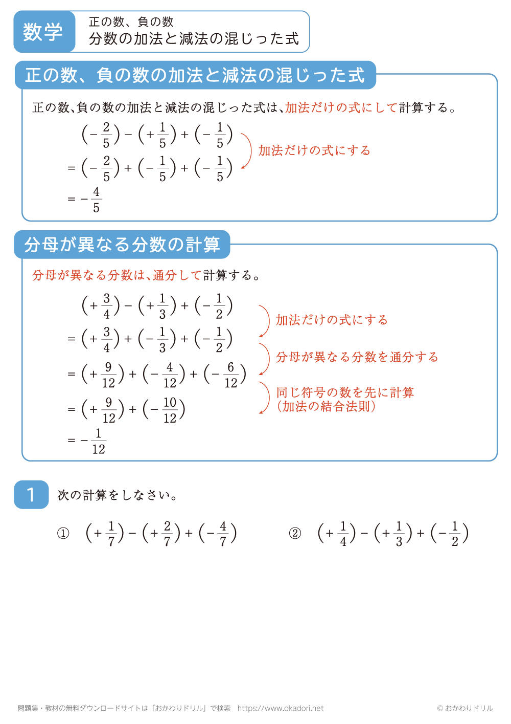 このページは、中学1年生で習う「分数の正の数・負の数の加法と減法の混じった式」が ...