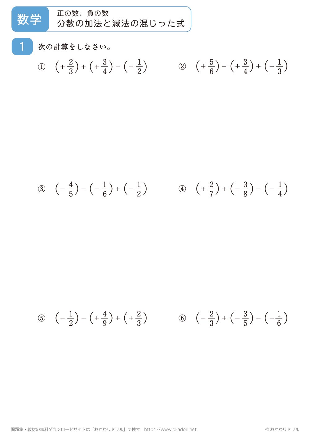 ・分数の正の数、負の数の加法・減法が混じった式を計算します。