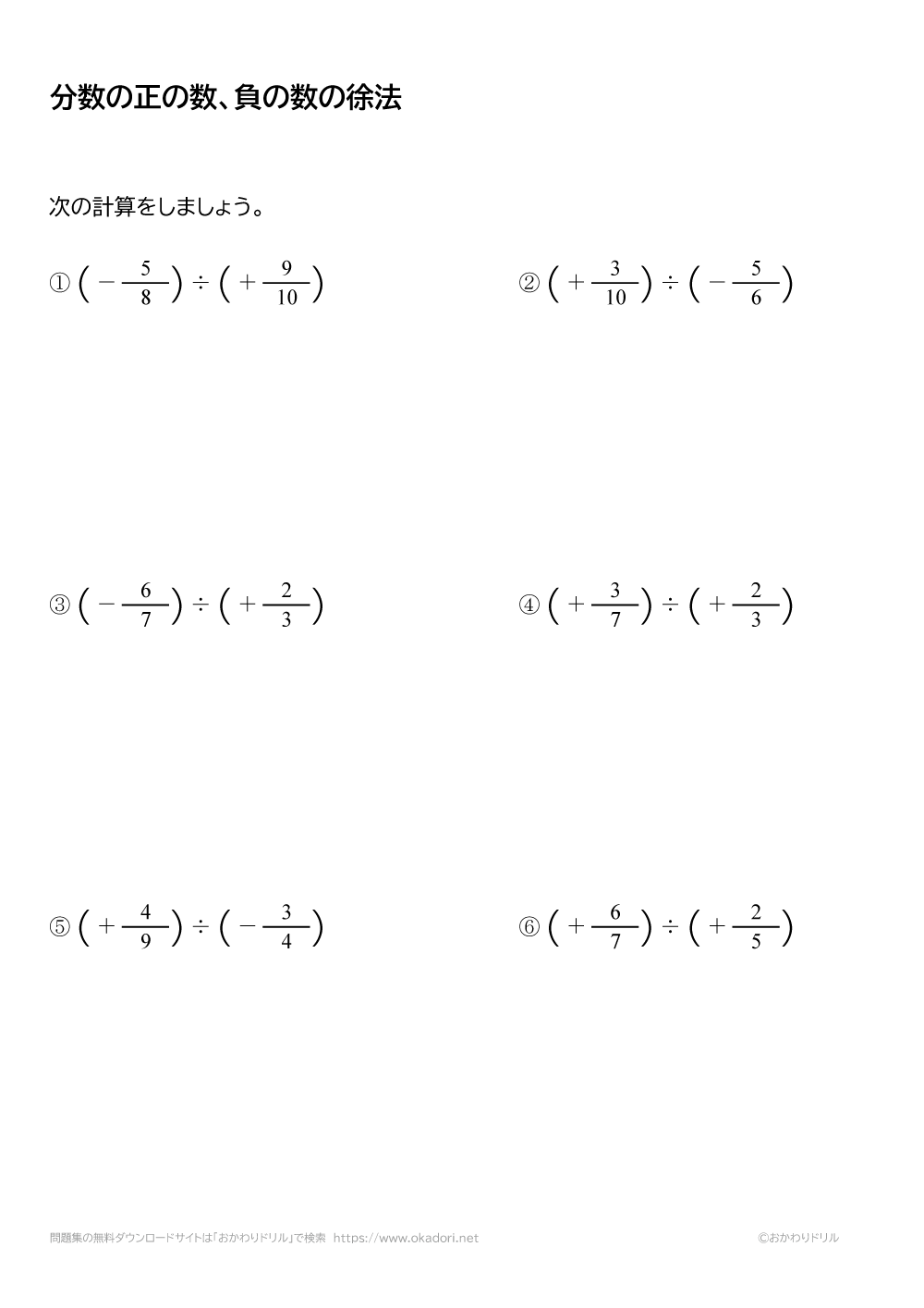 分数の正の数、負の数の割り算では、逆数の掛け算にして計算することができます。分母と分子をひっくり返して掛けることに注意して問題を解いてみて下さい。