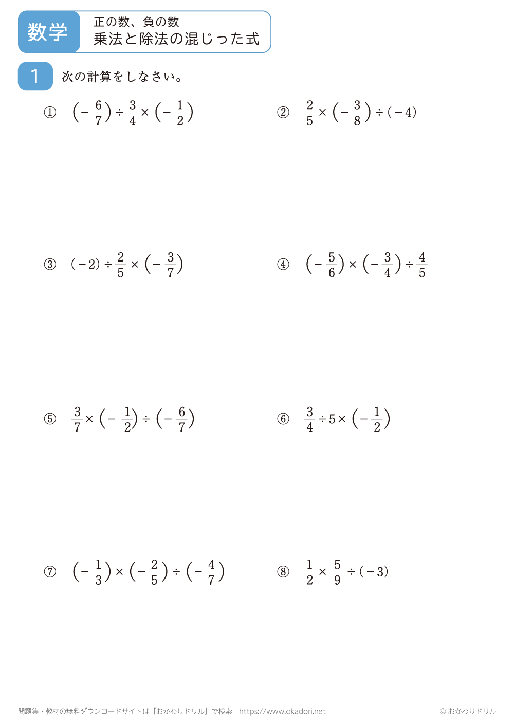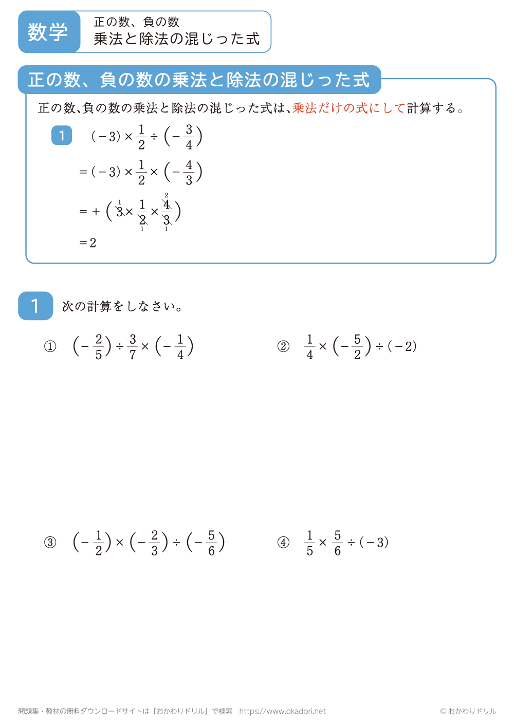 このページは、中学1年生で習う「正の数・負の数の乗法と除法の混じった式」が学習できるページです。