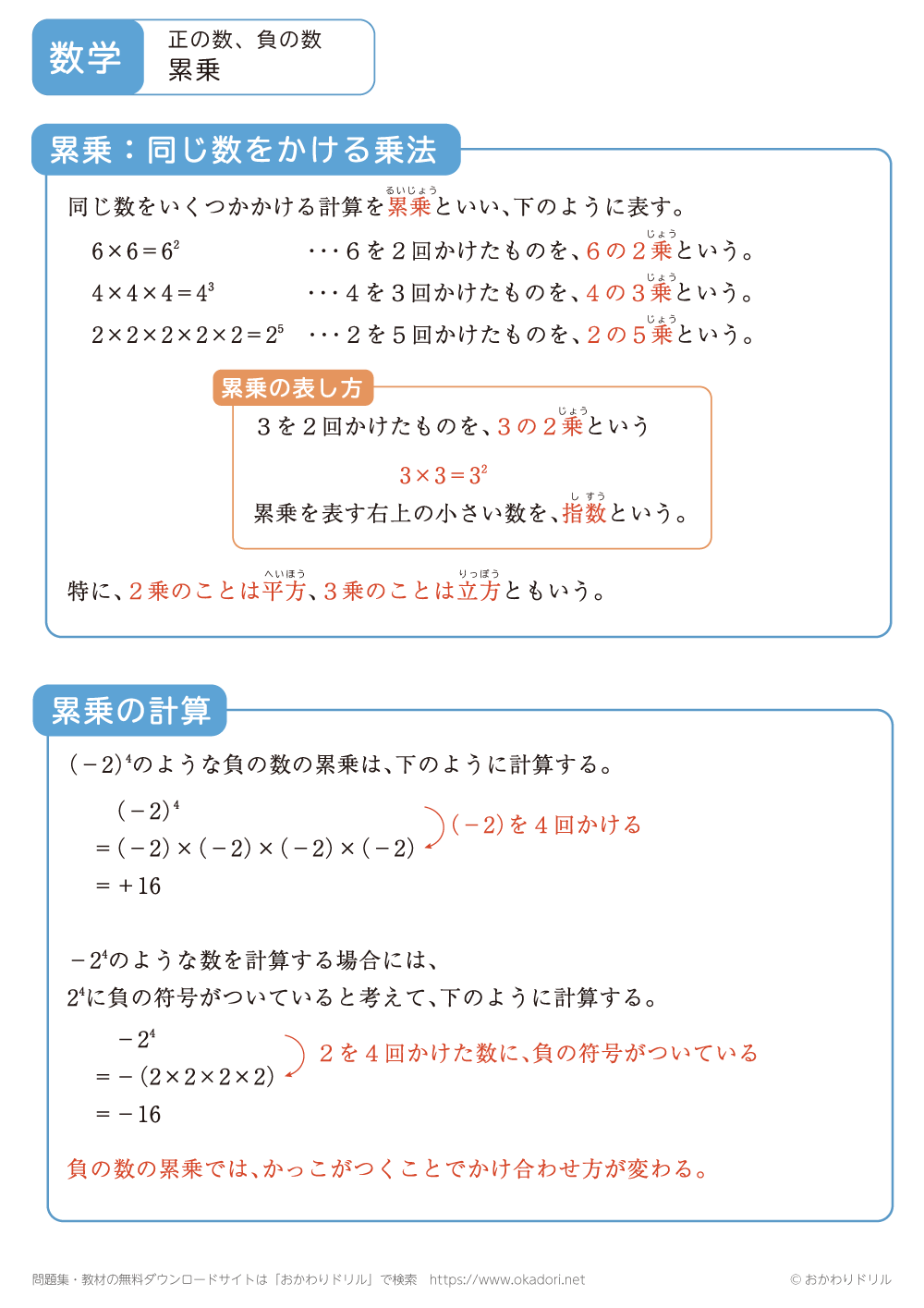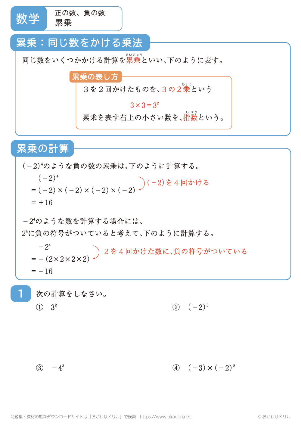 このページは、中学1年生で習う「正の数・負の数の累乗」が学習できるページです。