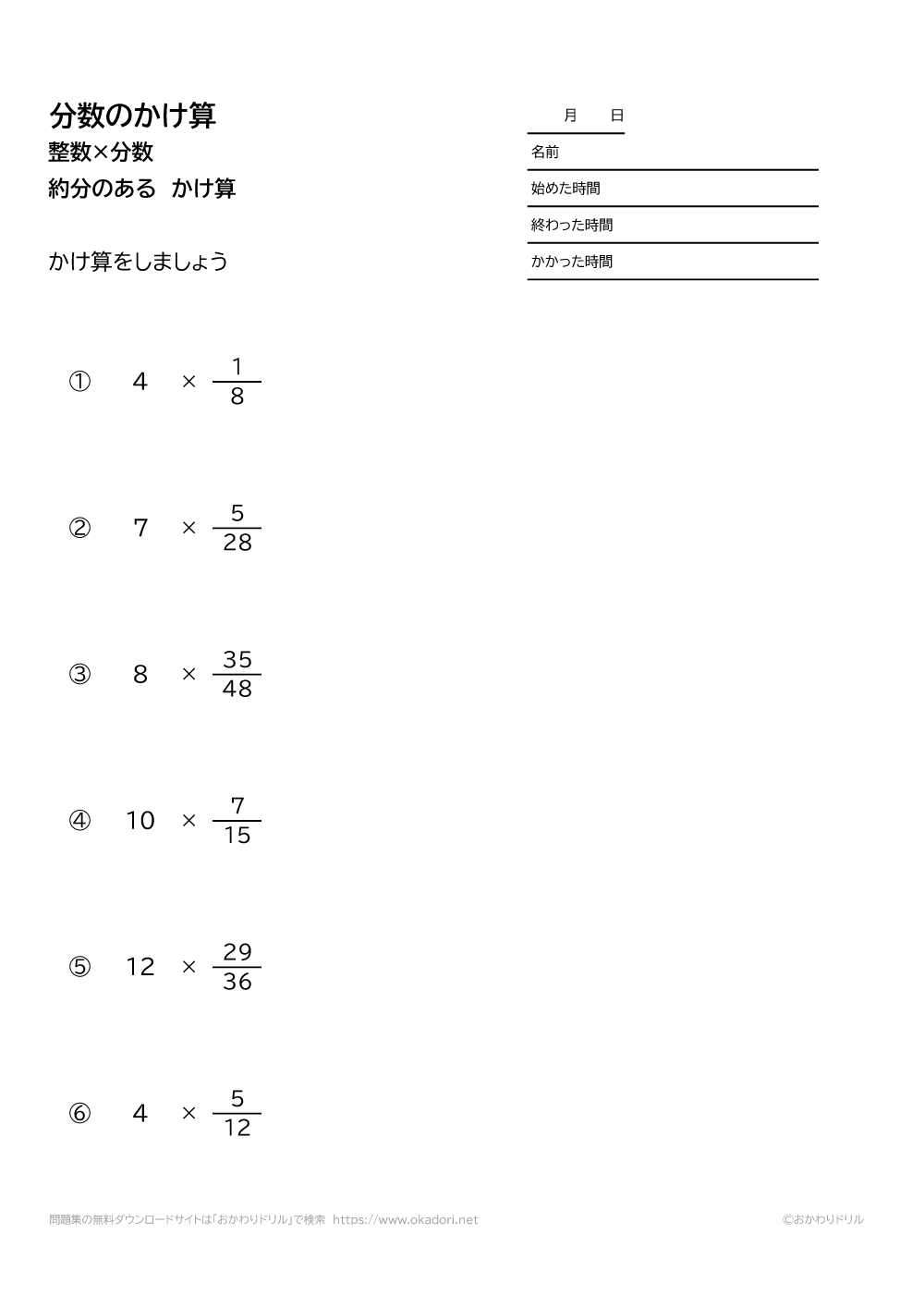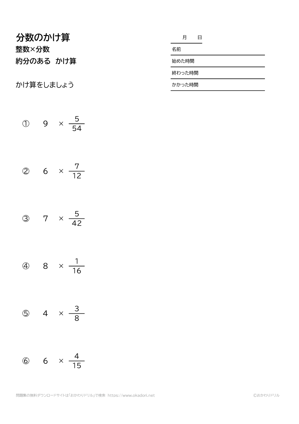 このページは、小学6年生で習う「整数×分数の約分のある掛け算」が学習できるページです。