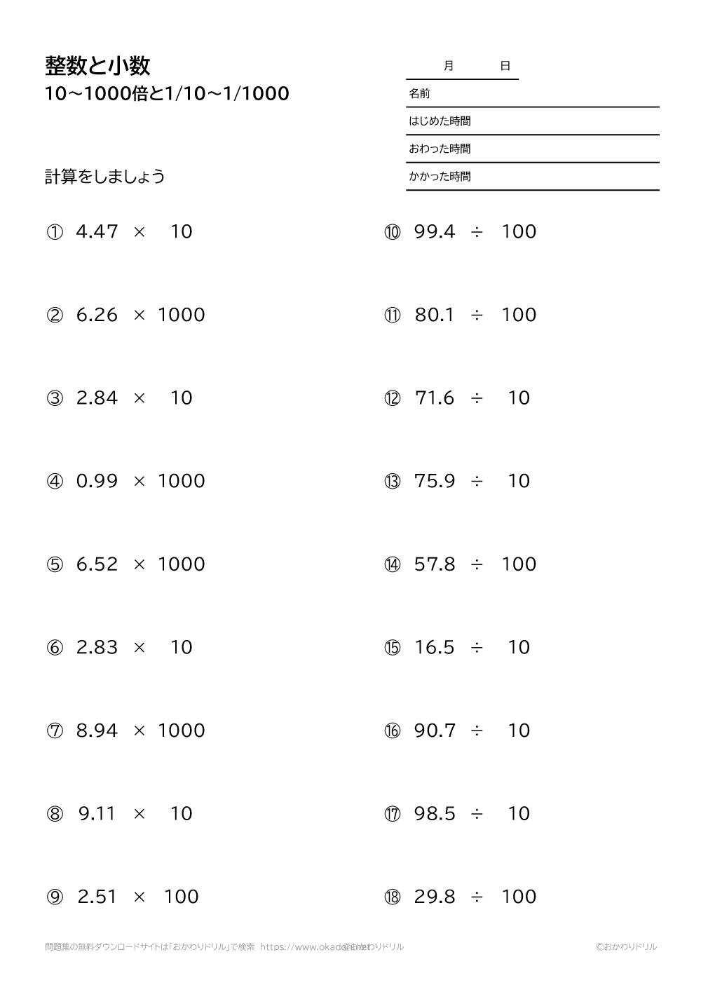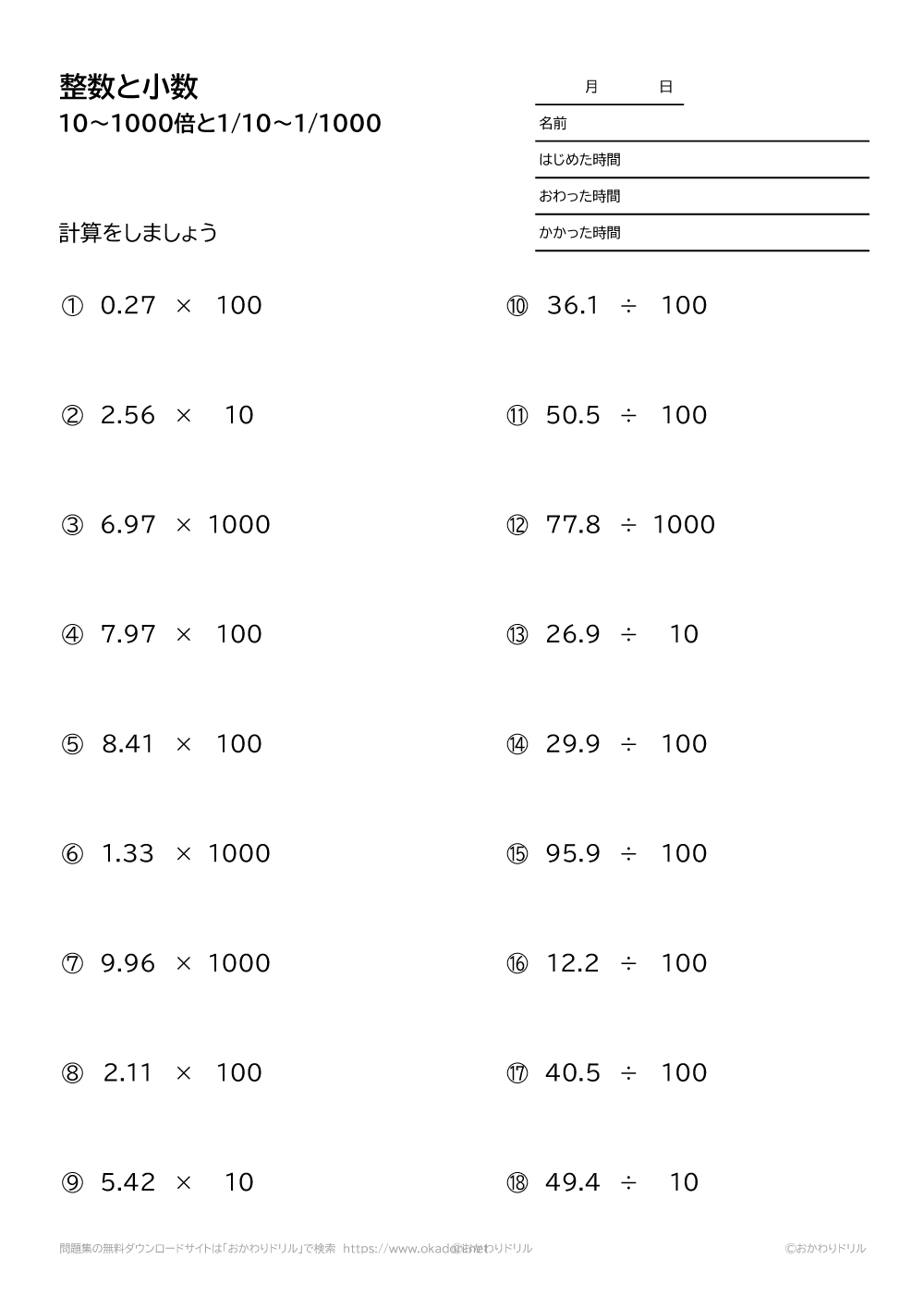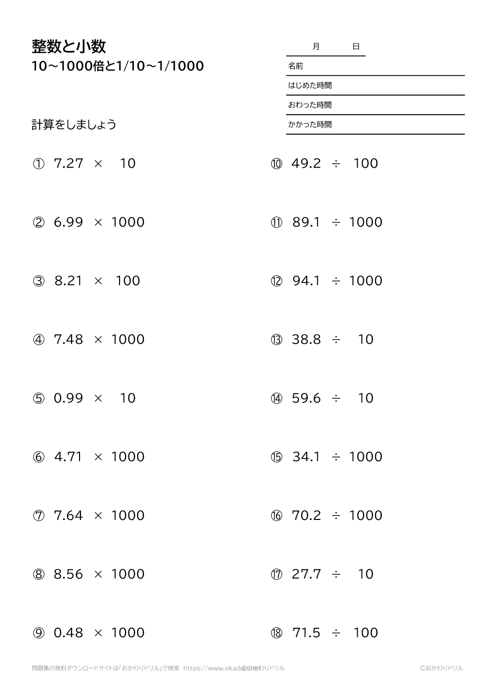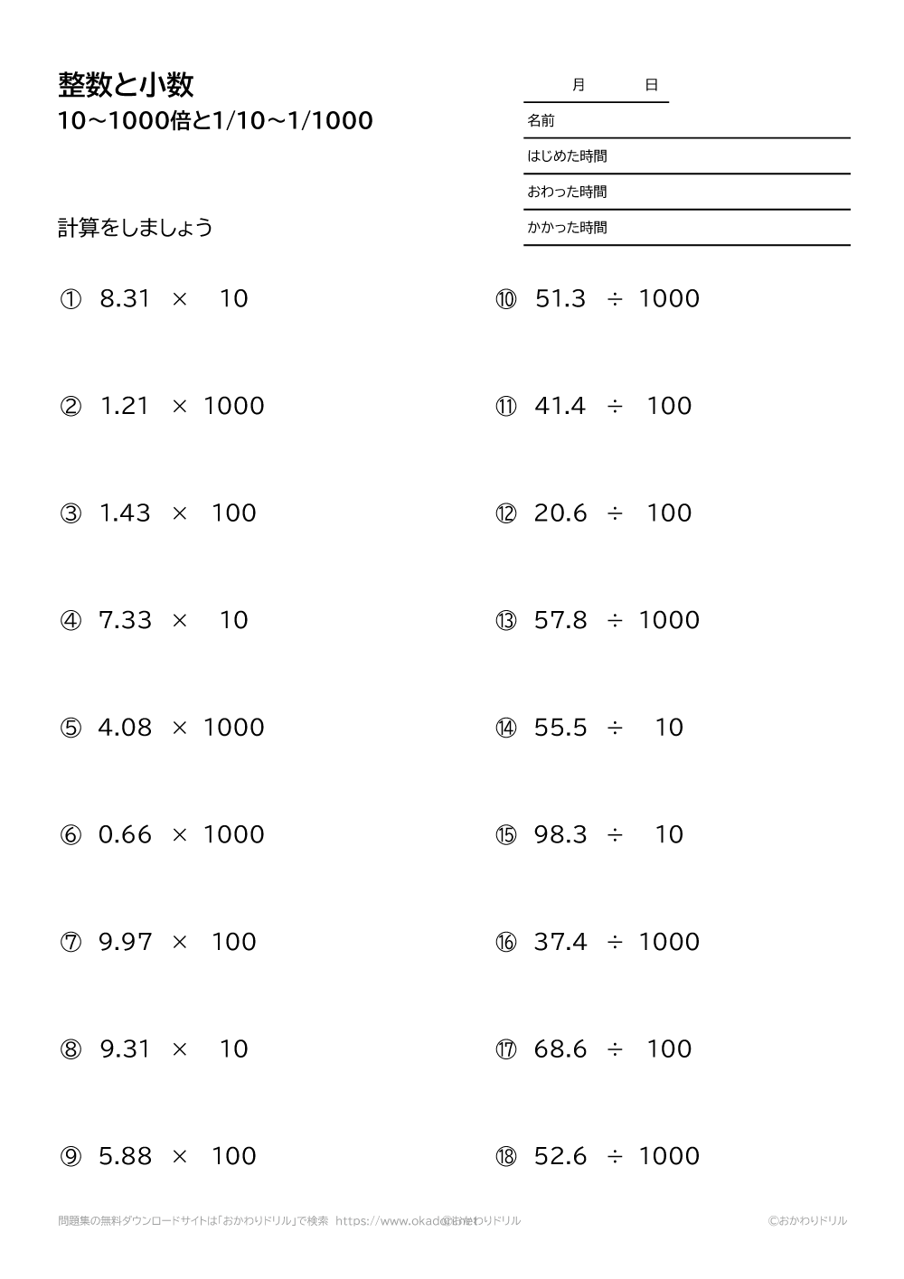 小数を10倍~1000倍に大きくした時や、10分の1~1000分の1に小さくした時に、小数点の位置がどのように変わるかを理解するための問題です。