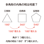 ここでは、多角形の内角の和は何度なのか?を、考えていきます。 上の図に少し説明を ...