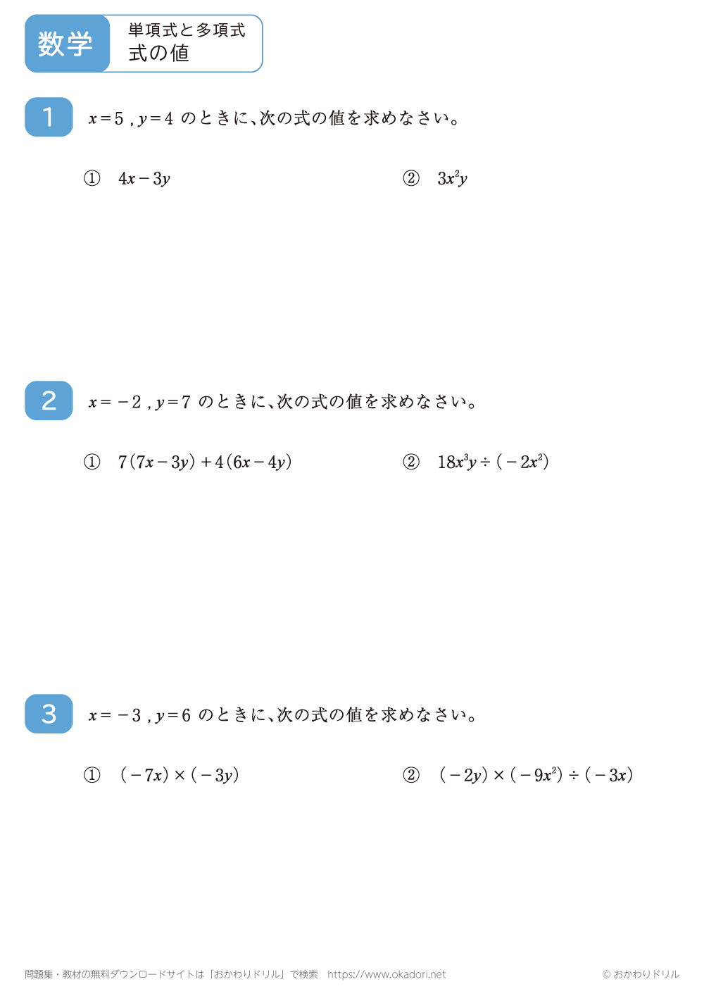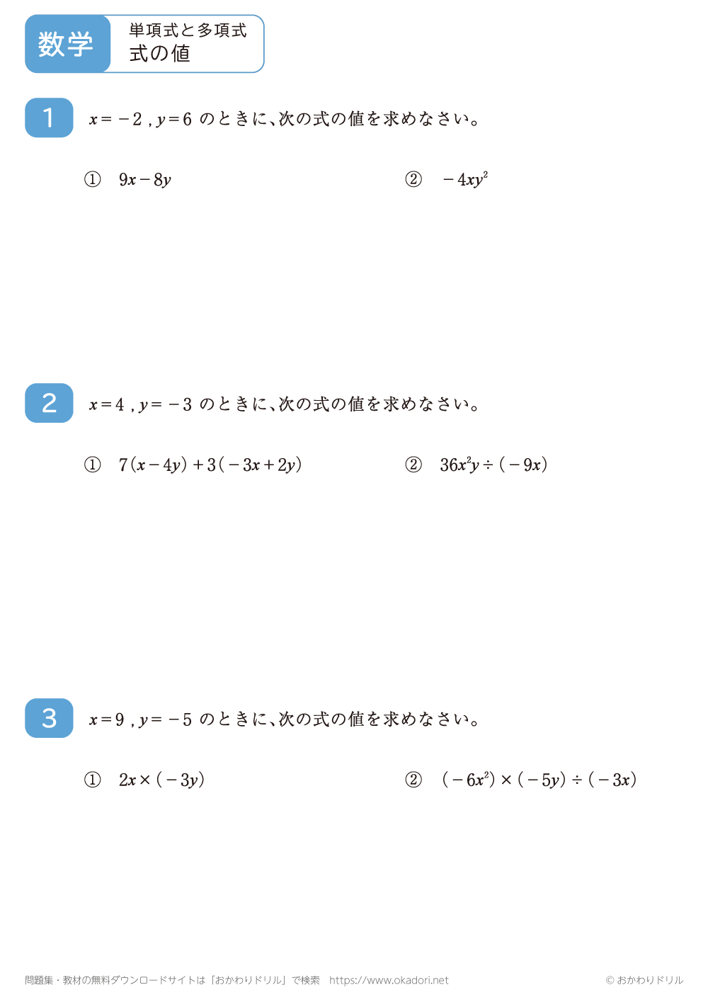 式の値を求める問題です。単項式や多項式の文字に数を代入して、式の値を求めます。式が複雑なときは、式を簡単にしてから数を代入して計算しましょう。