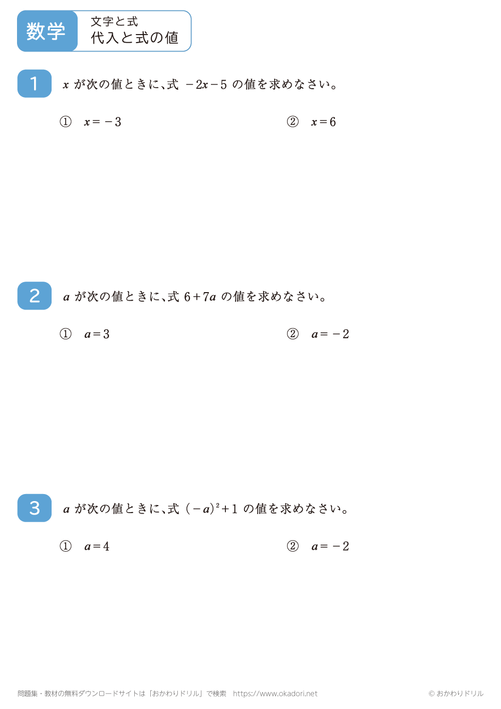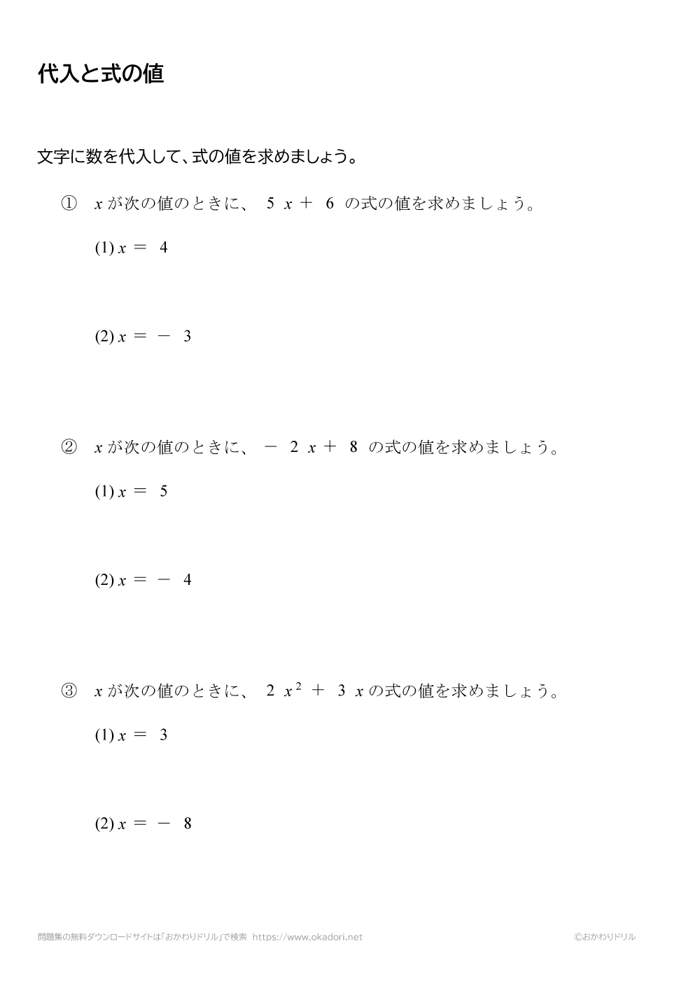・文字の値を代入して計算した結果を、式の値といいます。