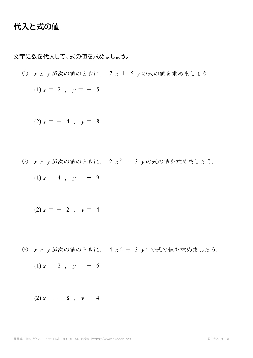 このページは、中学1年生で習う「代入と式の値」が学習できるページです。