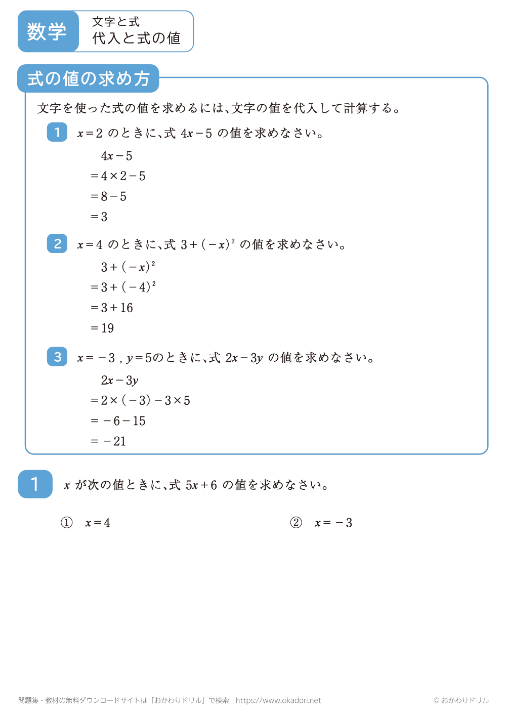 「代入と式の値」の学習プリントはこちら