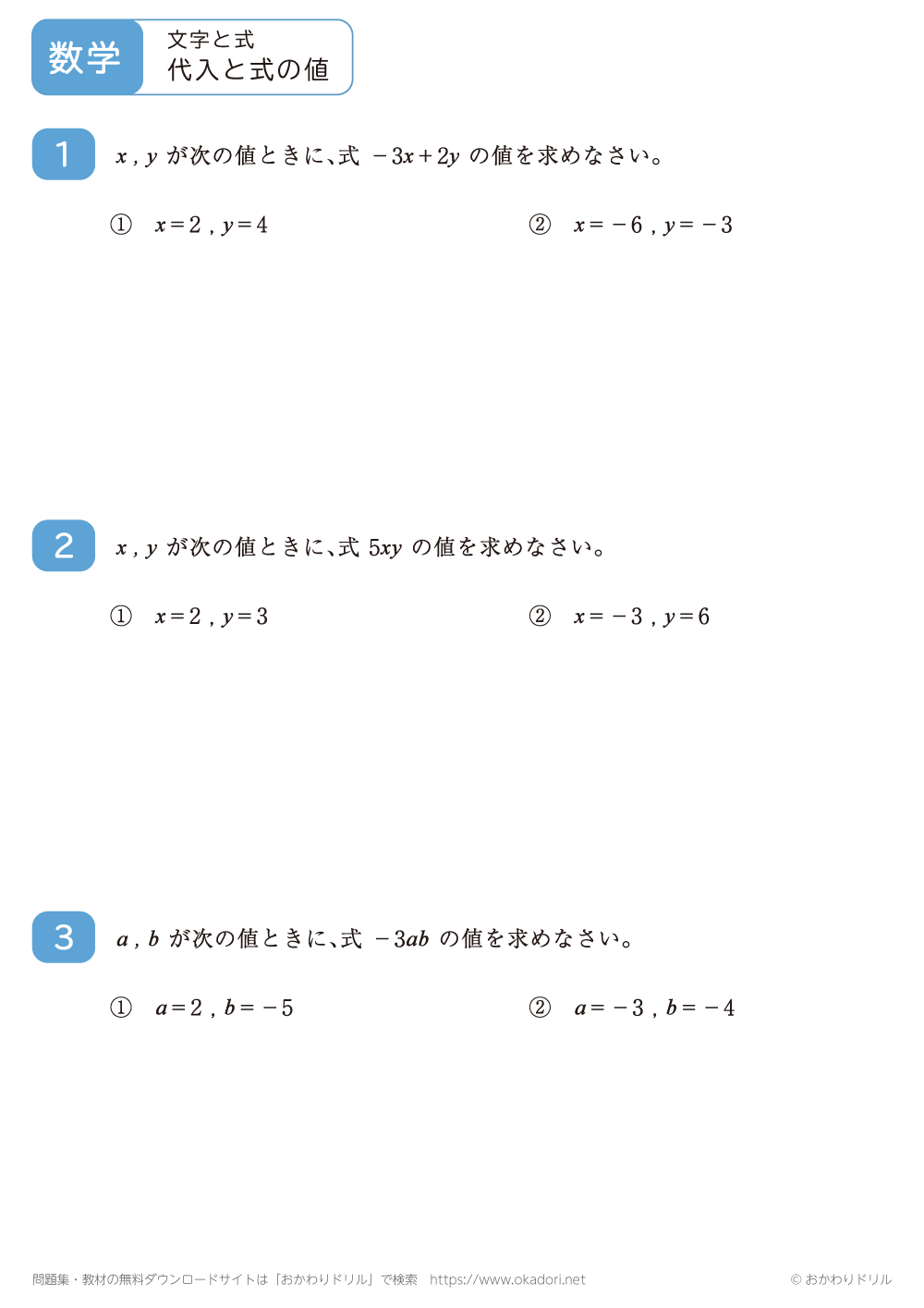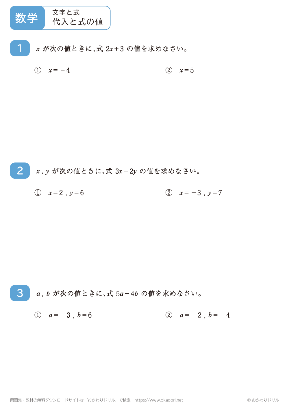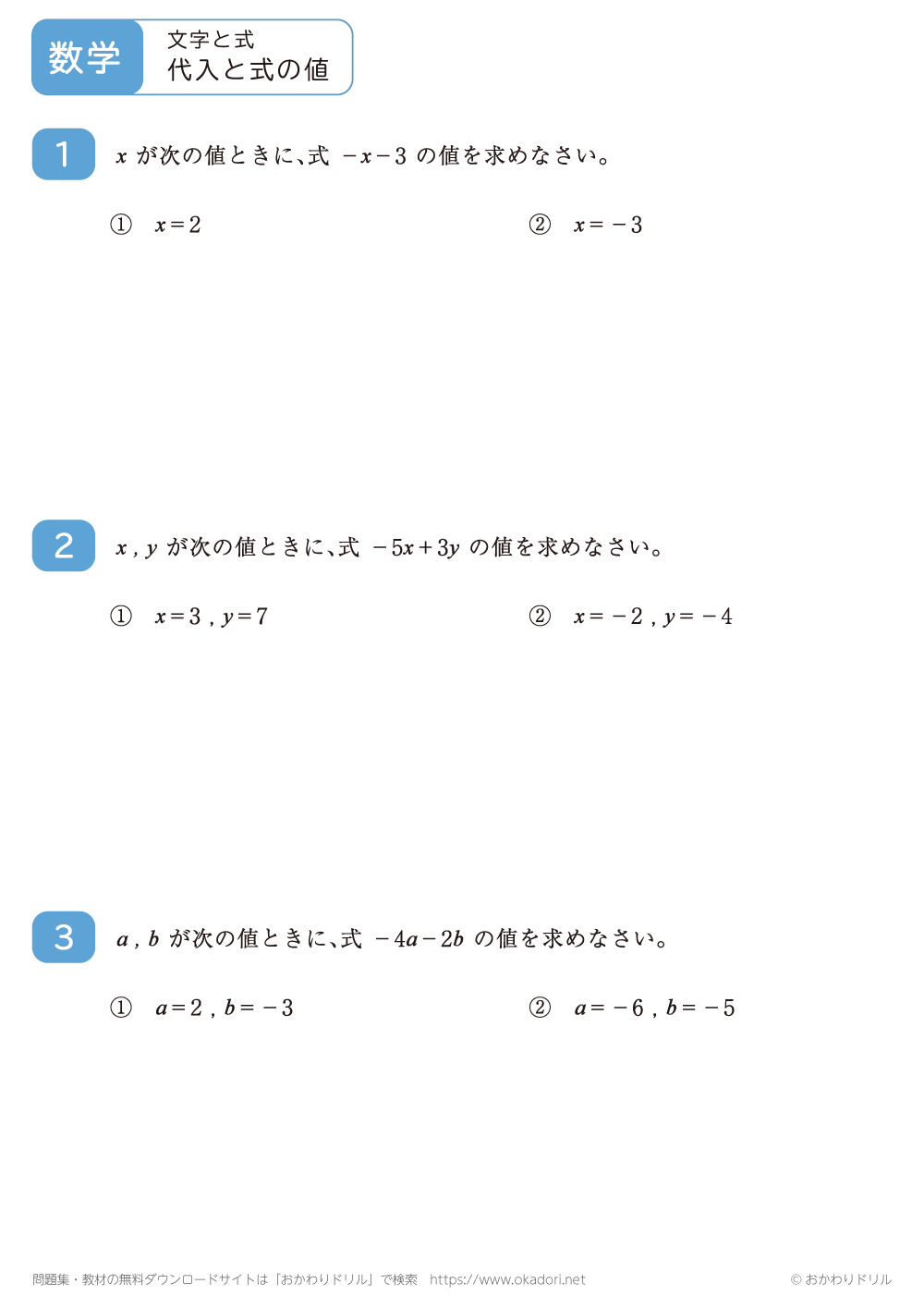 文字を使った式で、文字に数を代入して式の値を求める問題です。