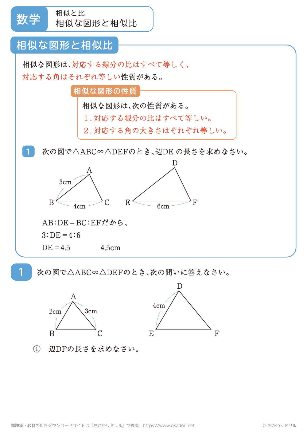 ・相似な図形は、対応する線分の比はすべて等しく、対応する角はそれぞれ等しい性質があります。