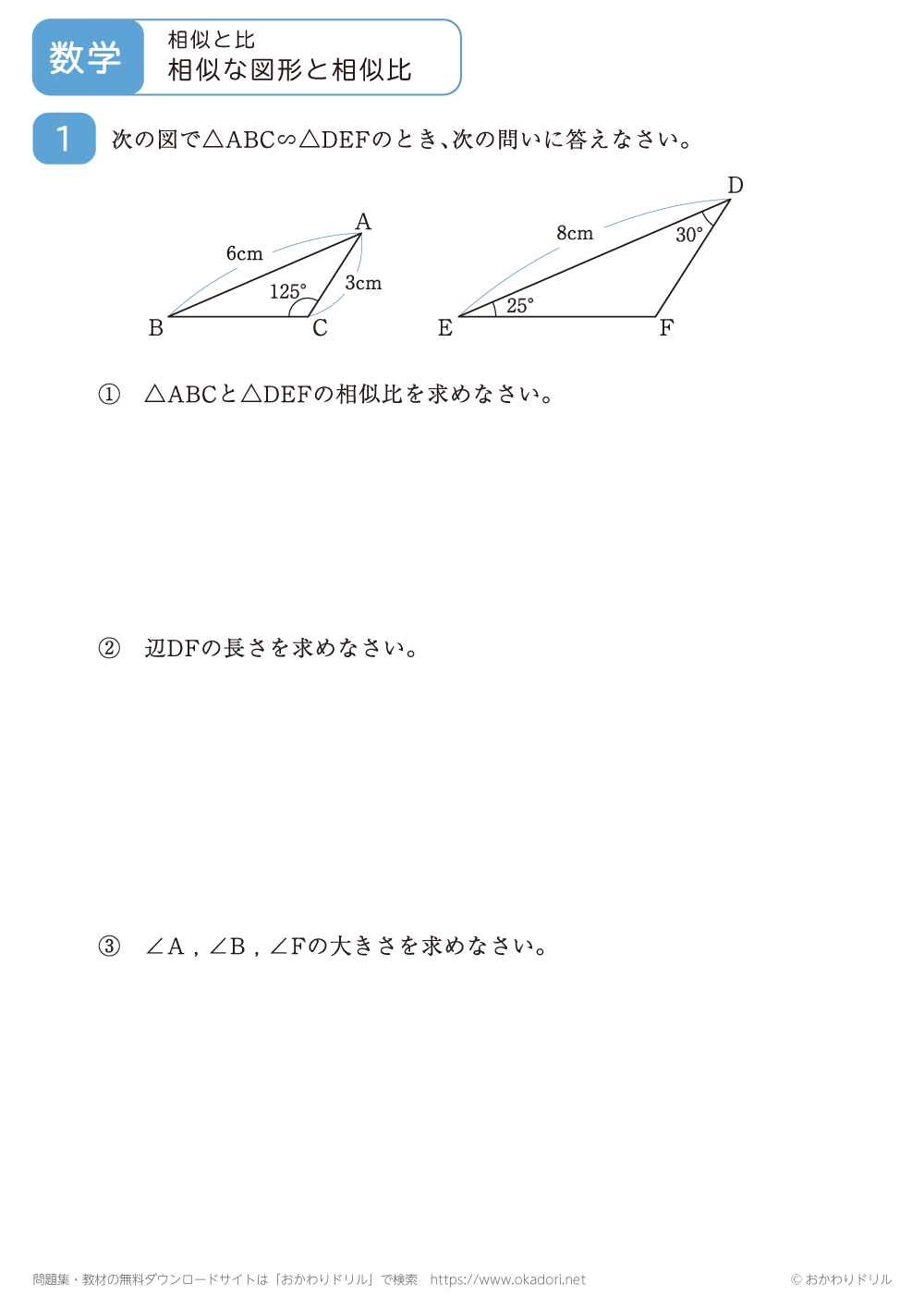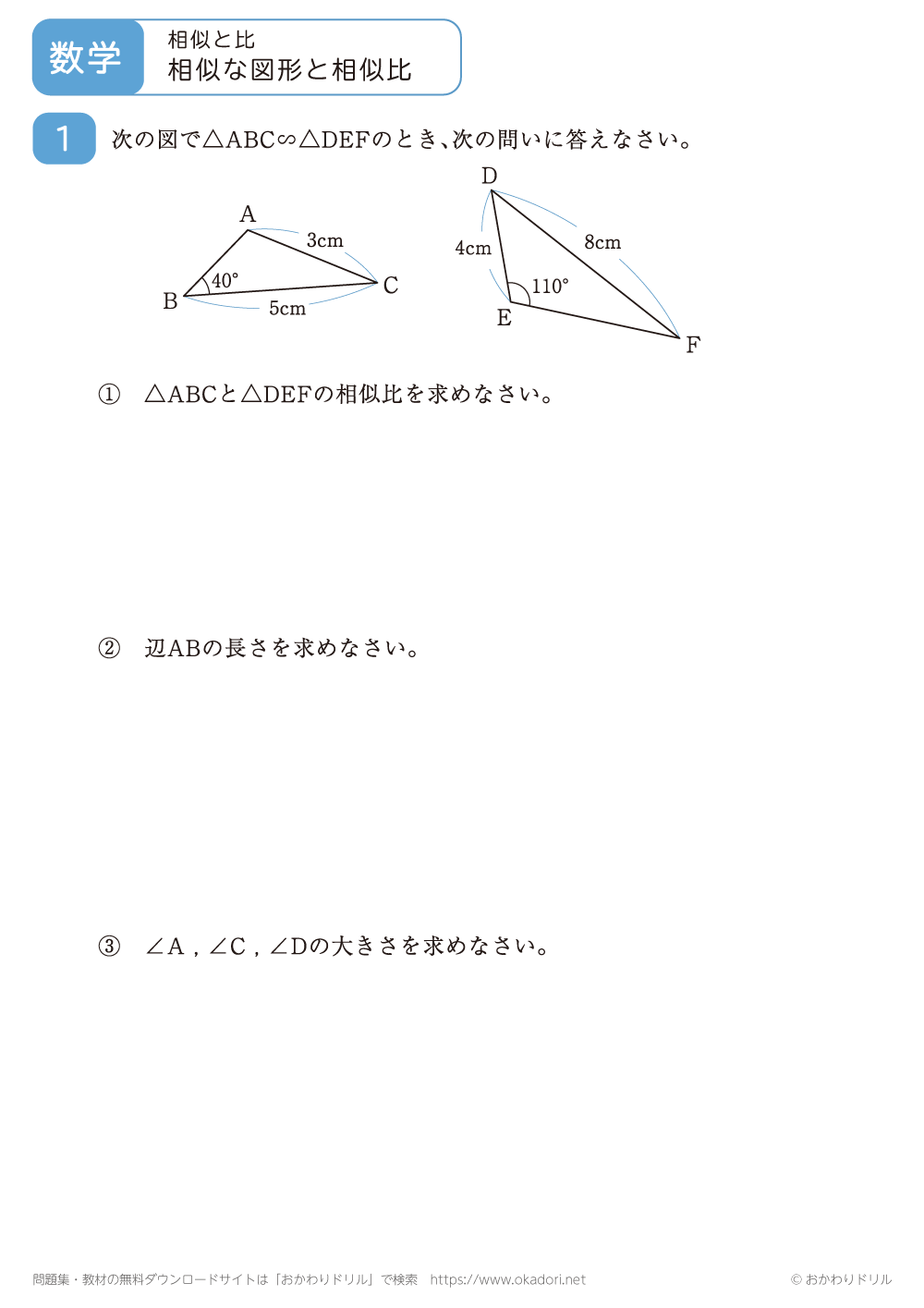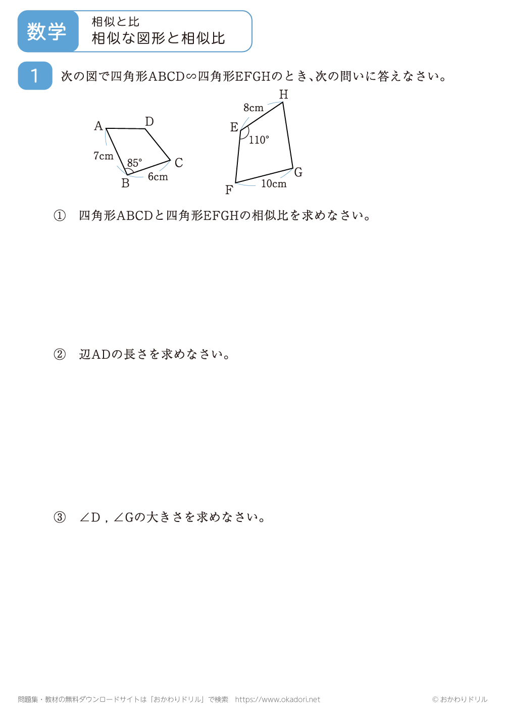 相似な図形と相似比の問題です。相似な図形の相似比や辺の長さ、角の大きさを求めてみましょう。