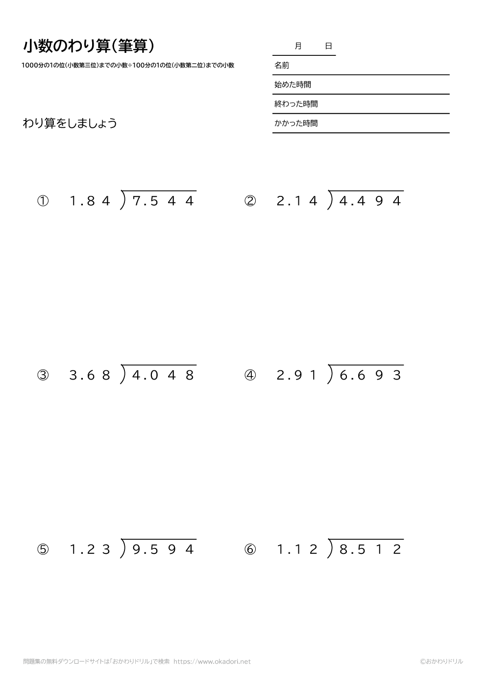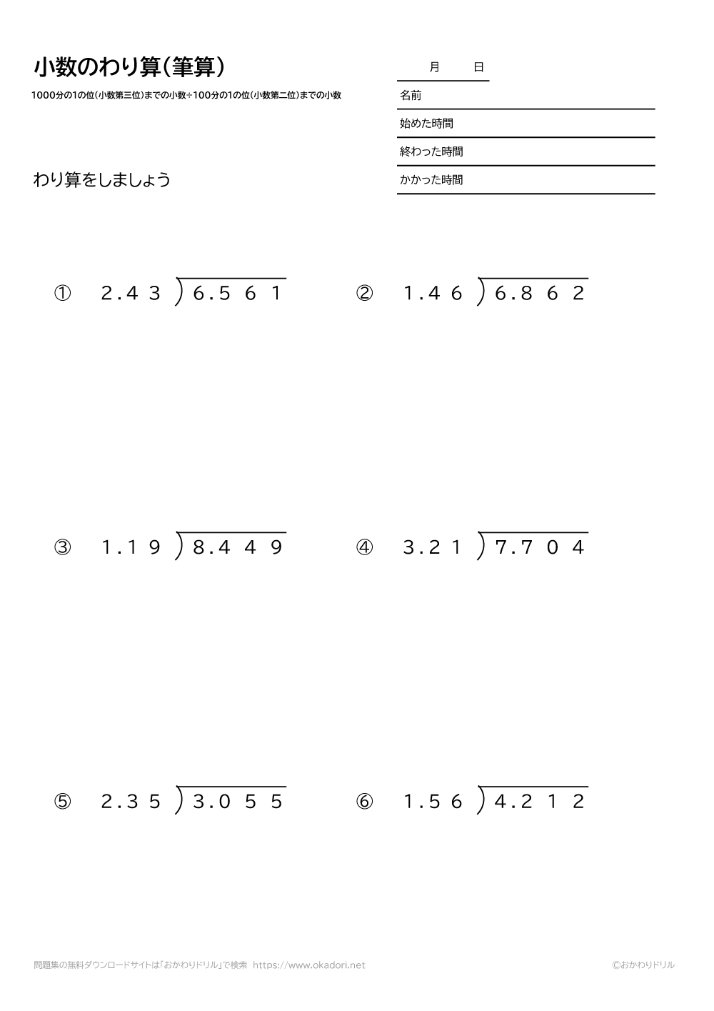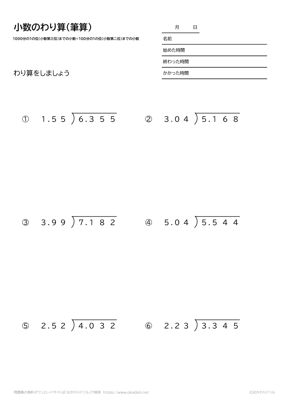 このページは、小学5年生が小数の割り算を学習するための「小数(1000分の1の位まで)÷小数(100分の1の位まで)の割り算の筆算」が学習できるページです。