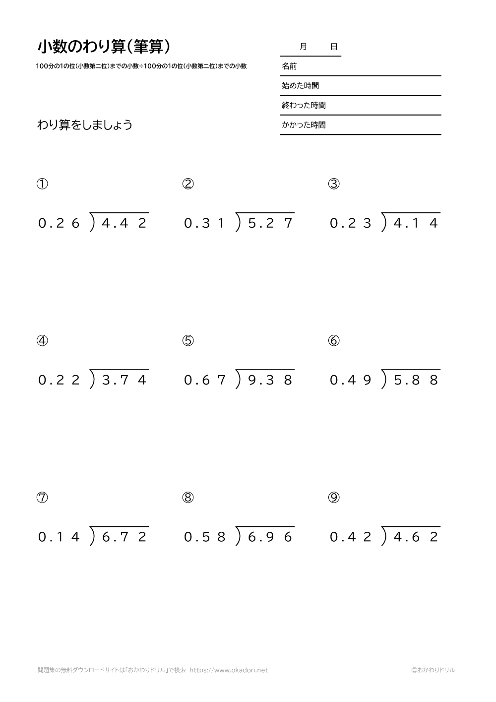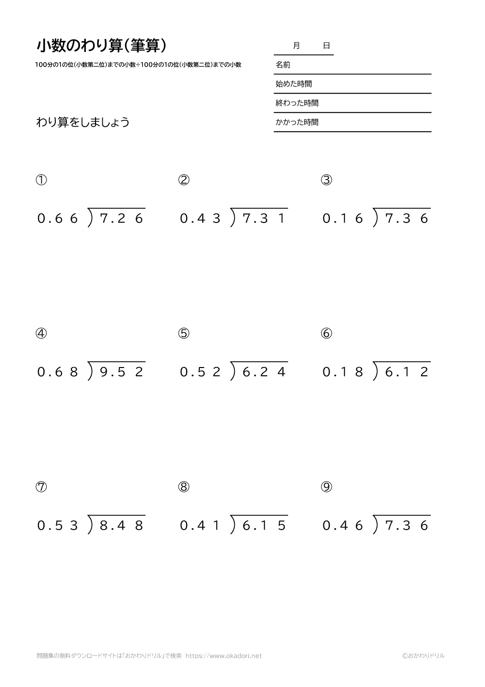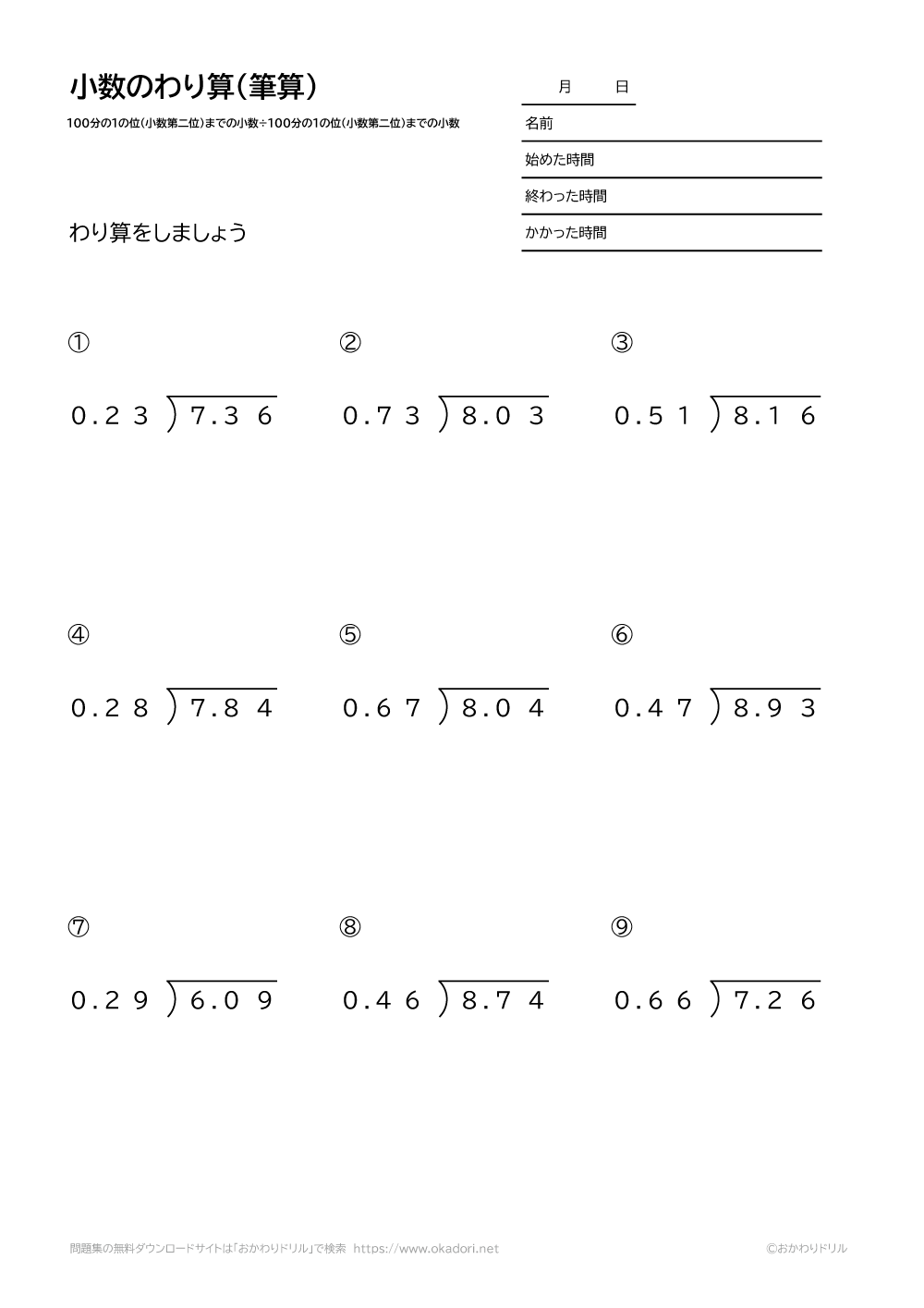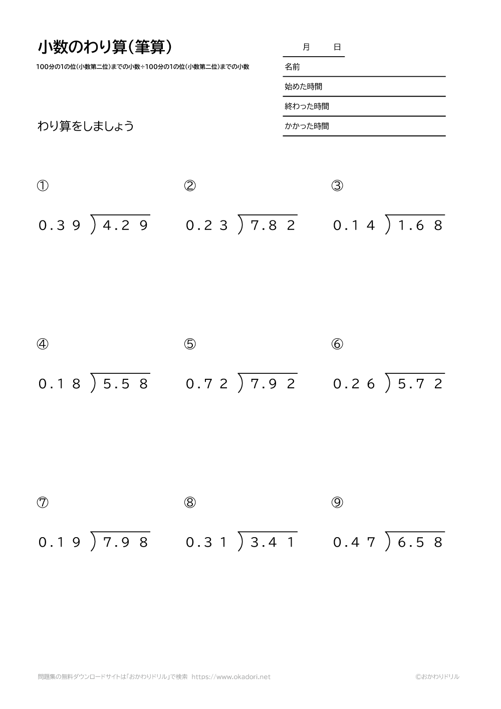 このページは、小学5年生が小数の割り算を学習するための「小数(100分の1の位まで)÷小数(100分の1の位まで)の割り算の筆算」が学習できるページです。