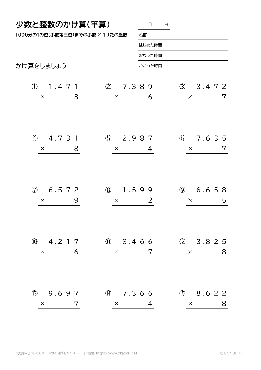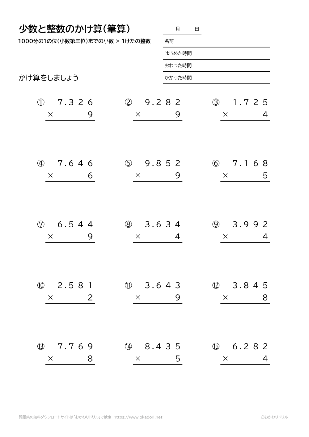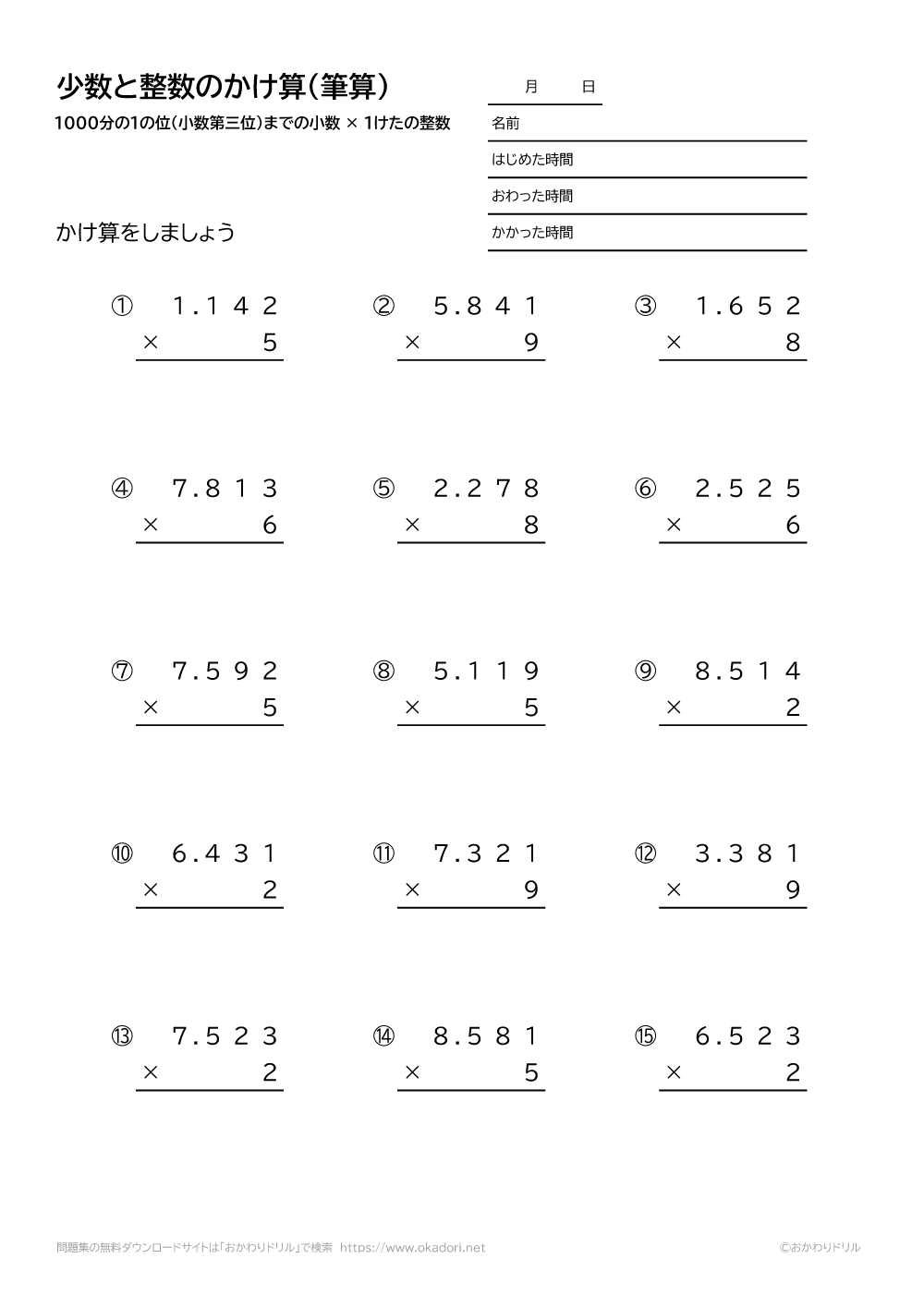 1000分の1の位(小数第三位)までの小数と、1桁の整数の掛け算を筆算で解きます。小数点を打つ位置に注意して解きましょう。