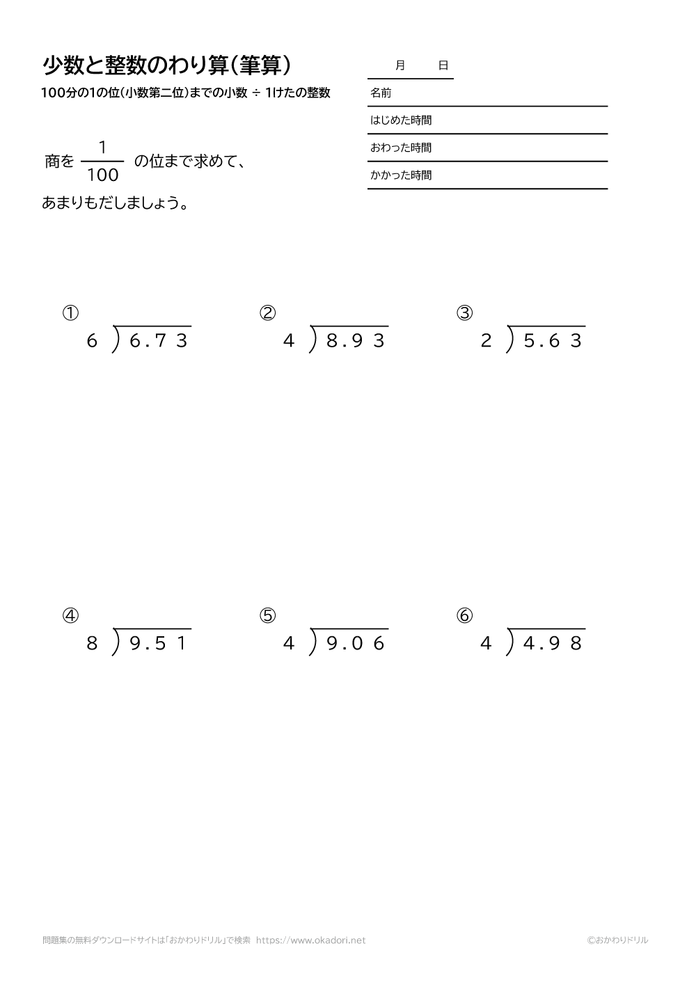 ・100分の1の位までの小数を、1桁の整数で割ります。