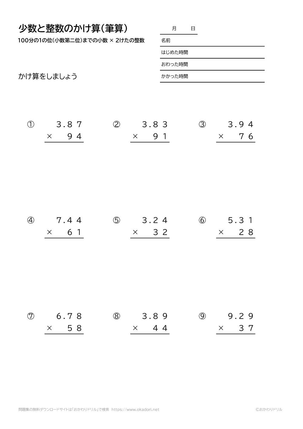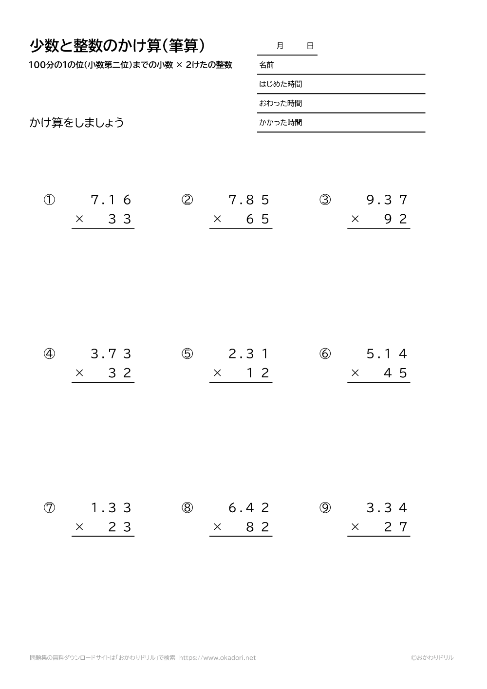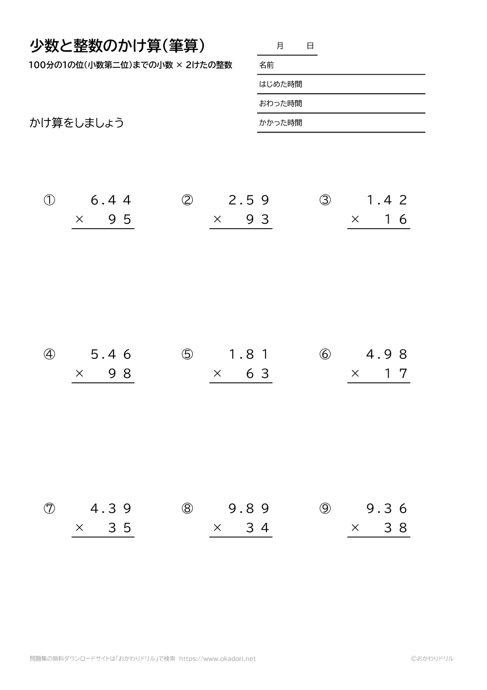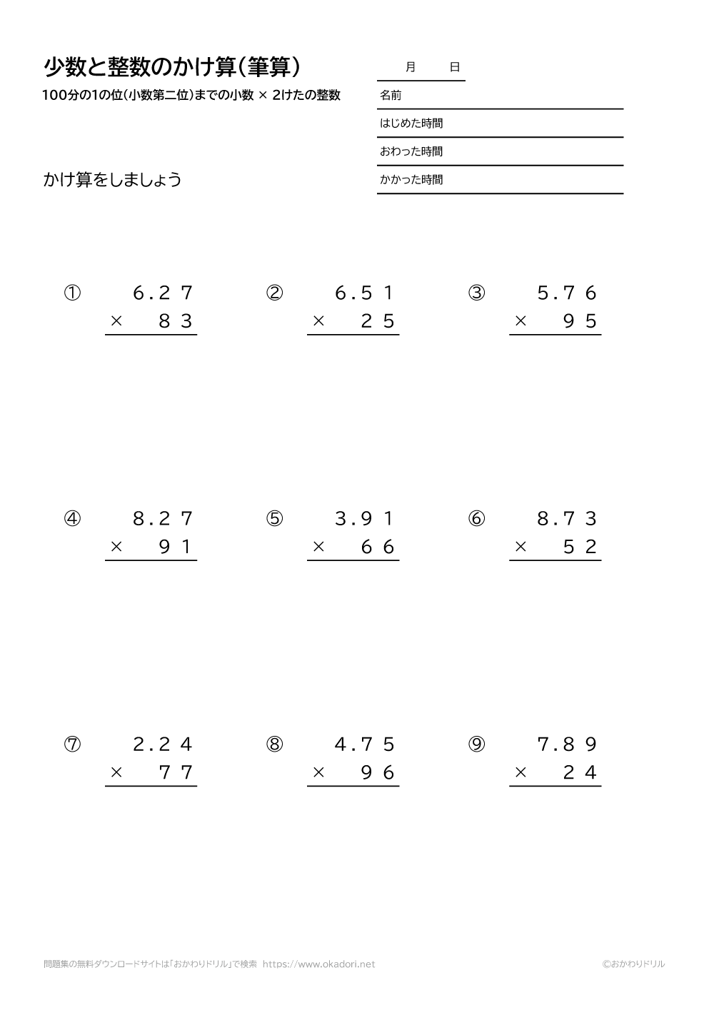 ・100分の1の位までの小数に、2桁の整数を掛ける問題です。