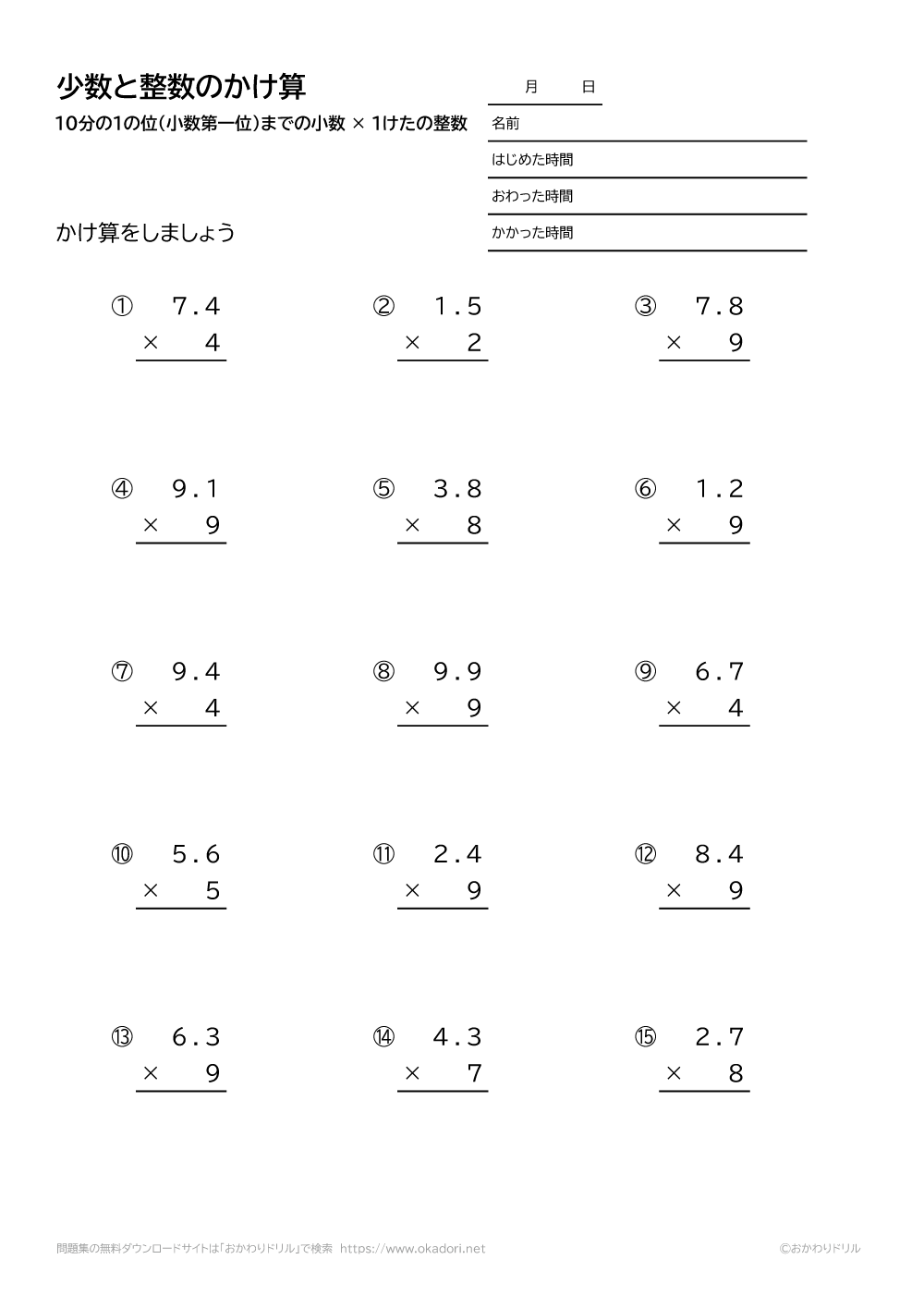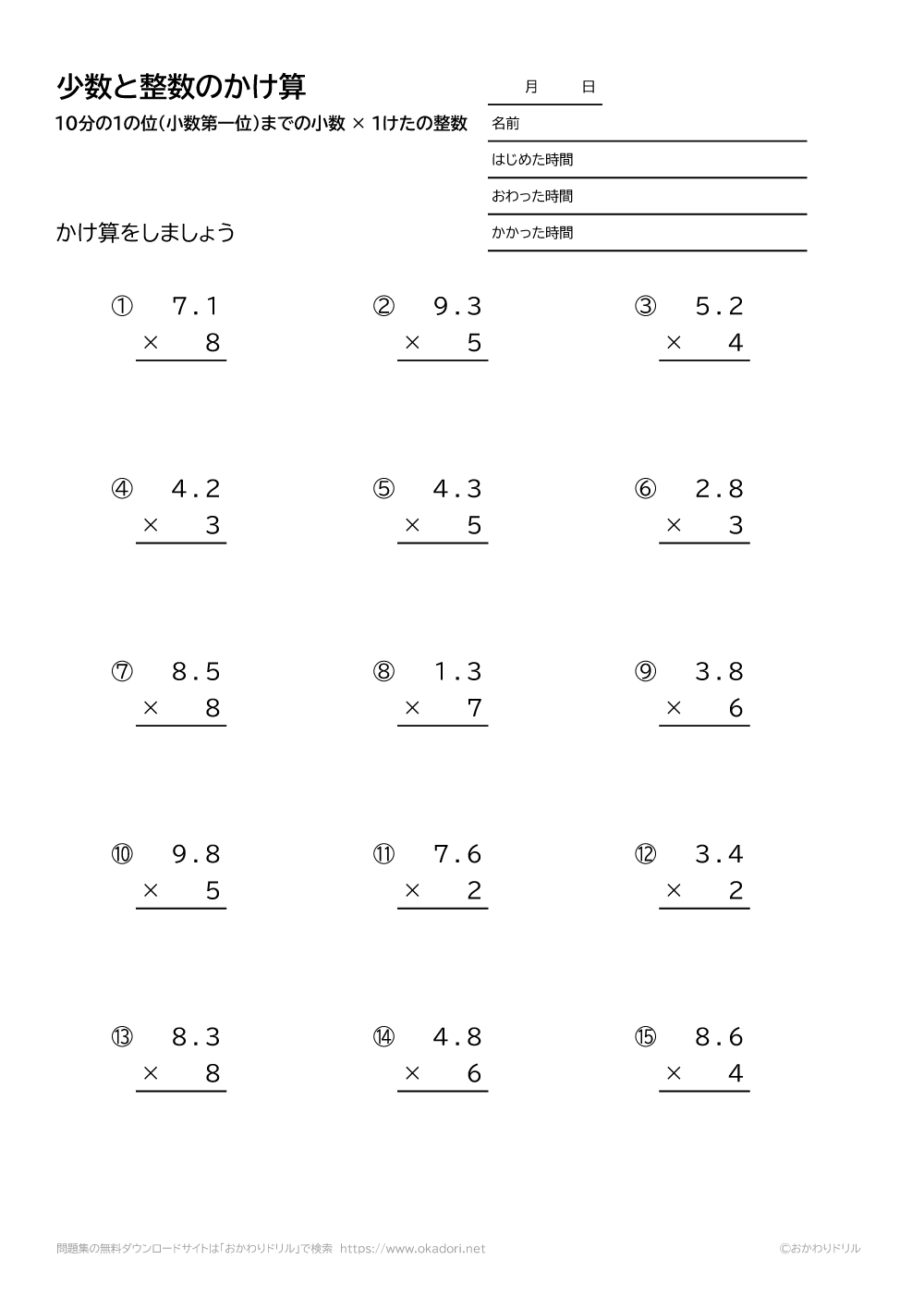10分の1の位(小数第一位)までの小数と、1桁の整数の掛け算を筆算で解く問題です。小数点に注意して筆算を解きましょう。