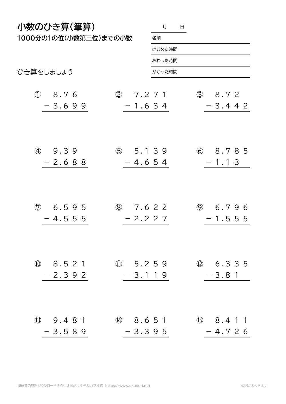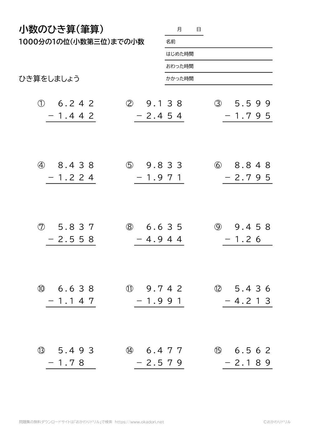 「小数(1000分の1の位まで)の引き算の筆算」の学習プリントはこちら