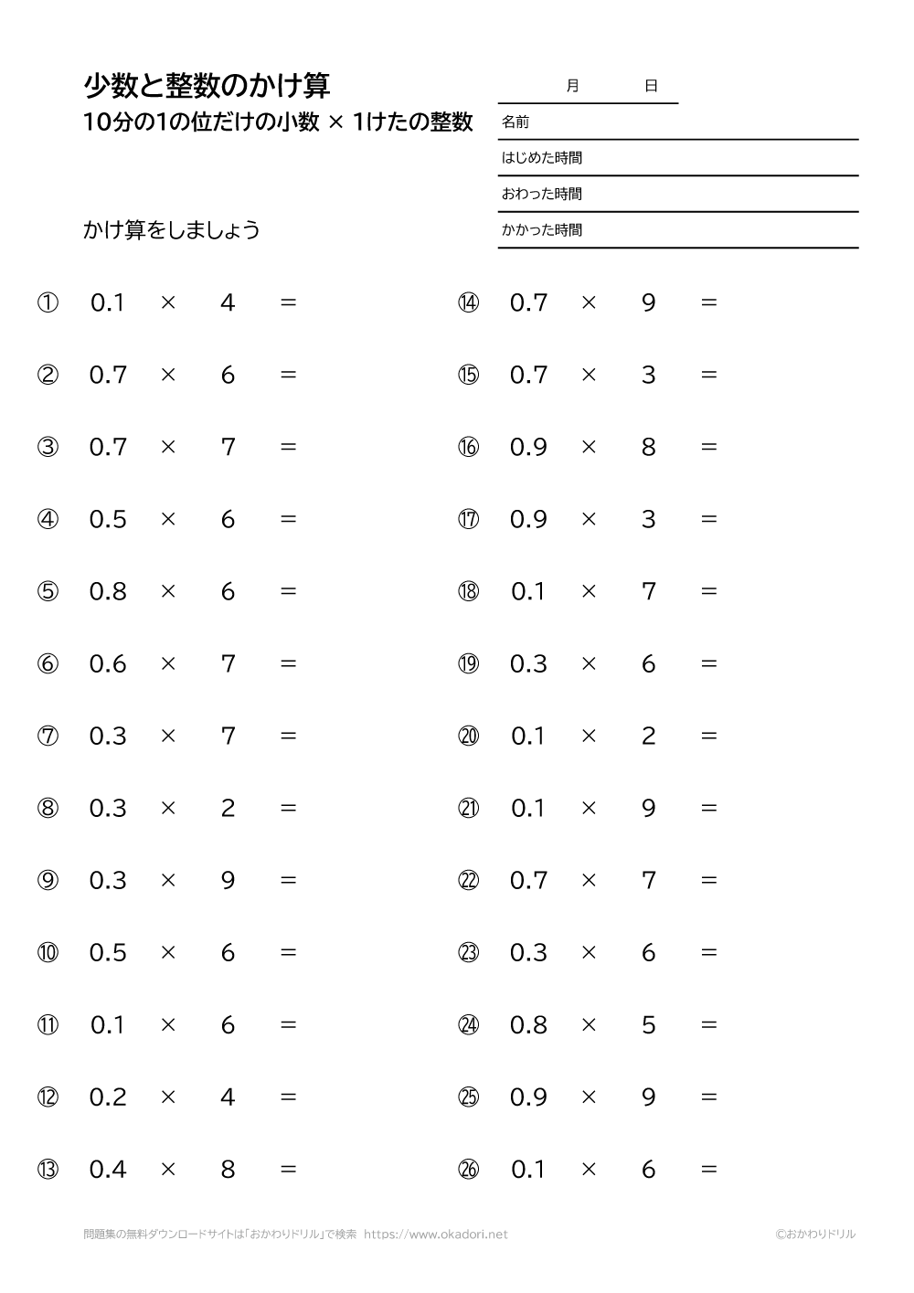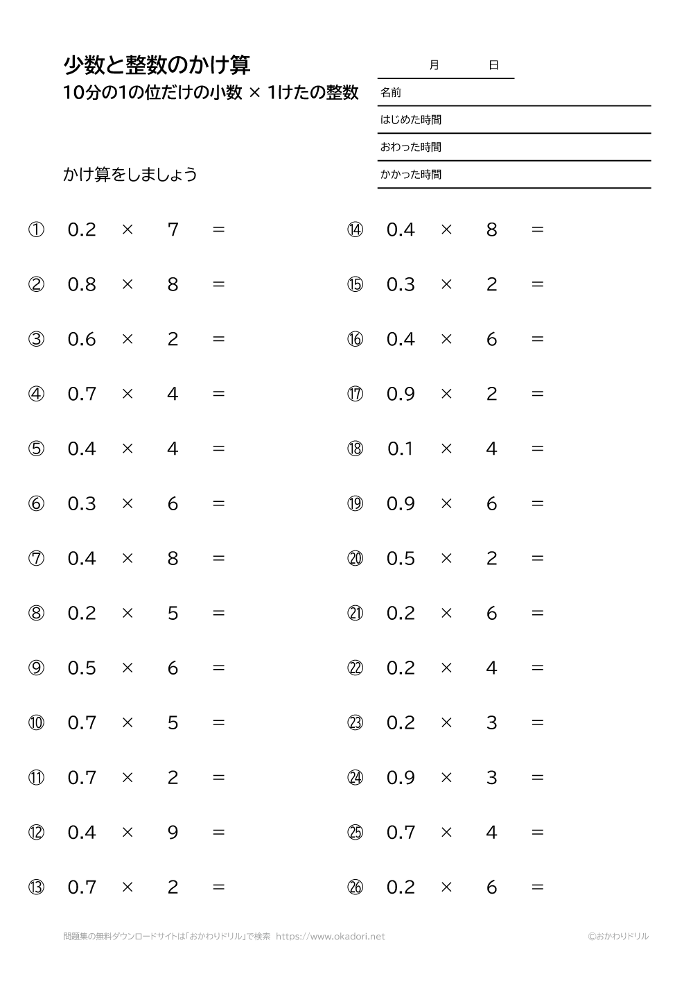「小数(10分の1の位だけ)×1桁の整数の掛け算」の学習プリントはこちら