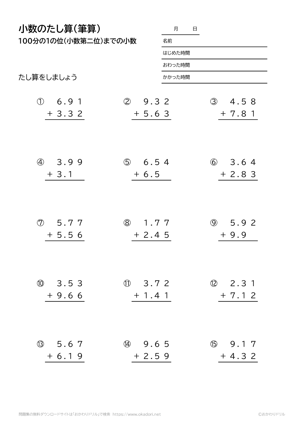 このページは、小学4年生が小数の足し算の筆算を学習するための「小数(100分の1の位まで)の足し算」が学習できるページです。