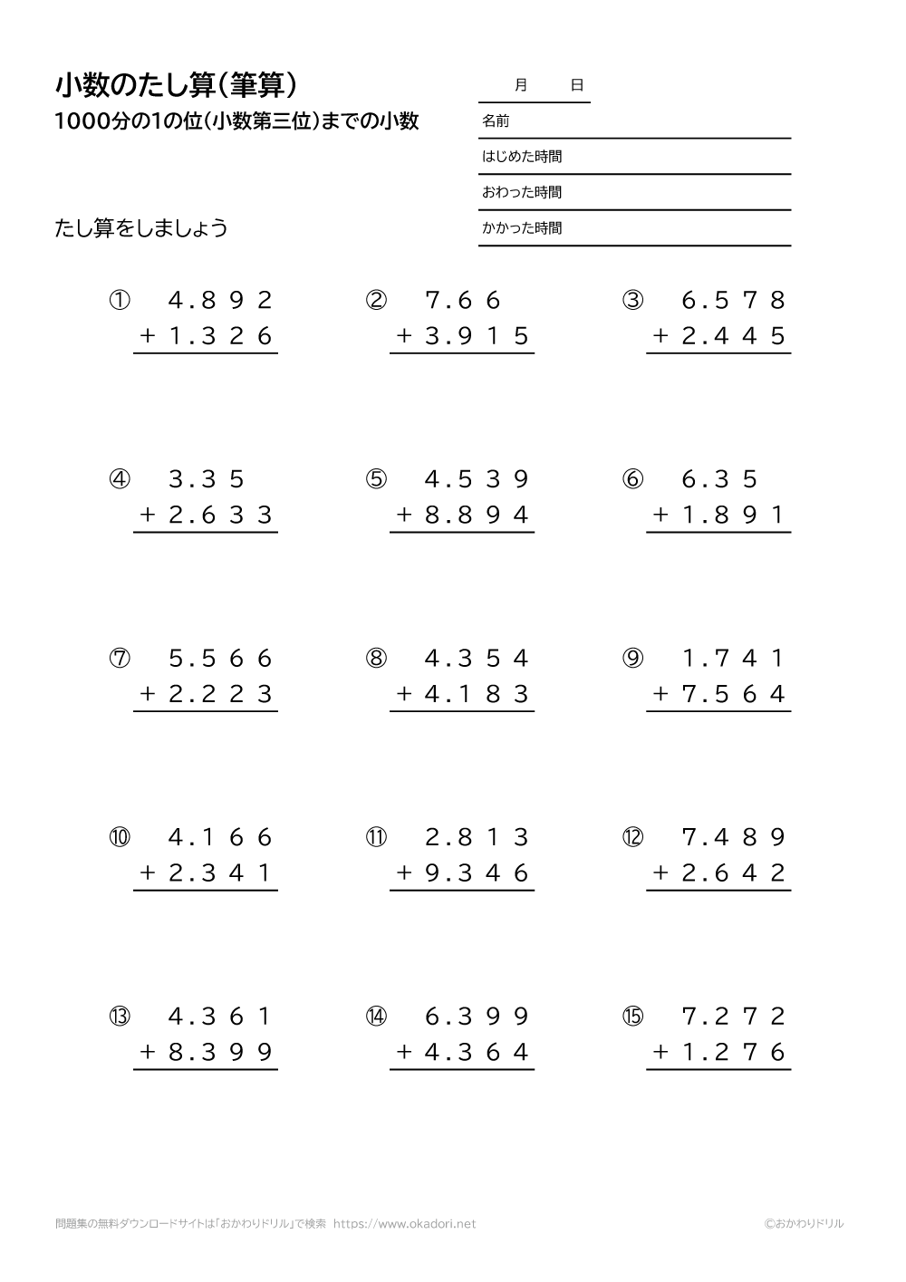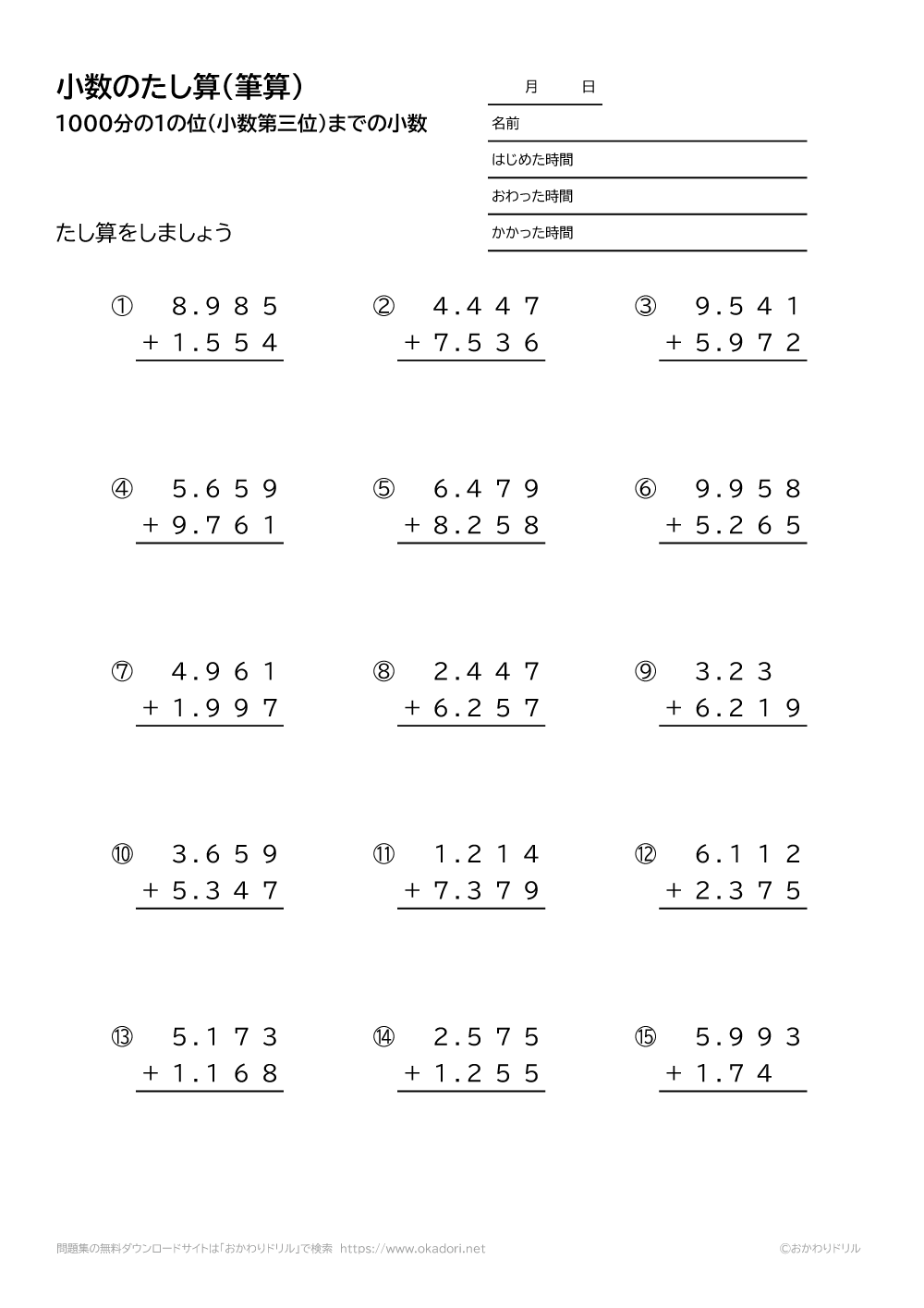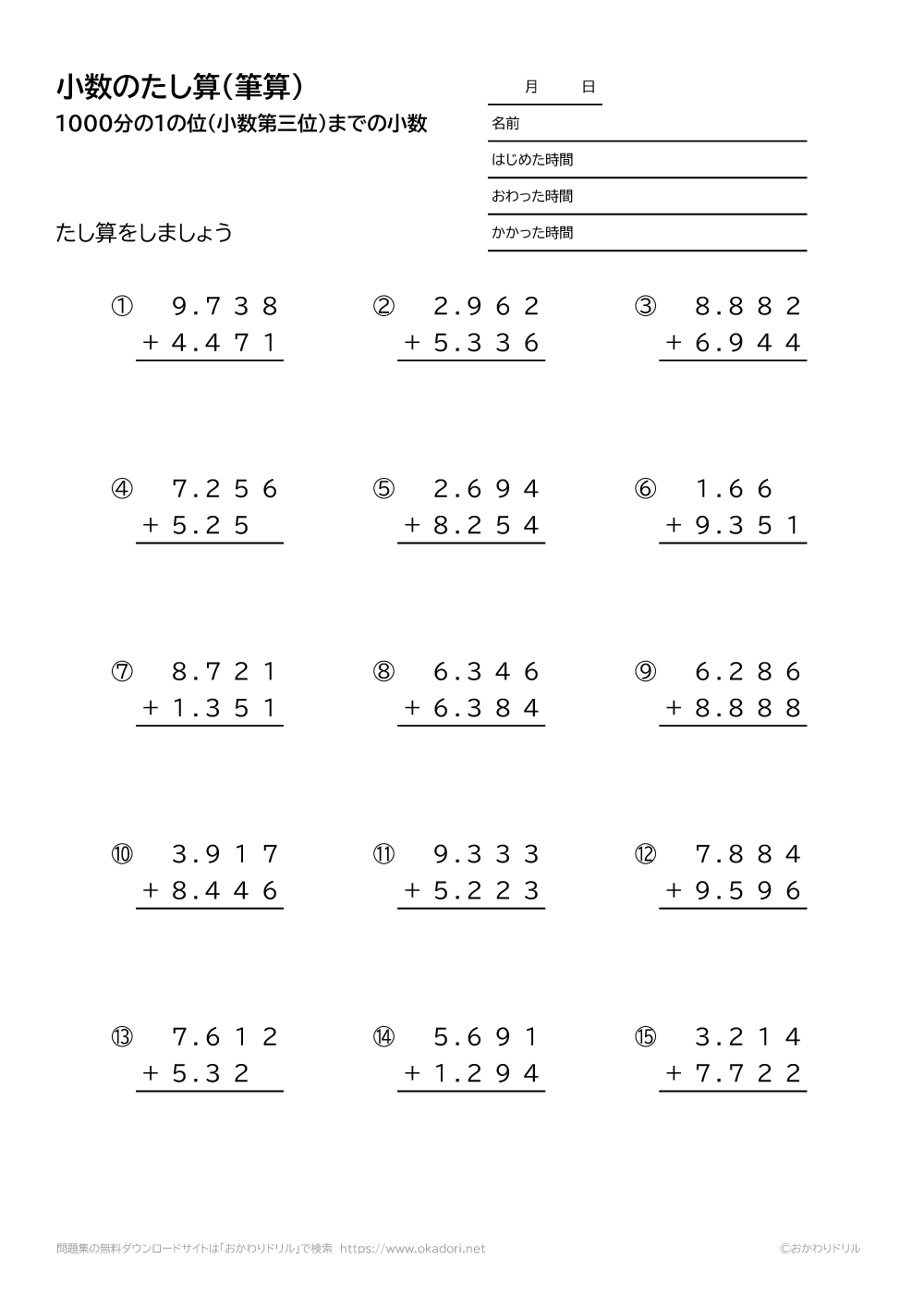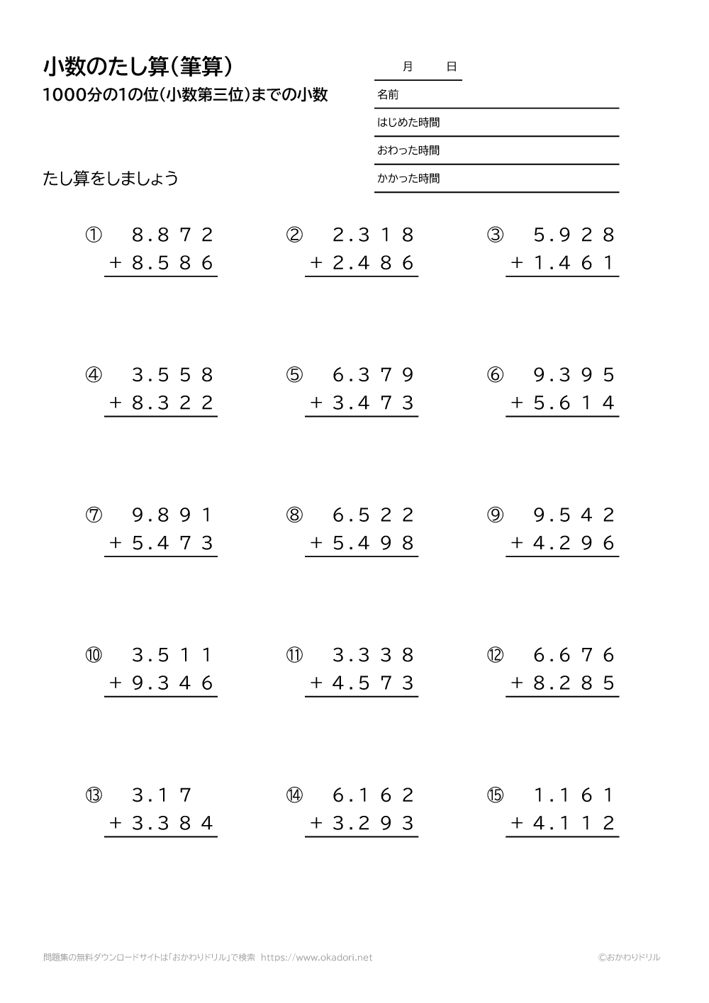 「小数(1000分の1の位まで)の足し算の筆算」の学習プリントはこちら