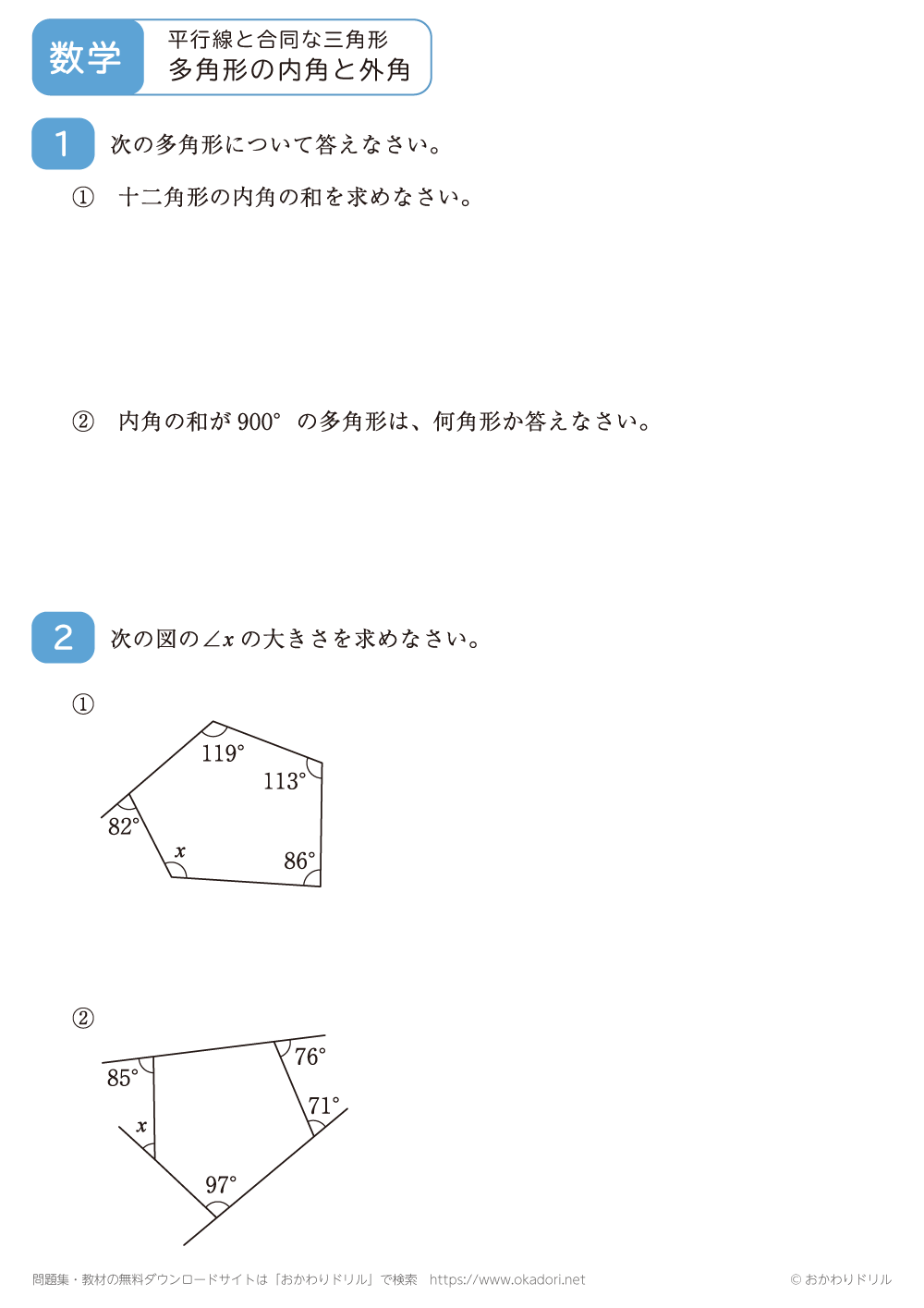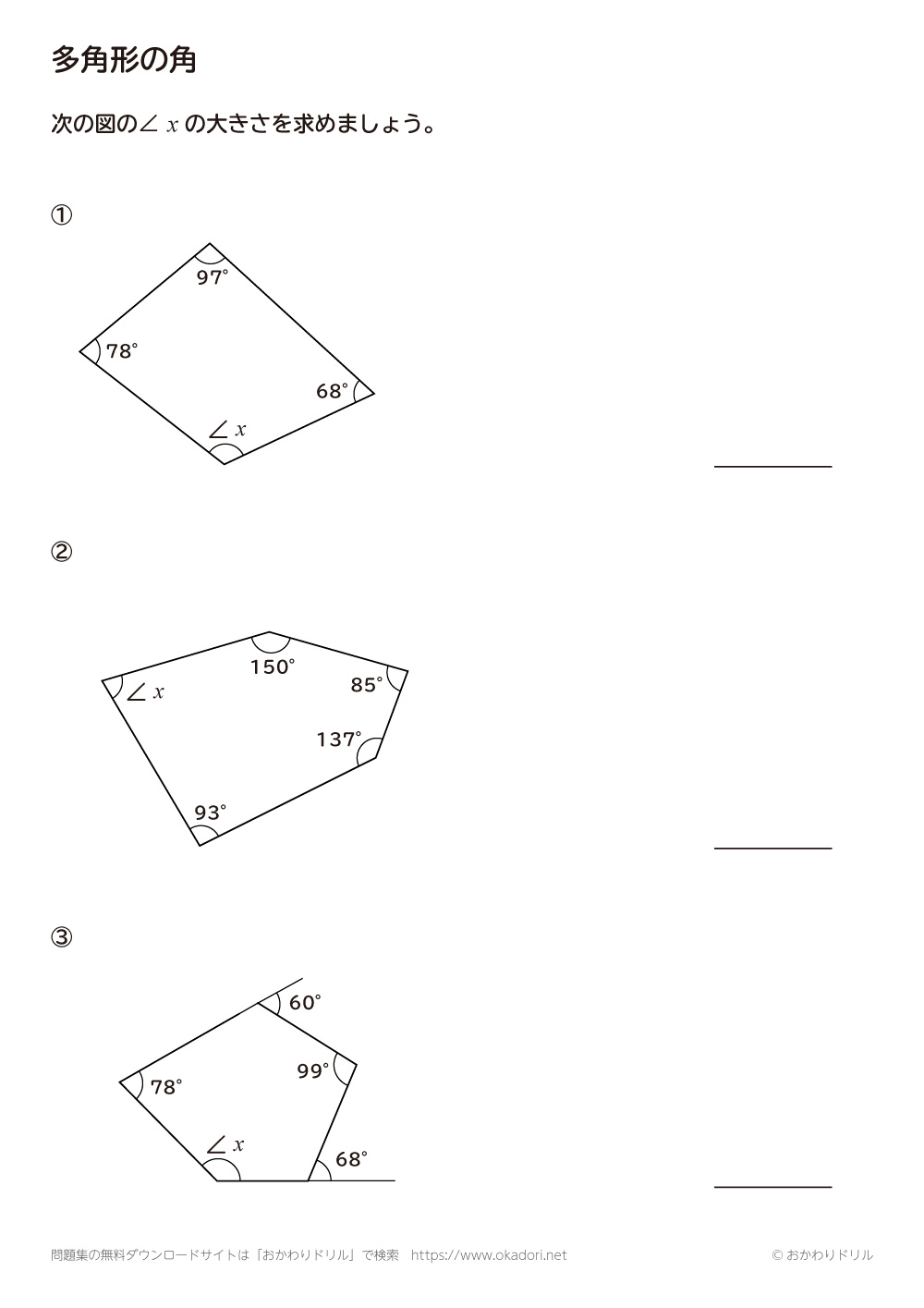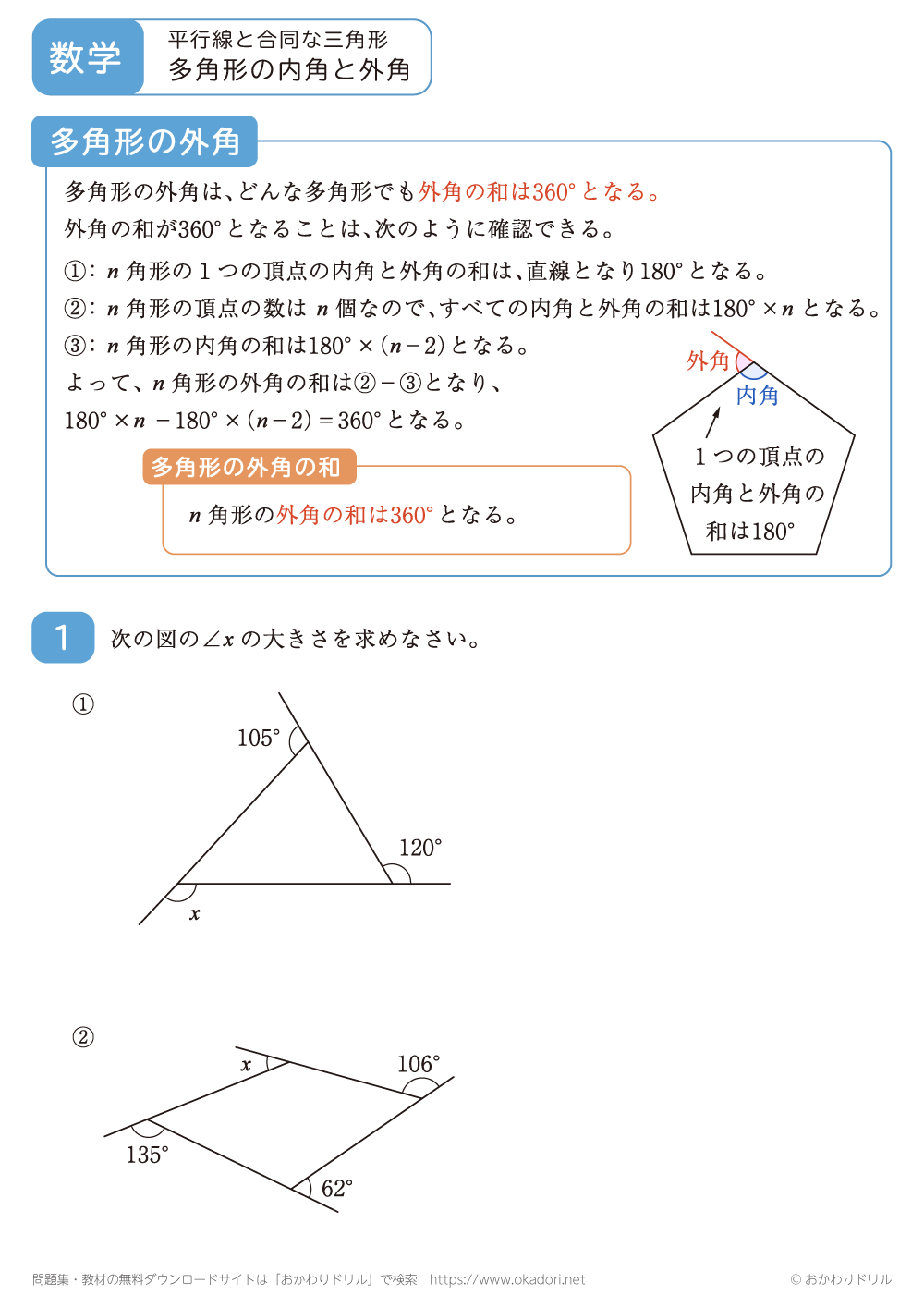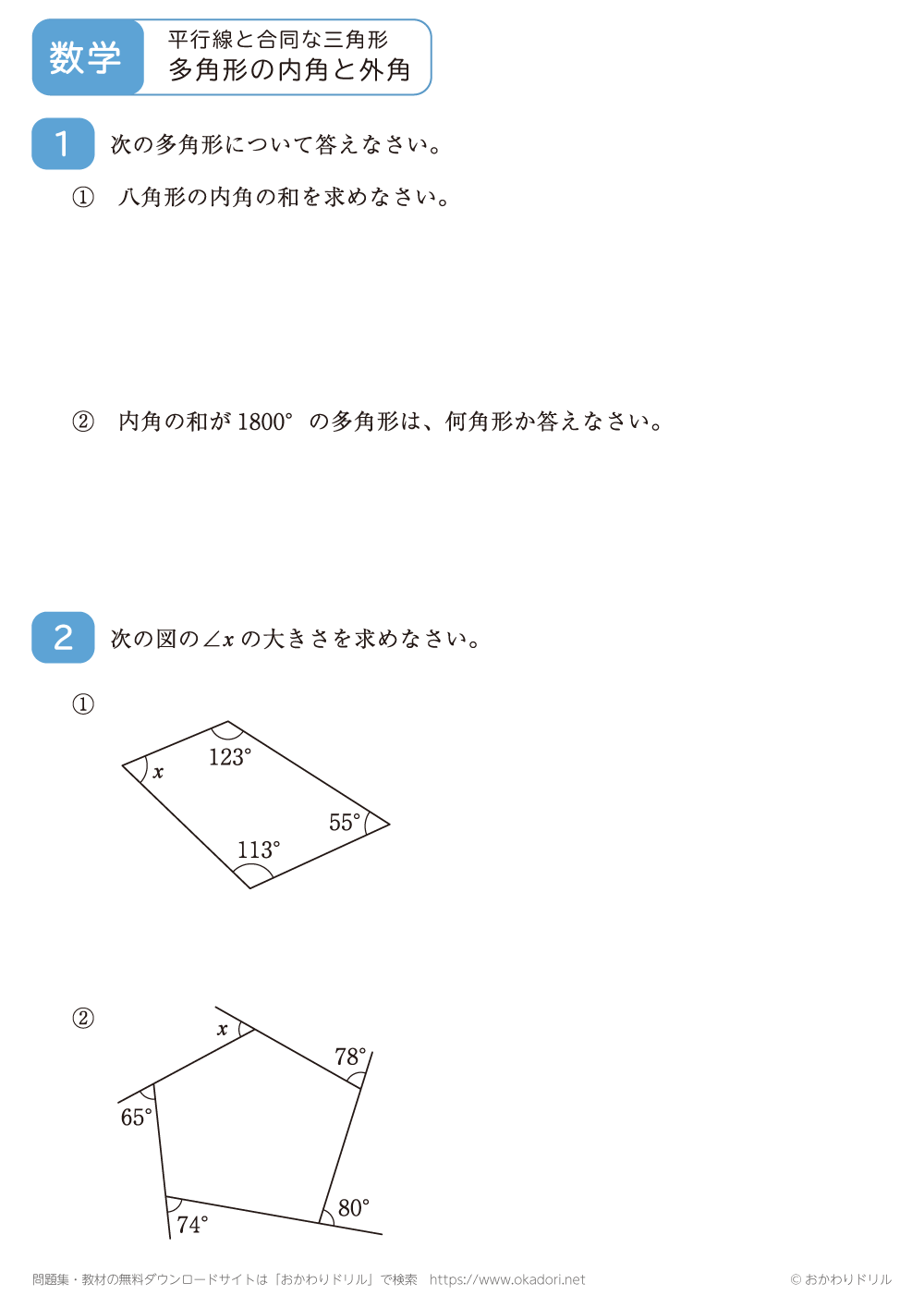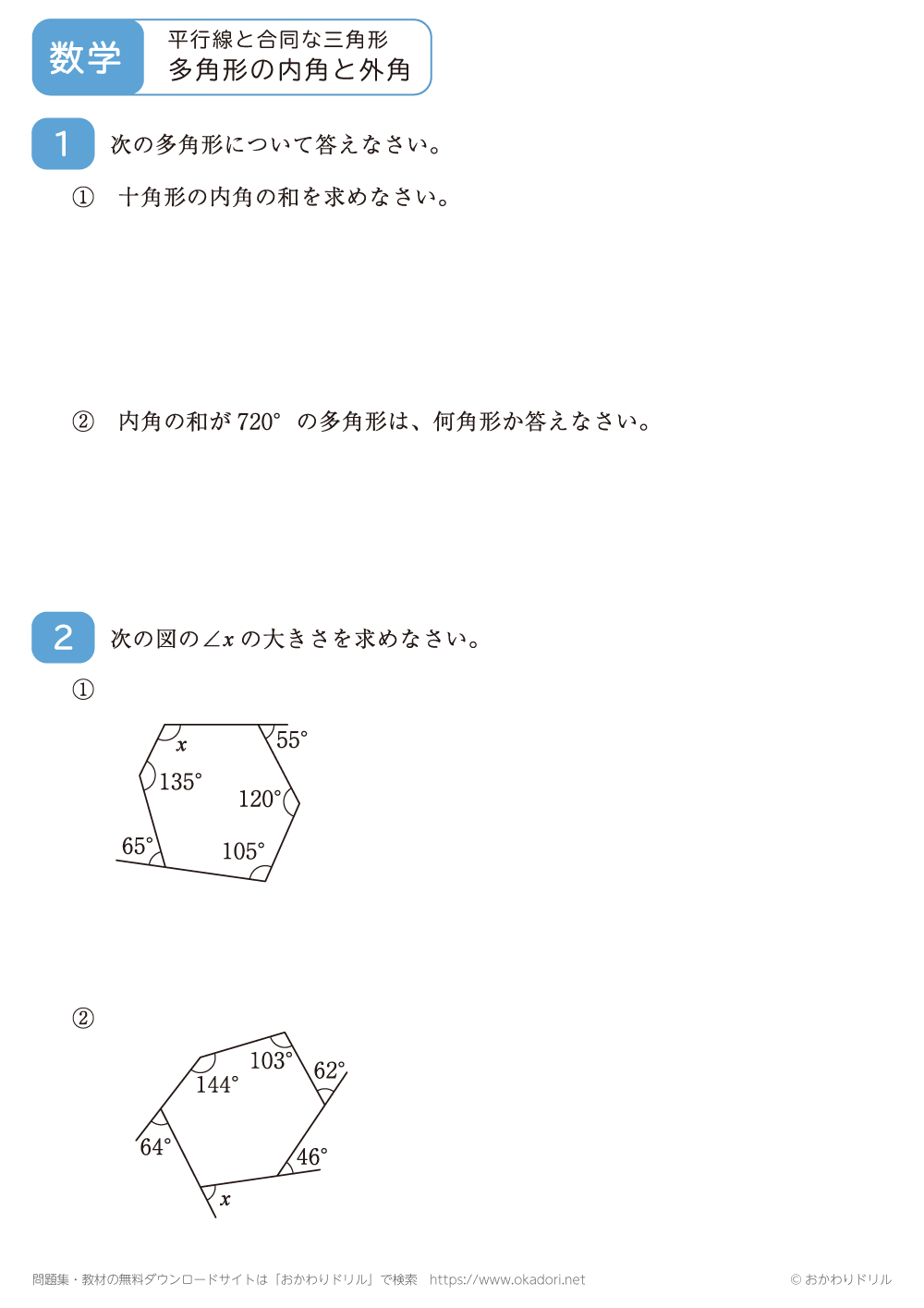 多角形の内角や外角の角の大きさを求める問題です。n角形の内角の和は180°×(nー2)となることや、外角の和は360°となる性質を使って問題を解きましょう。