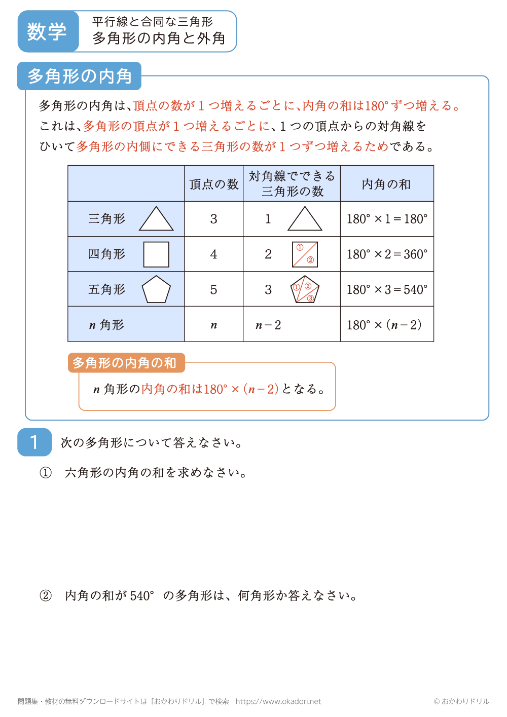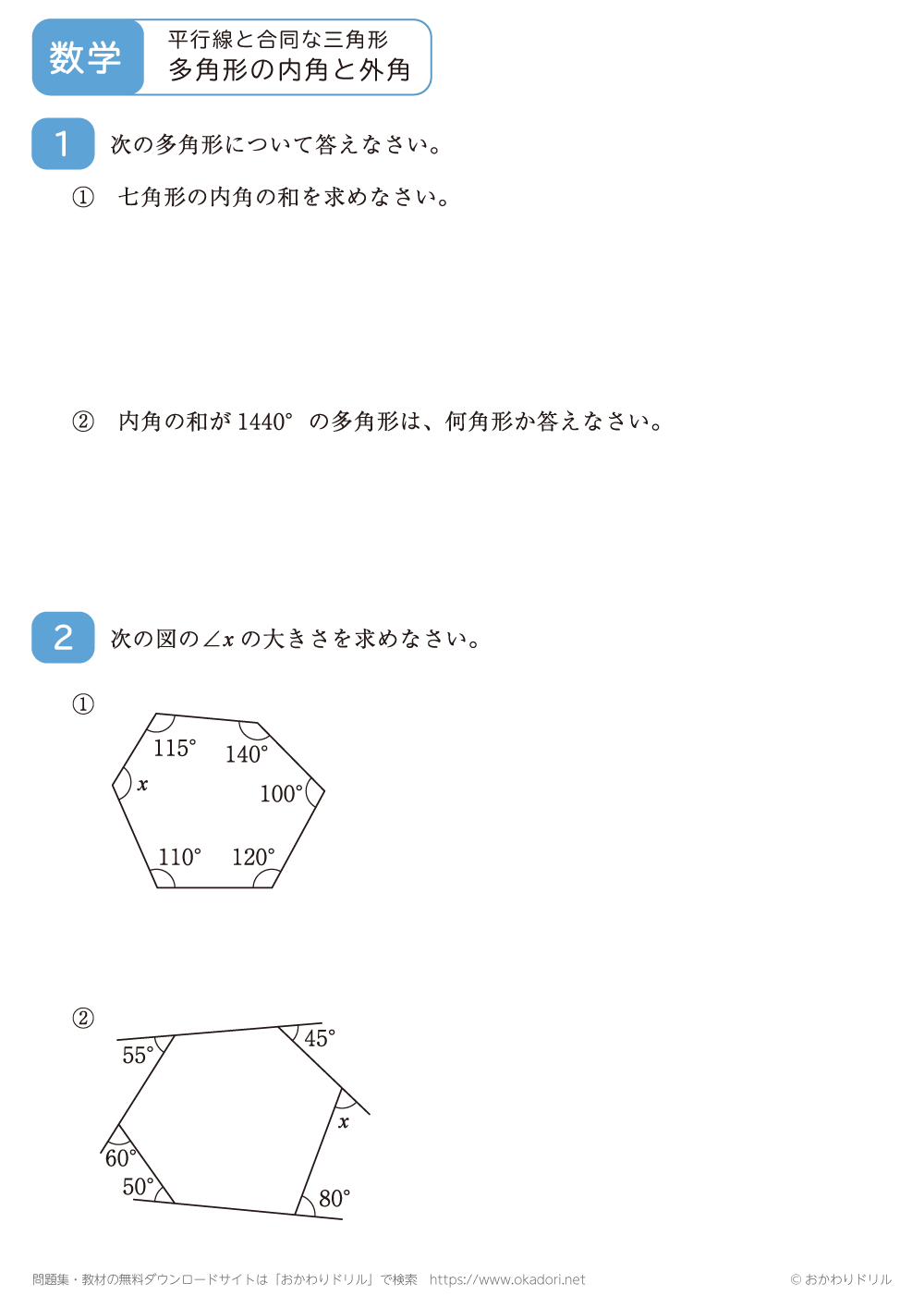 このページは、中学2年生で習う「多角形の内角と外角」が学習できるページです。