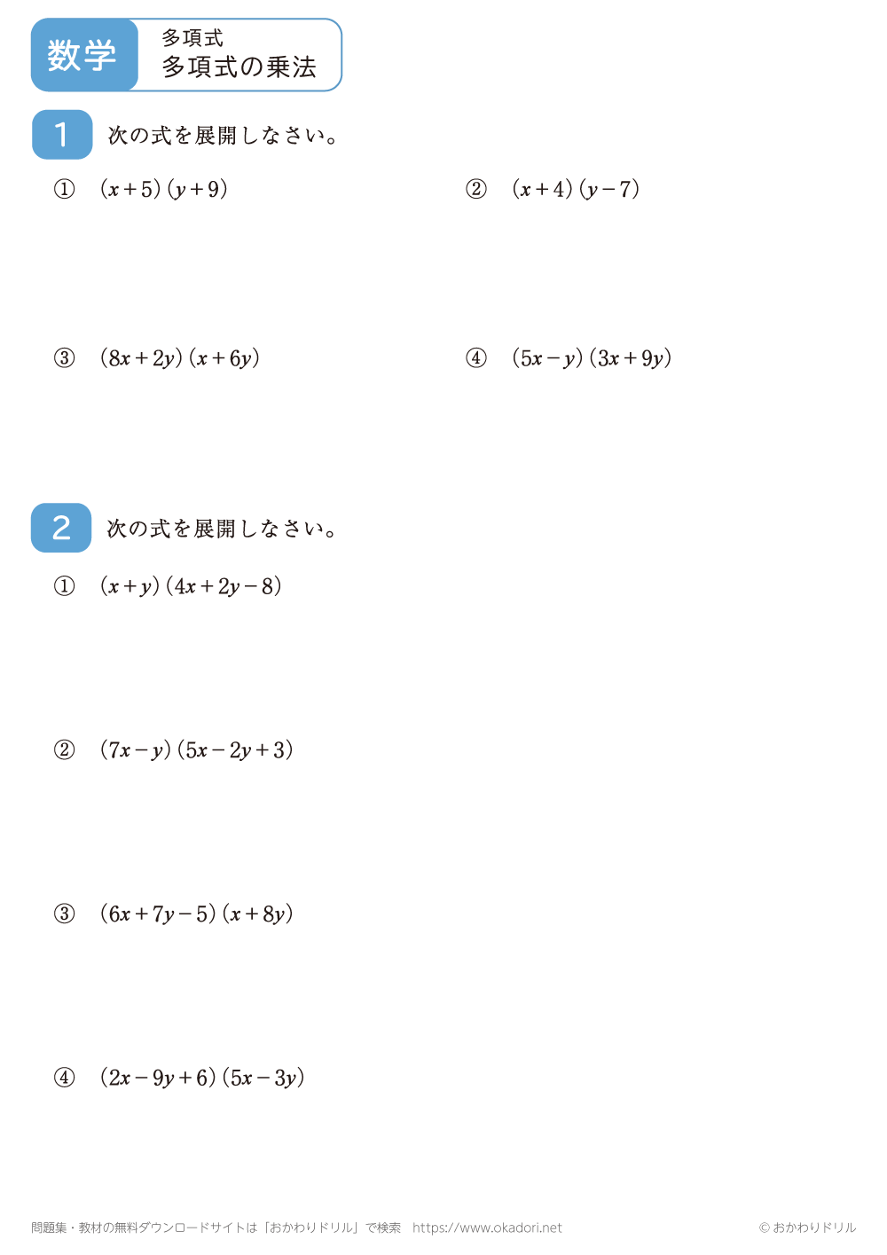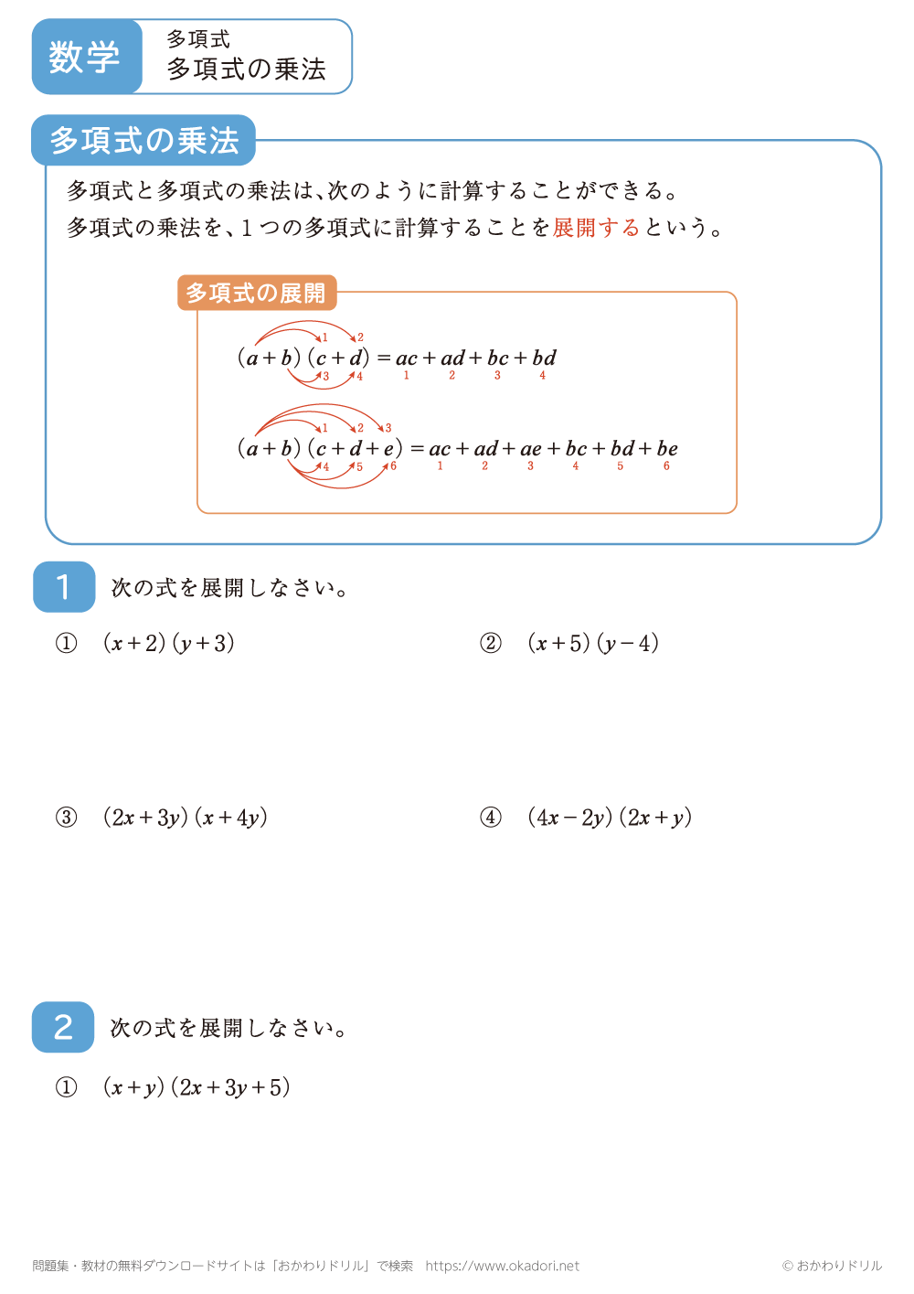 ・多項式と多項式の乗法を、1つの多項式に計算することを展開するといいます。