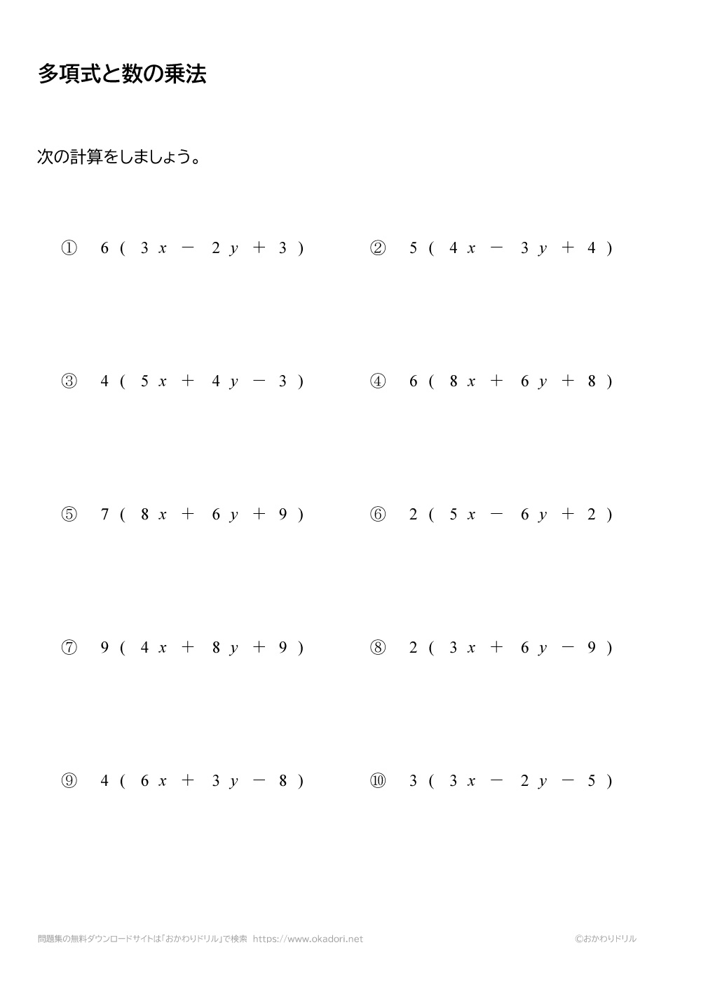 多項式と数との乗法の問題です。多項式と数とのかけ算では、分配法則を使って計算しましょう。