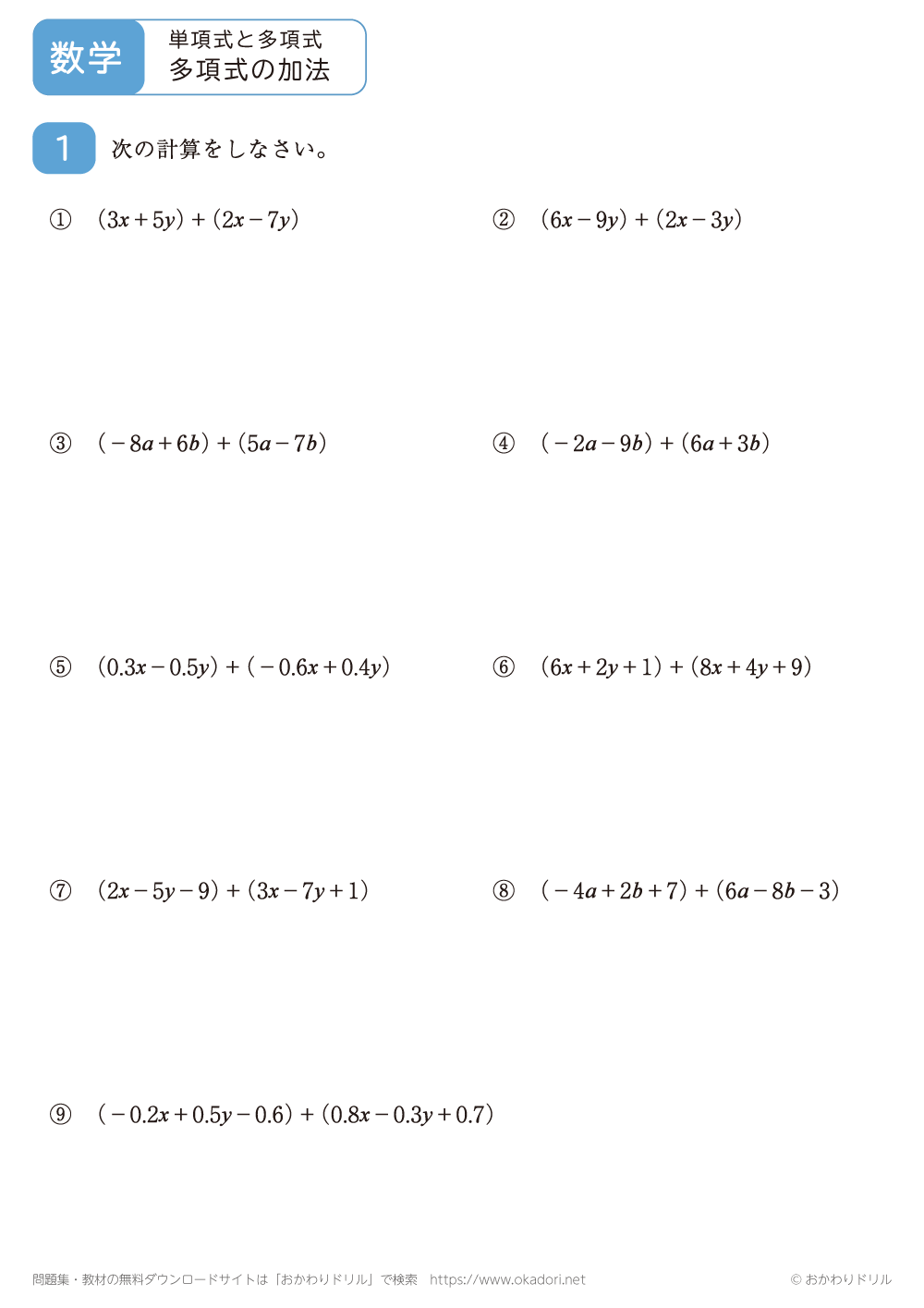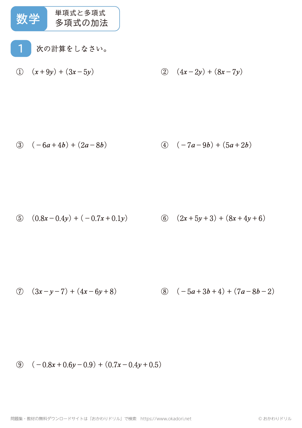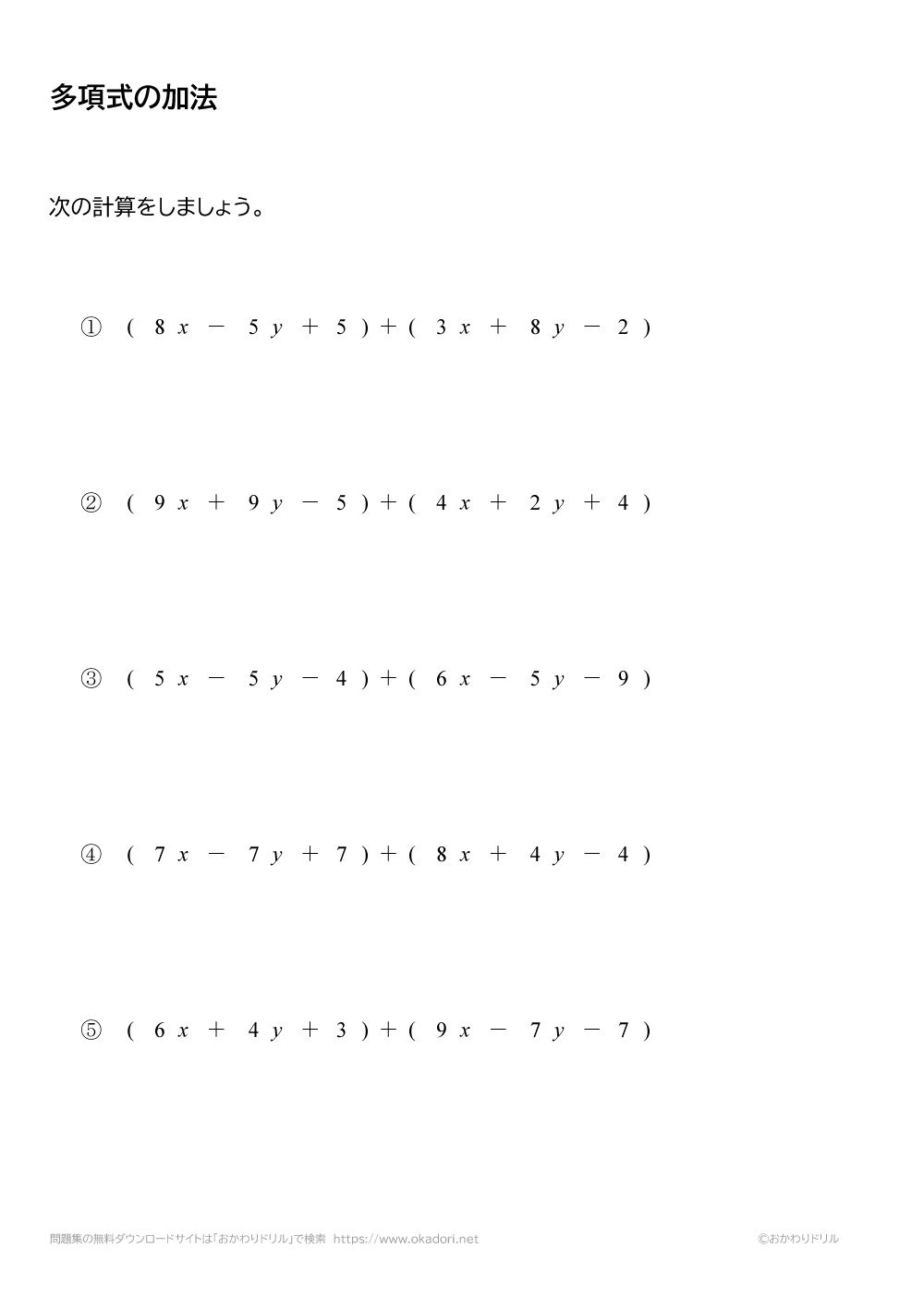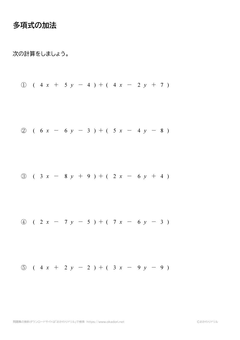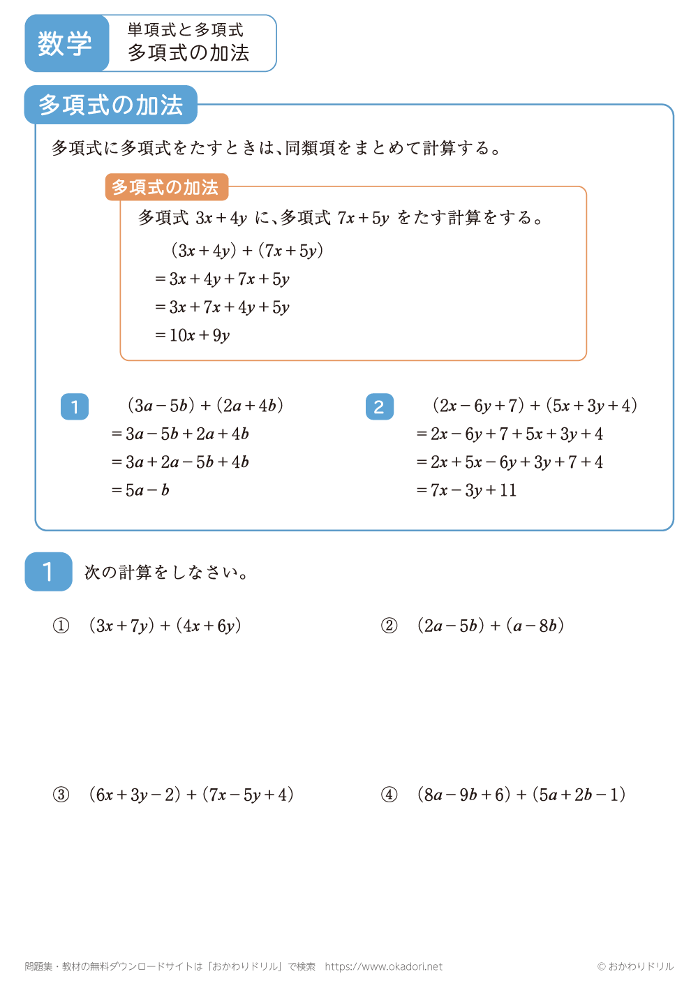 このページは、中学2年生で習う「多項式の加法」が学習できるページです。
