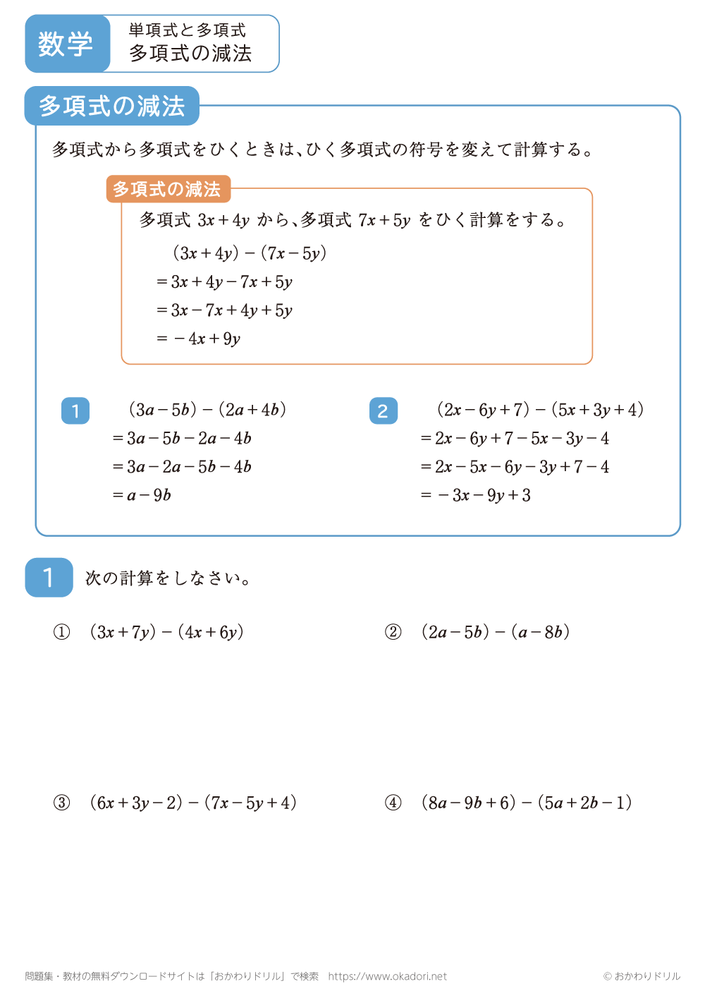 このページは、中学2年生で習う「多項式の減法」が学習できるページです。 この問題 ...