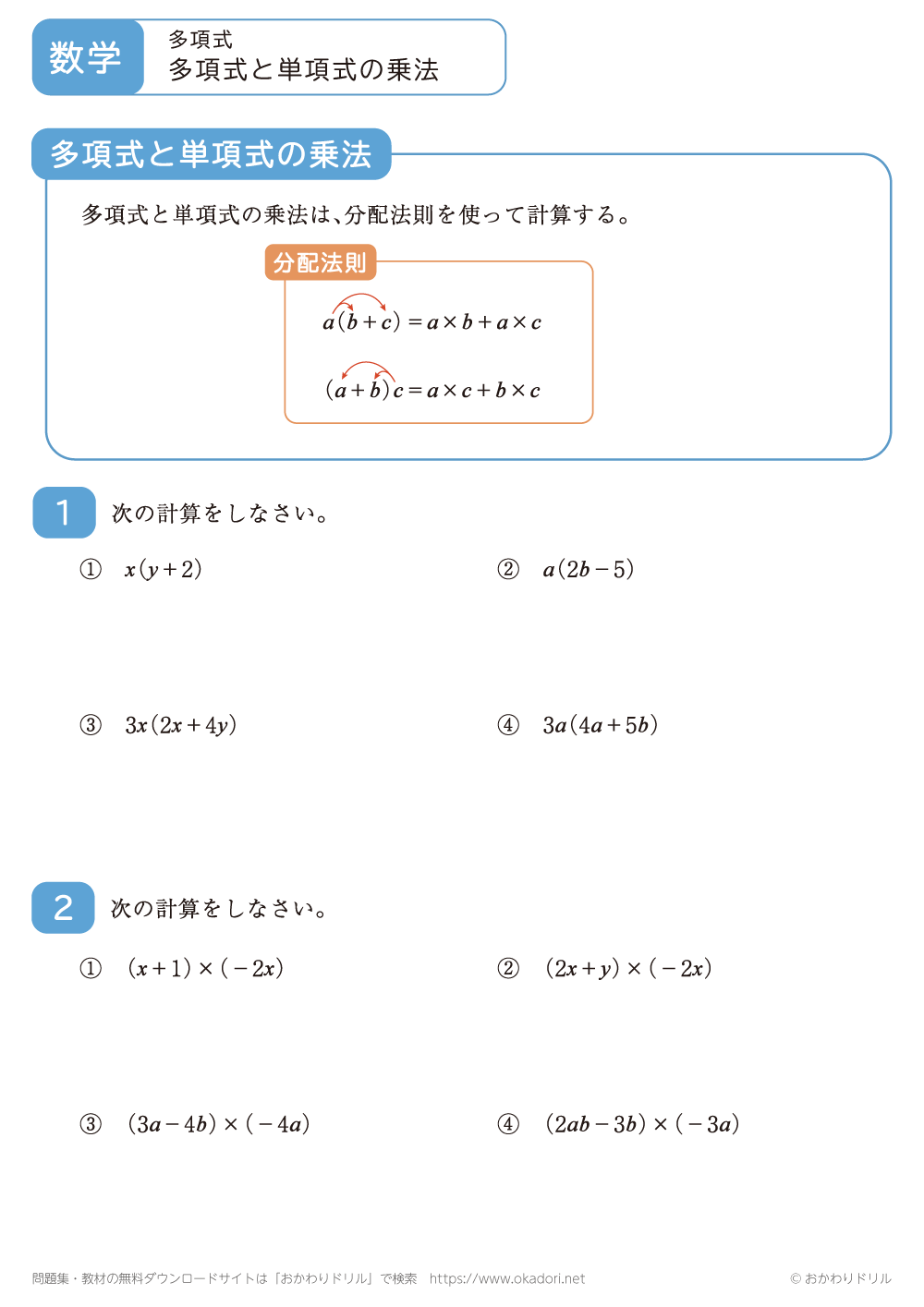 ・多項式と単項式の乗法は、分配法則を使って計算します。