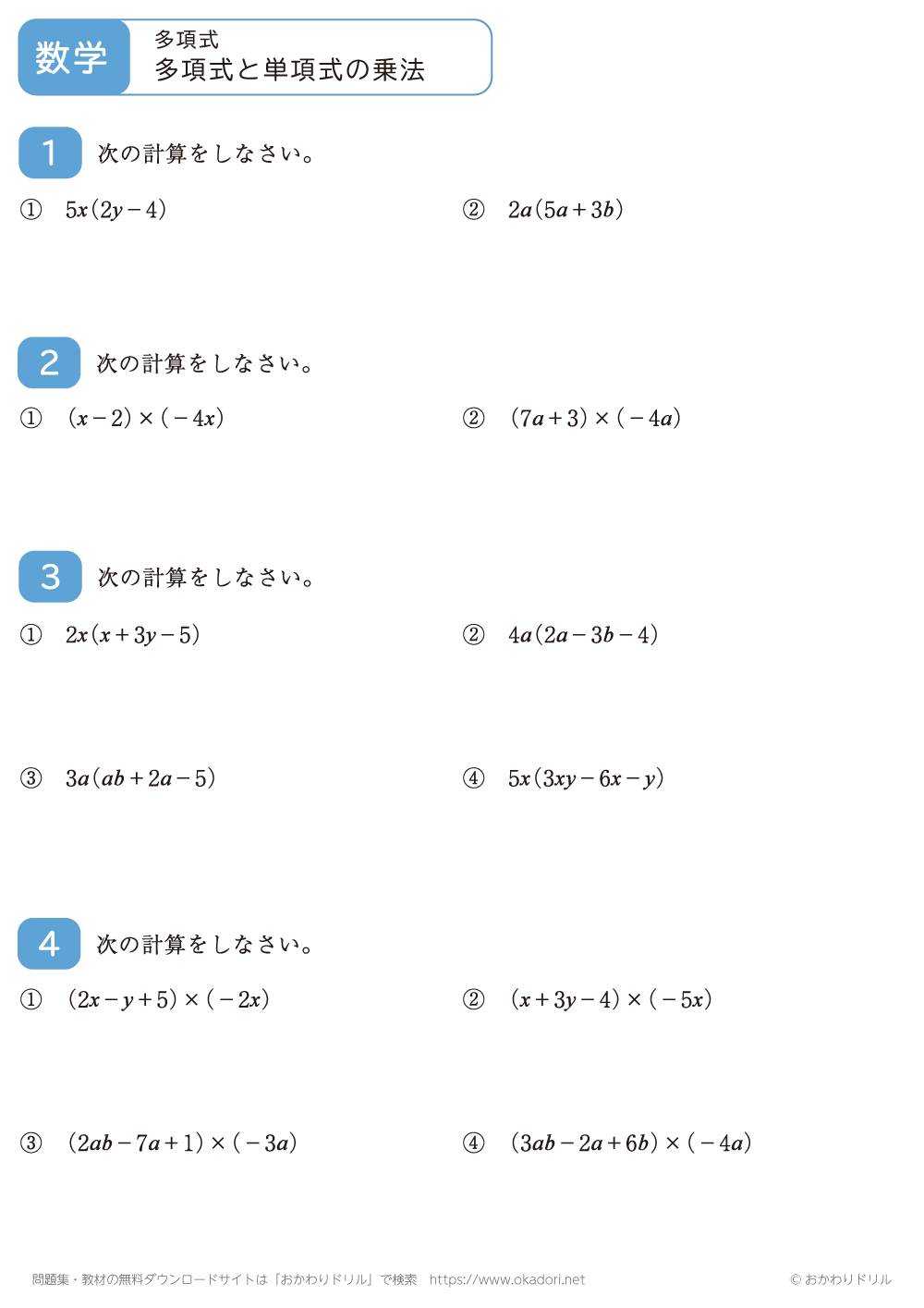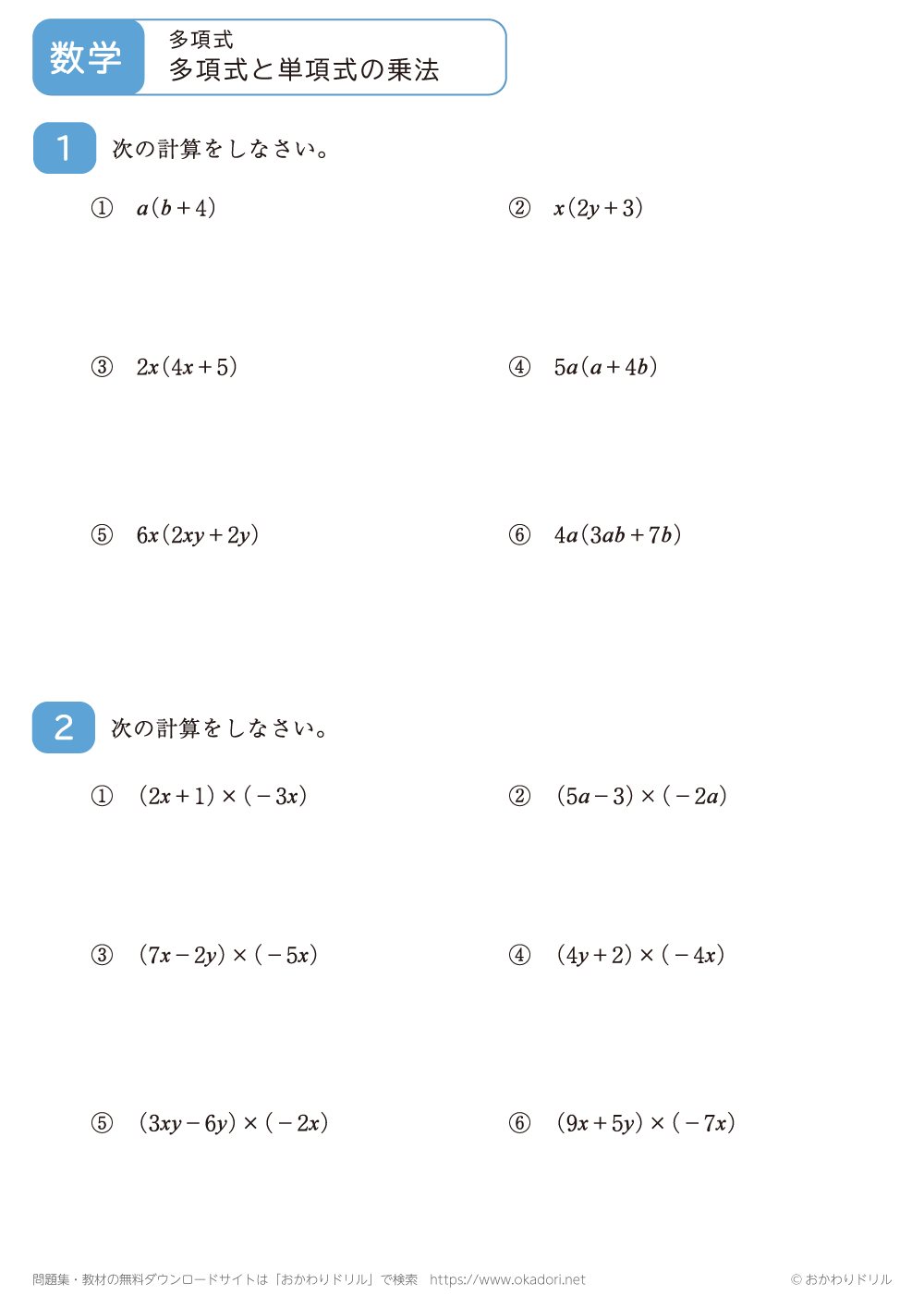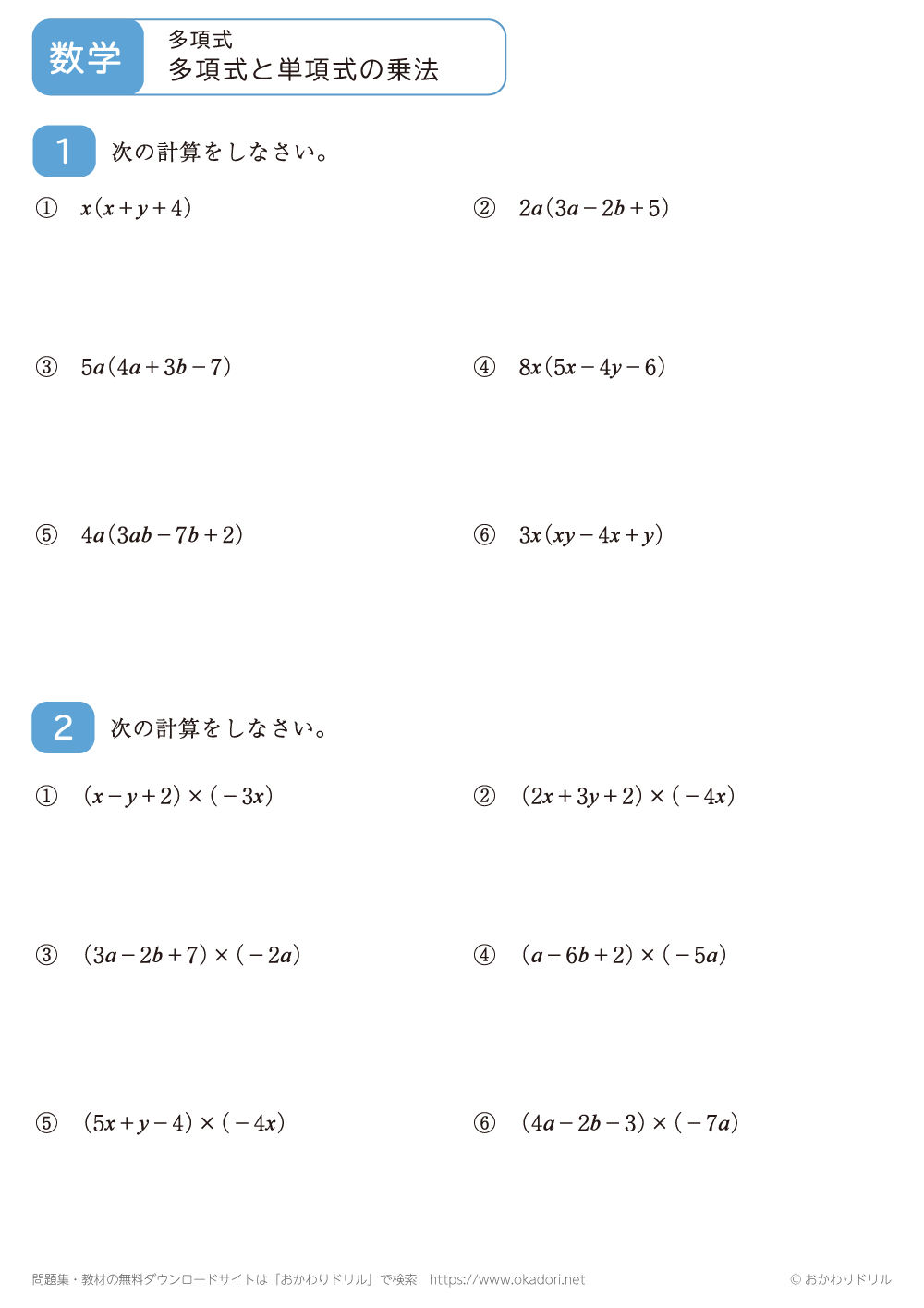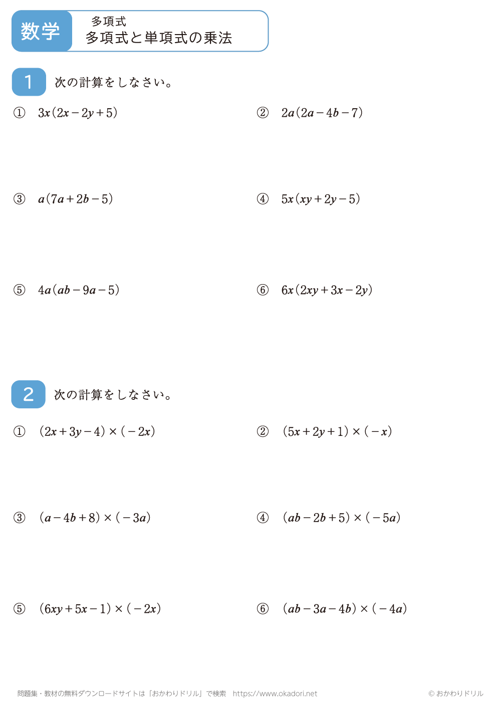 このページは、中学3年生で習う「多項式と単項式の乗法」が学習できるページです。