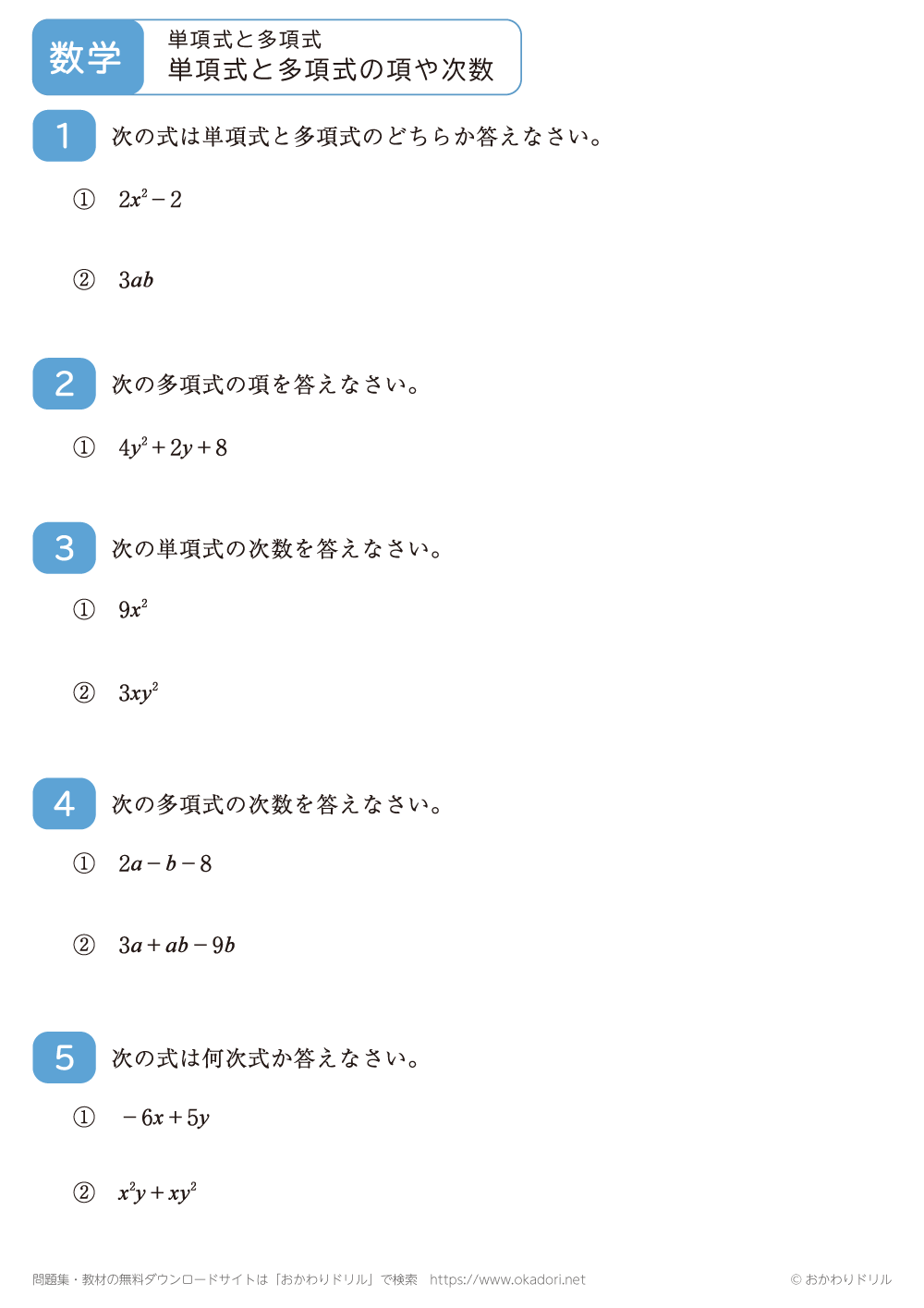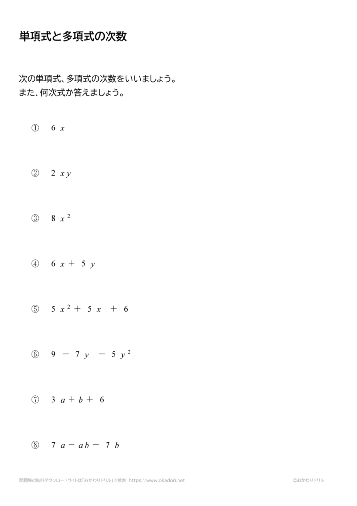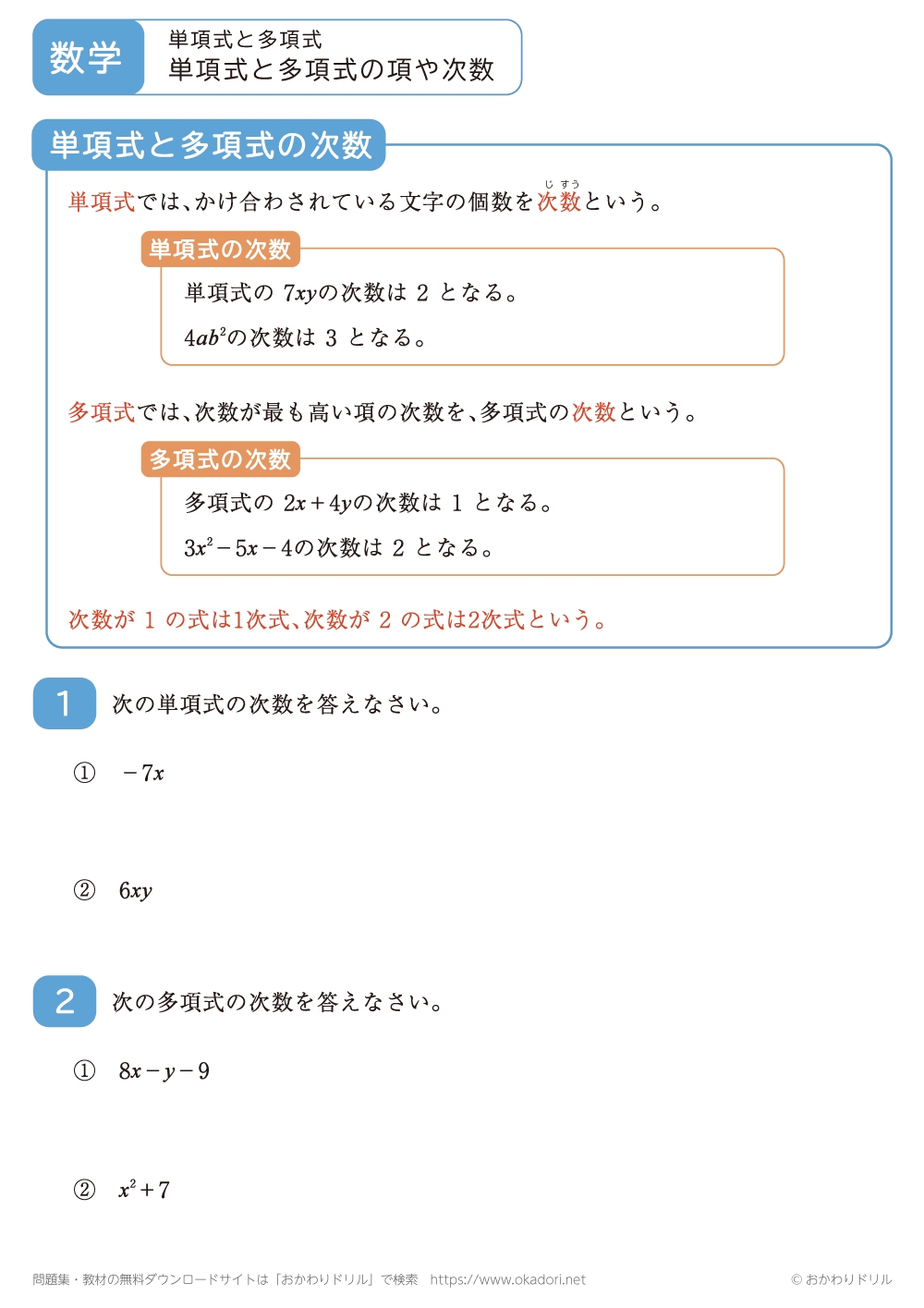 このページは、中学2年生で習う「単項式と多項式の項や次数」が学習できるページです ...