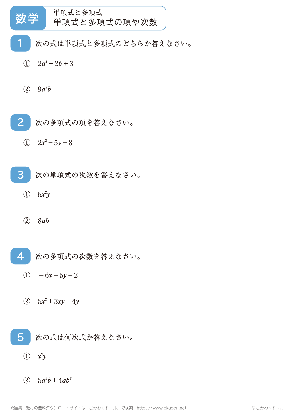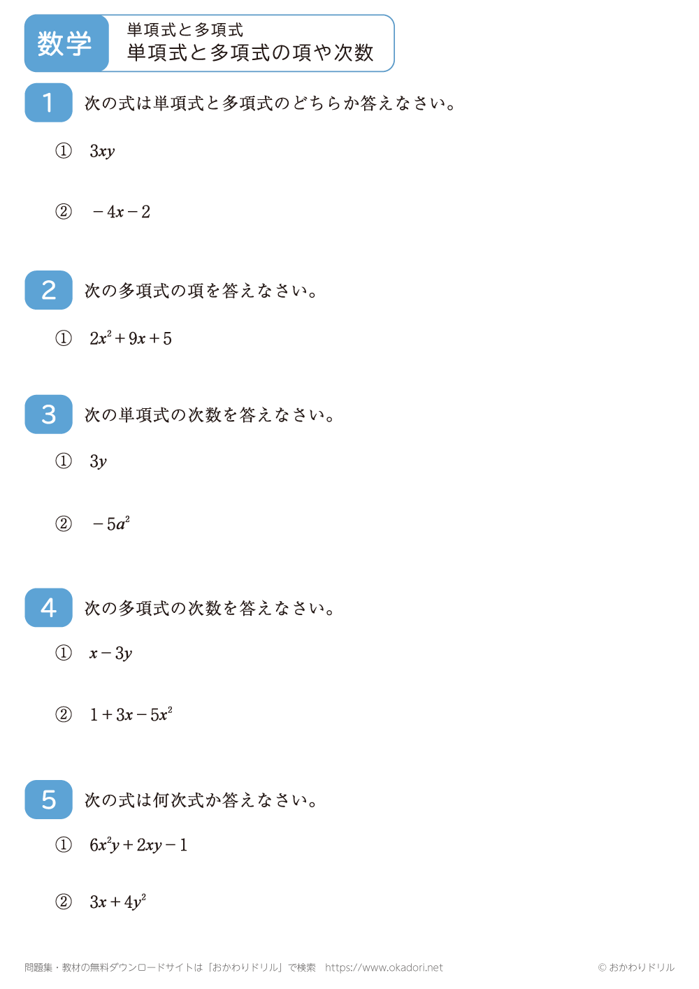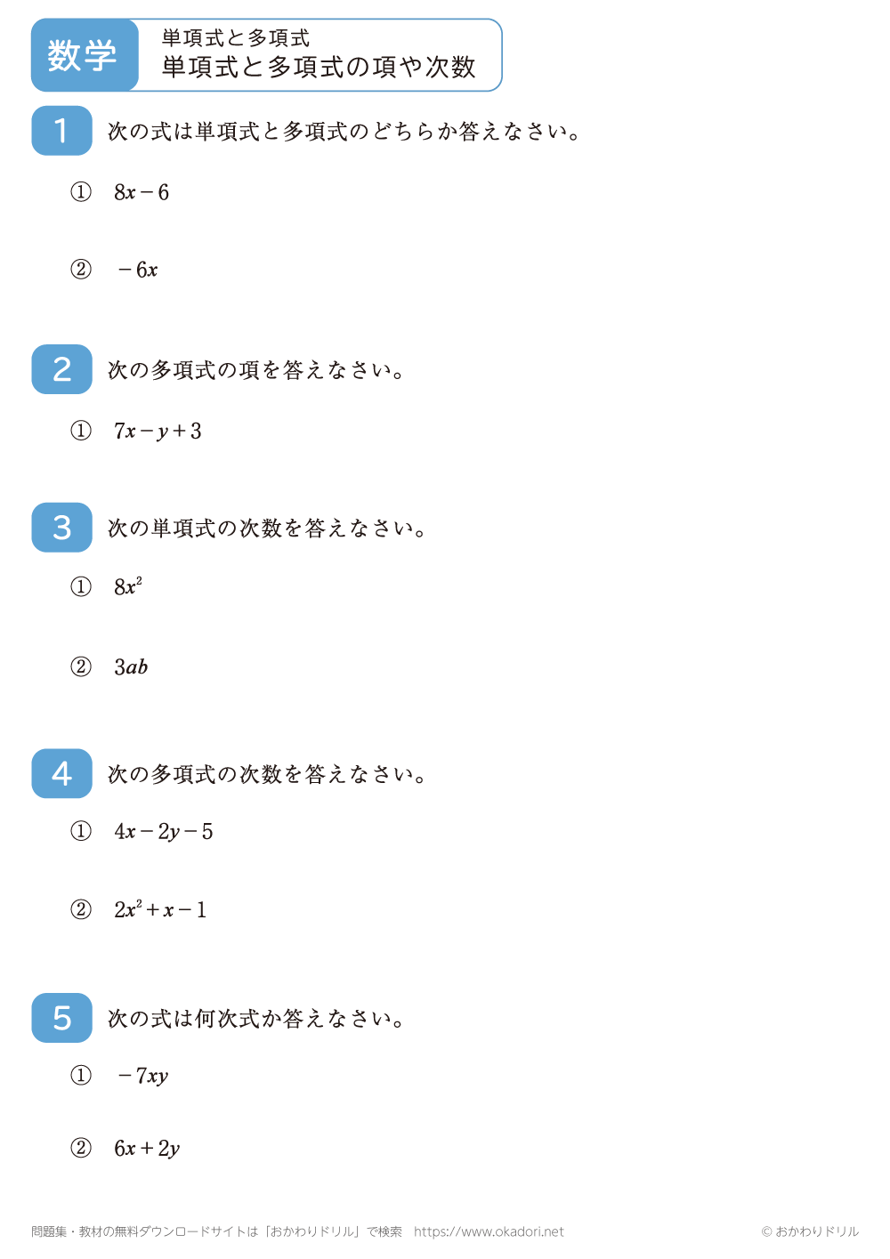 このページは、中学2年生で習う「単項式と多項式の項や次数」が学習できるページです ...