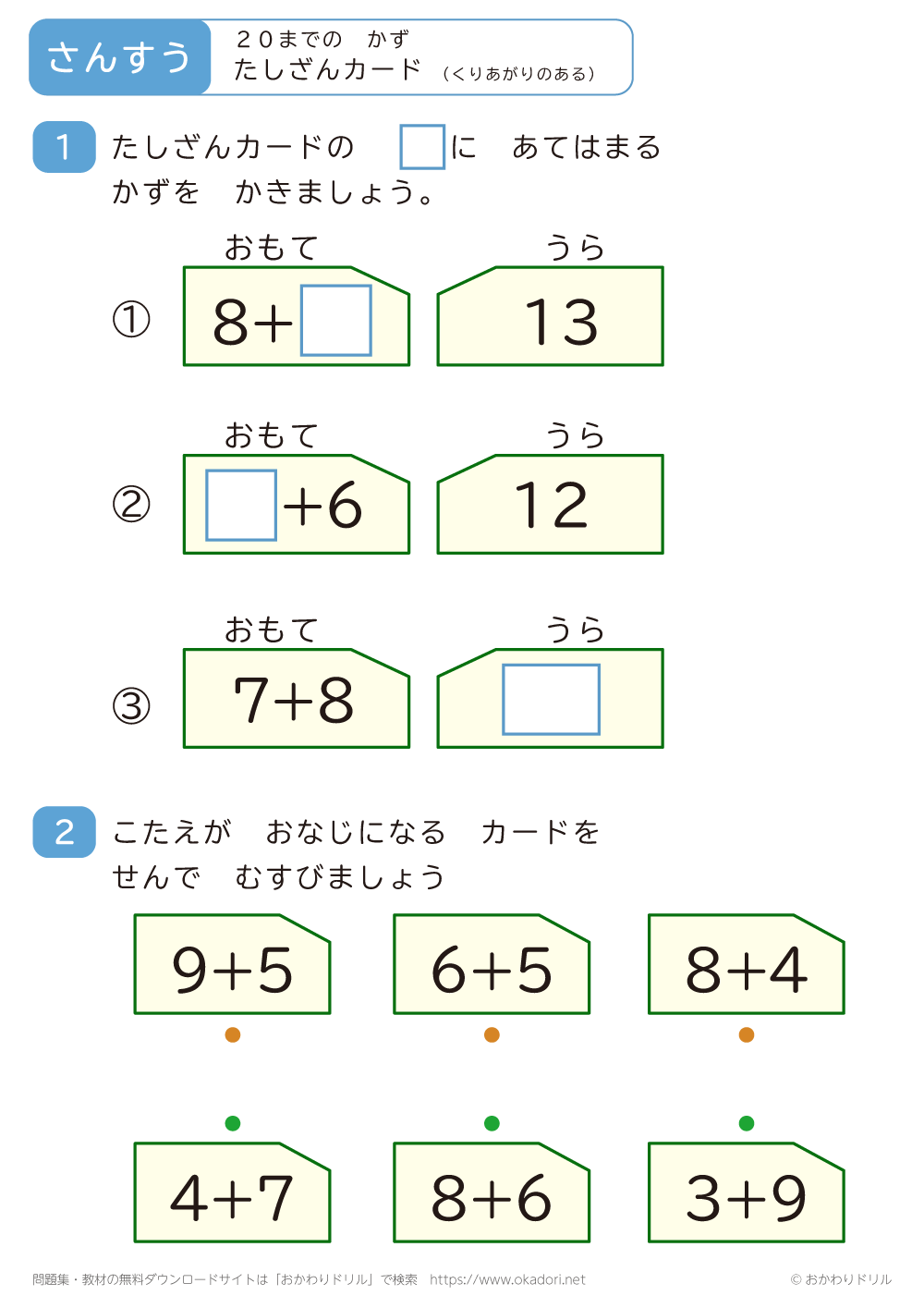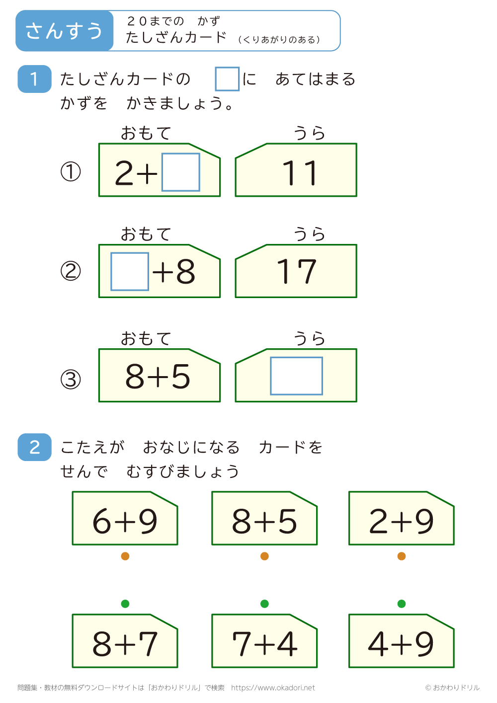 くり上がりのある足し算カードです。くり上がりのある足し算カードを計算してみましょう。