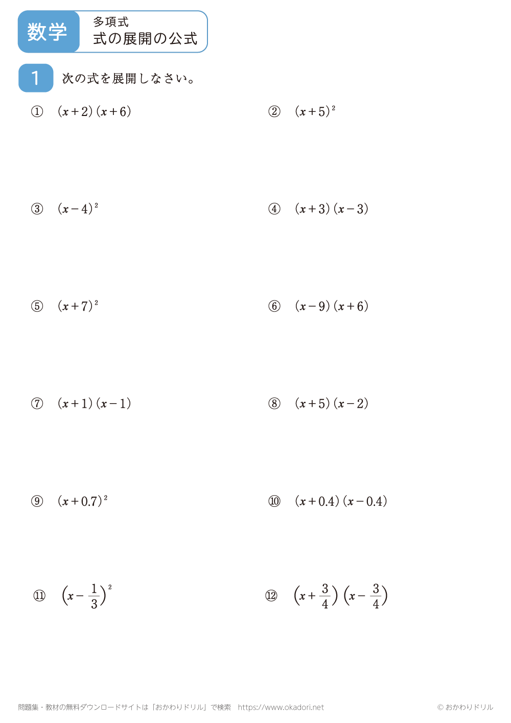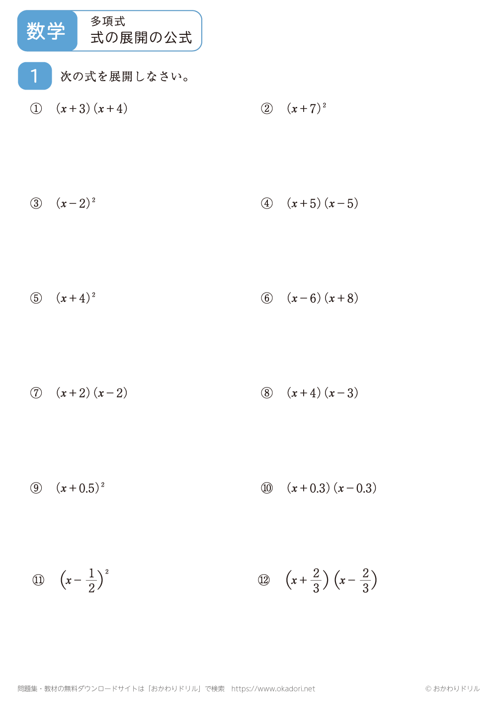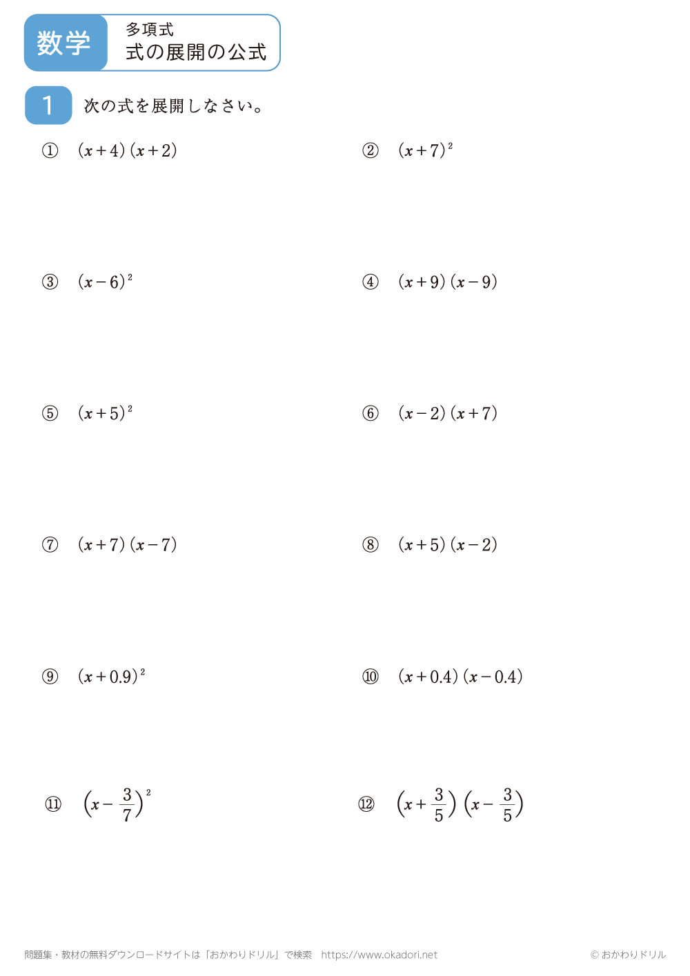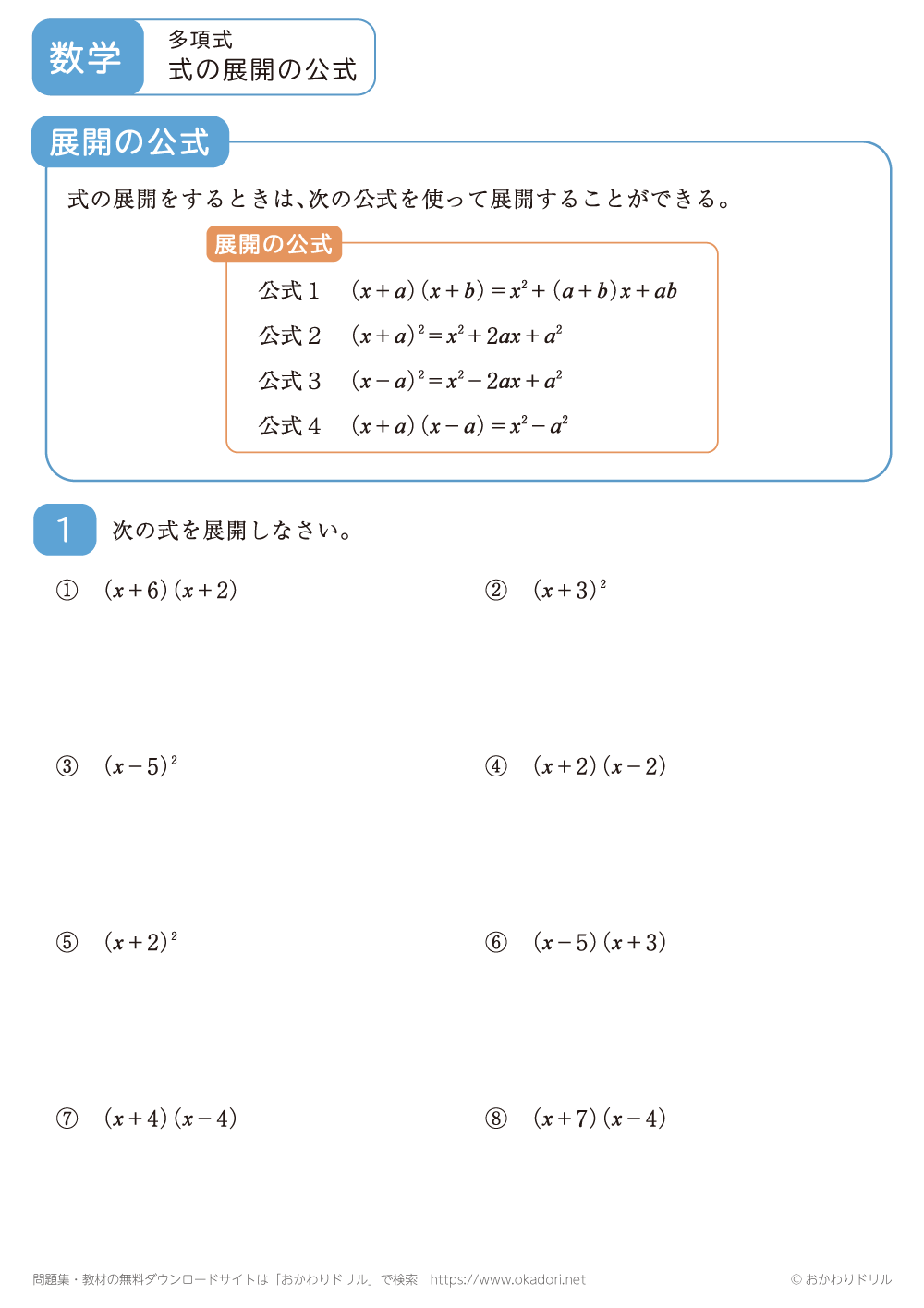 式の展開の公式の問題です。4つの展開の公式を覚えて問題を解いてみましょう。