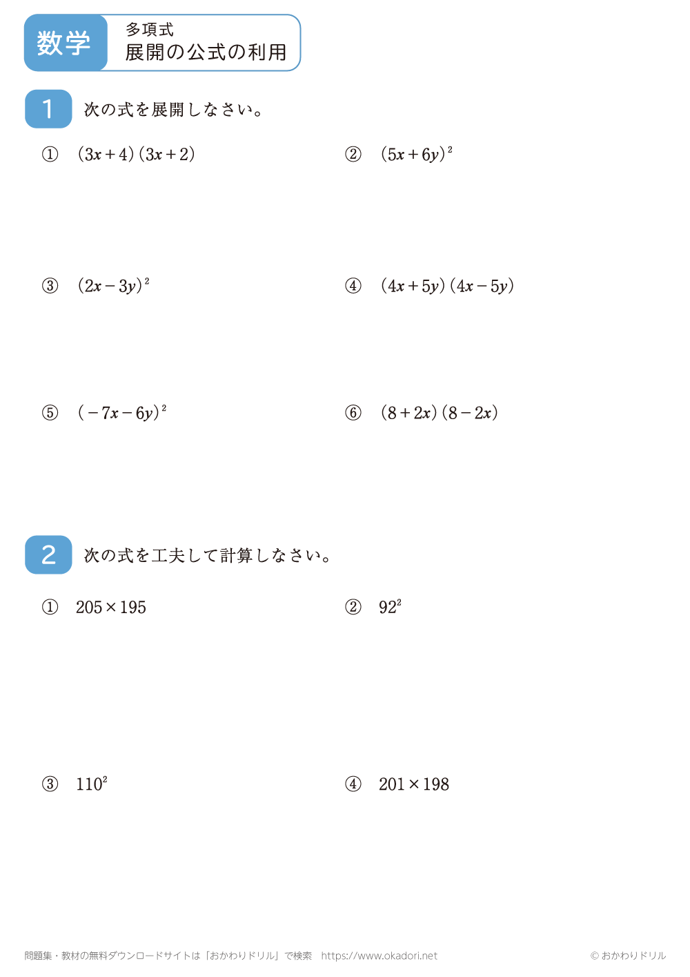 展開の公式を利用する問題です。展開の公式を使っていろいろな多項式を展開したり、式を工夫して計算する問題を解いてみましょう。
