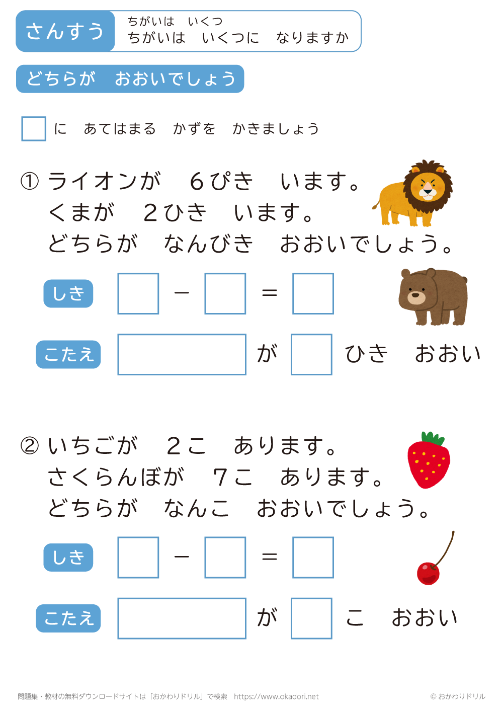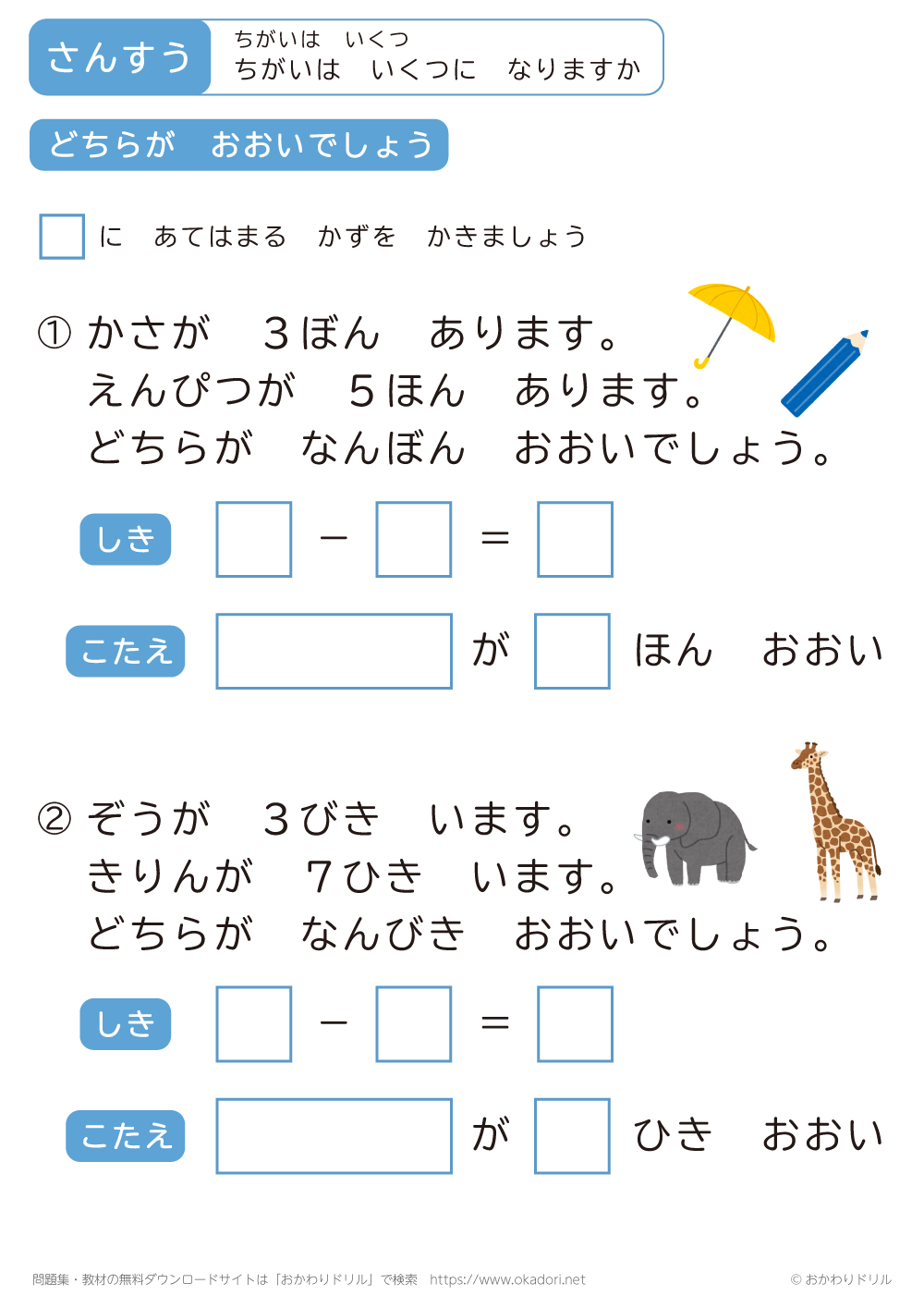このページは、小学1年生で習う「ちがいはいくつ」を学習できるページです。