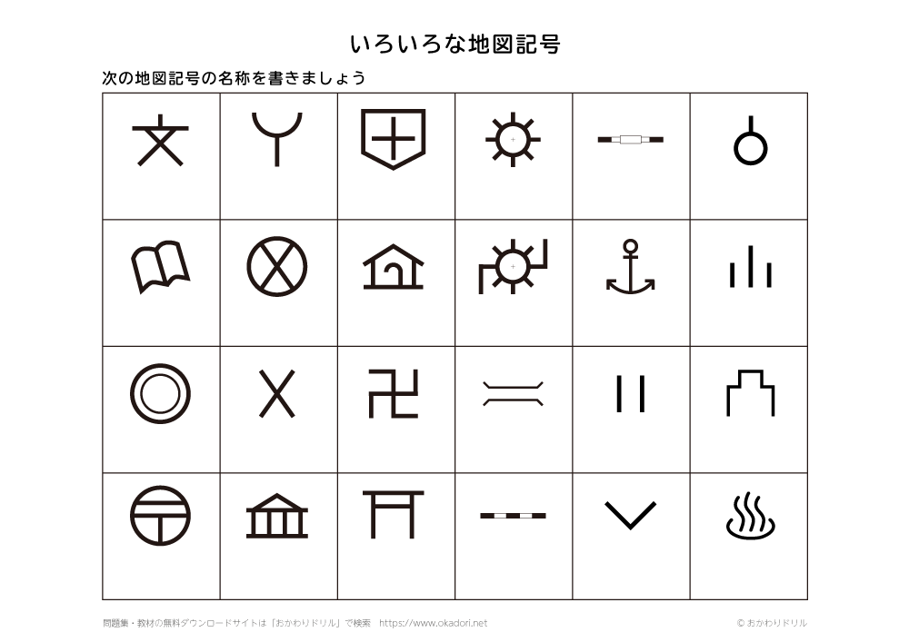 地図記号と、その名称を書いたプリントを用意しています。地図記号を覚えたかテストしたい時には、地図記号や名称を消して問題にしているプリントもあるので、利用してみて下さい。