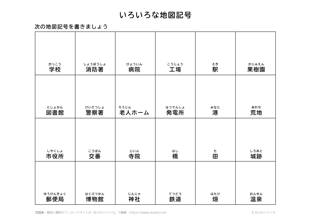 ・地図記号の意味を知ったり、覚える時に利用できるプリントです。