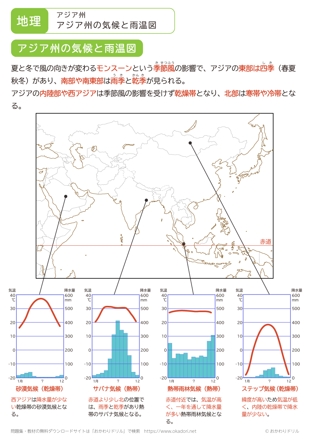 このページは、中学生で習う「アジア州の気候と雨温図」を学習できるページです。 こ ...