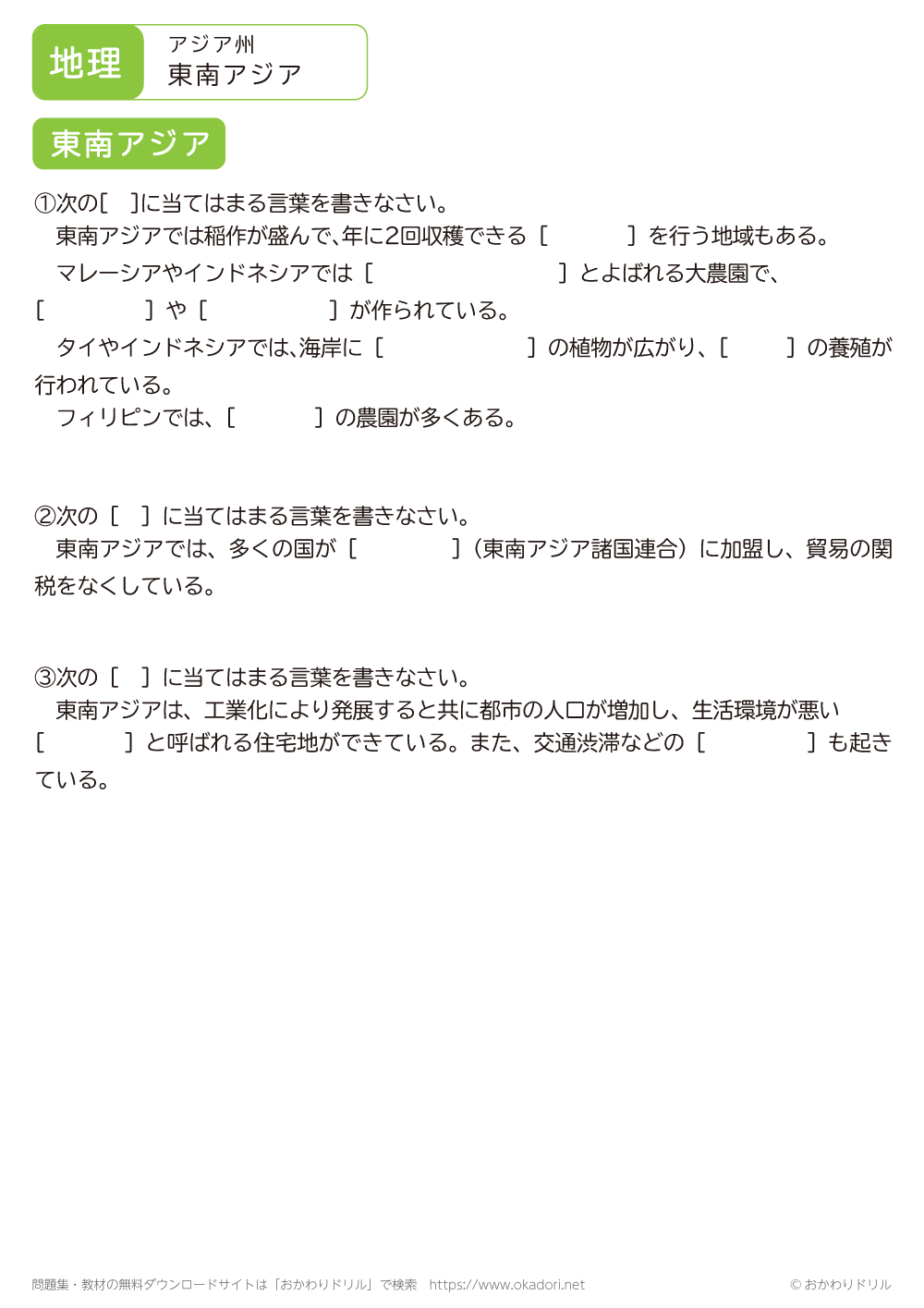 東南アジアの農業は降水量が多く稲作が盛んであるとともに、植民地時代からの流れでプランテーションによる商品作物も多く作られています。また、外国企業を受け入れて工業化を進めるとともに、多くの国がASEANに加盟して関税をなくしています。東南アジアの農業、工業、課題について学習するためのプリントを用意しています。覚えることができたかテストしたい時には、問題プリントを利用してみて下さい。