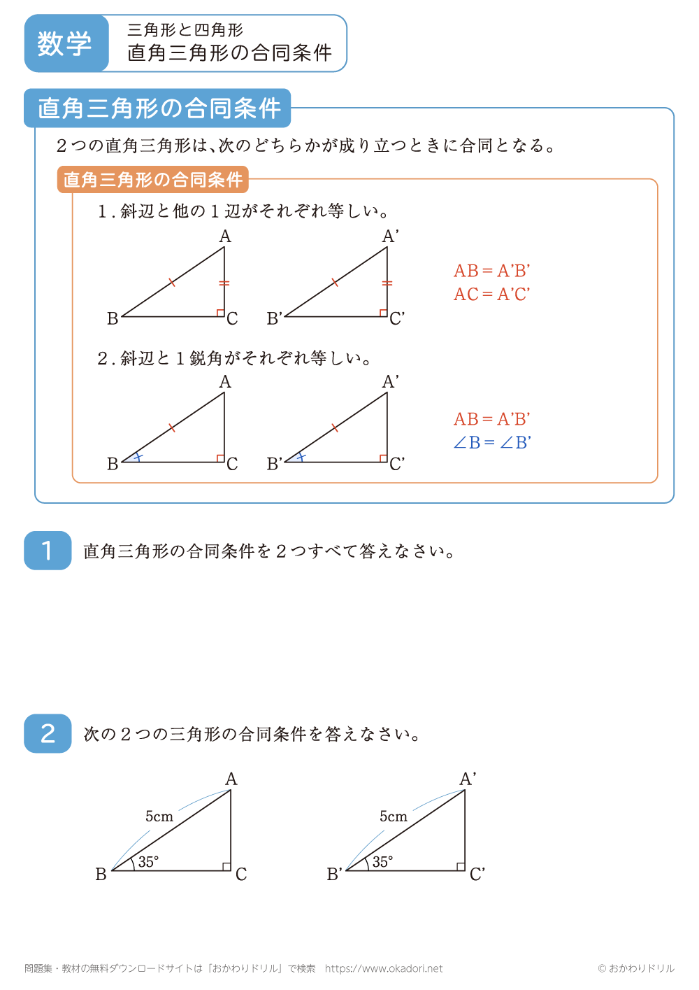 直角三角形の合同条件を答える問題です。直角三角形の合同条件を覚えて問題を解きましょう。