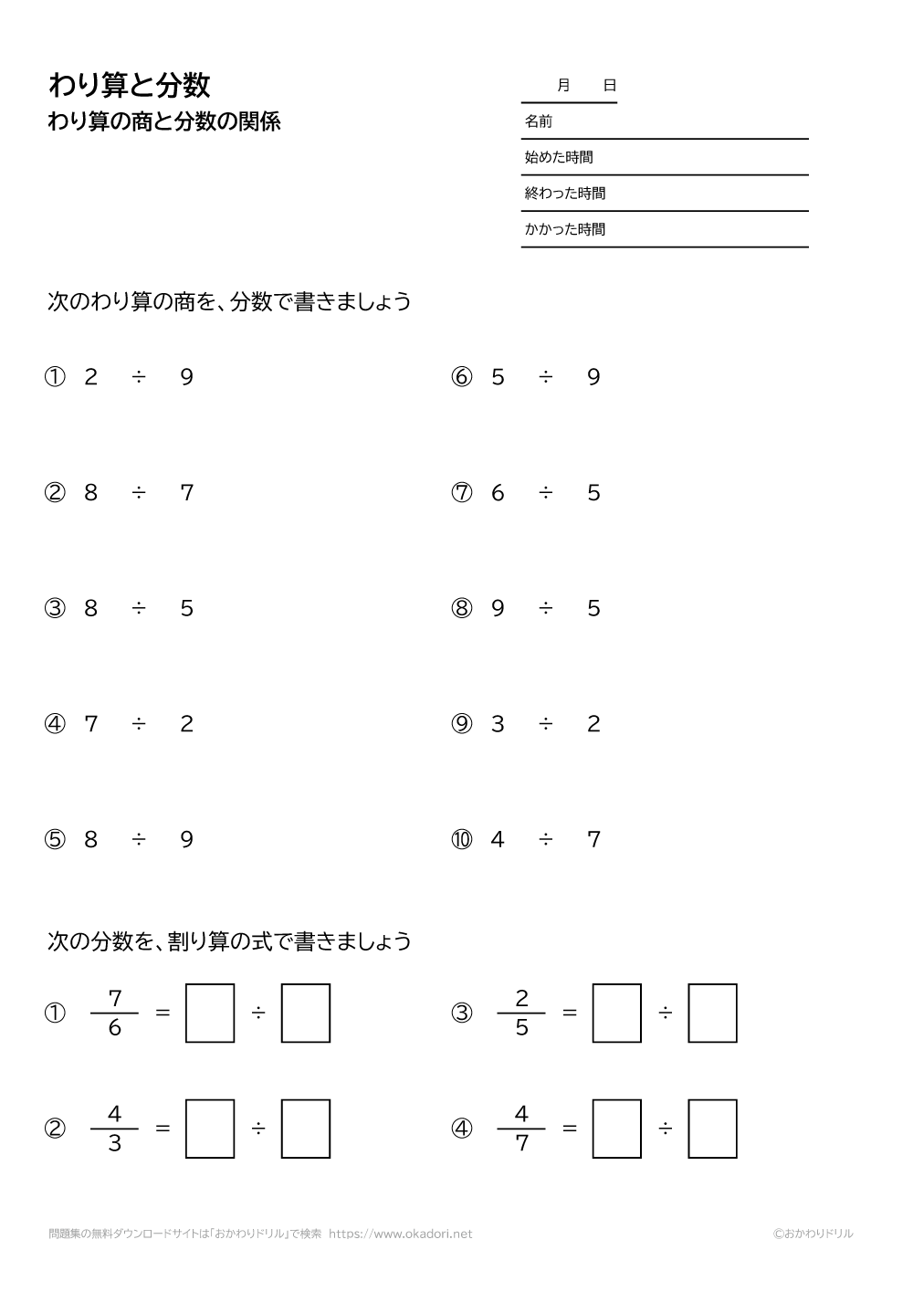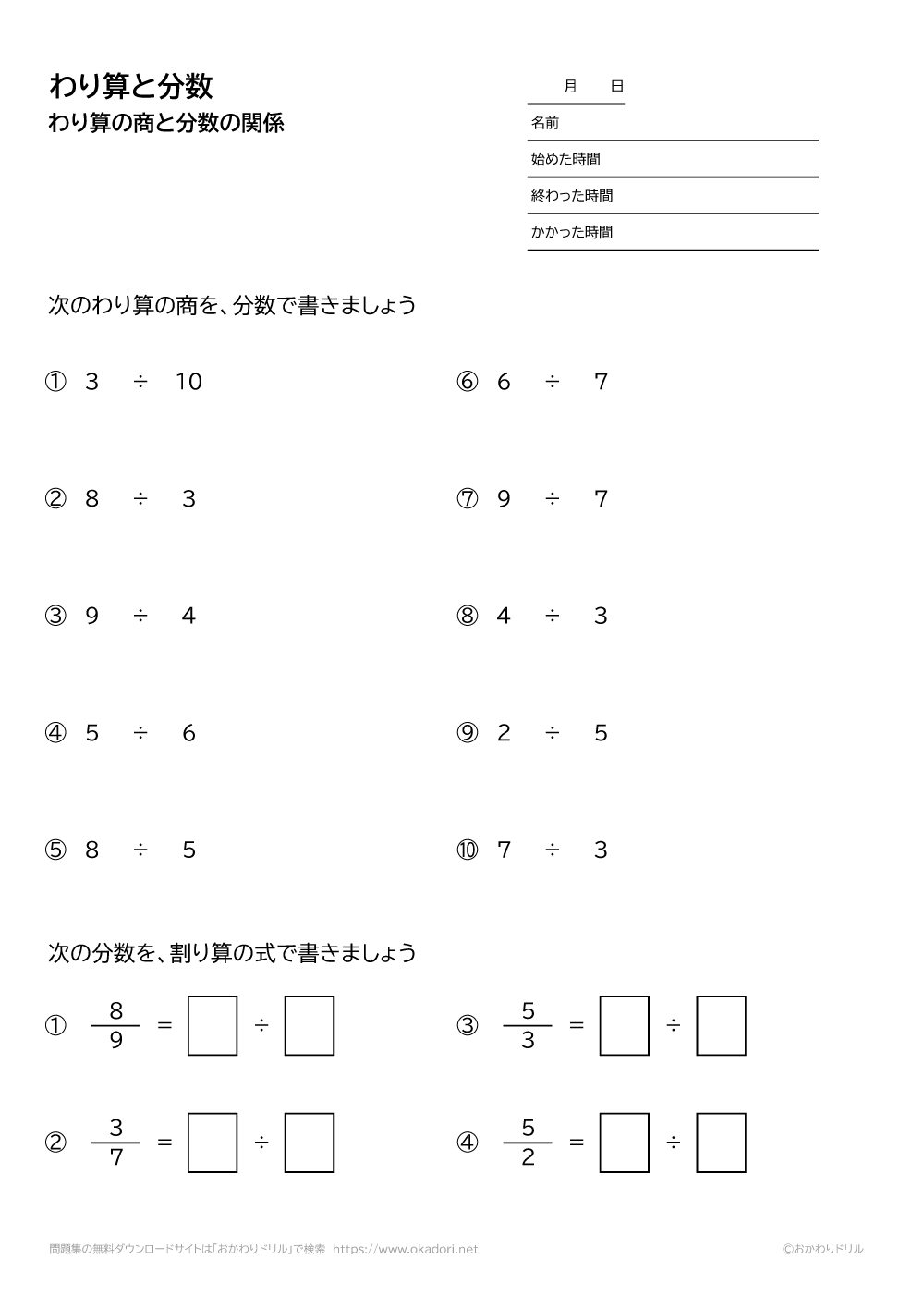 割り算の商を、分数を使って書き表す問題です。その逆に分数は割り算の式の形で書き表す問題もあります。
