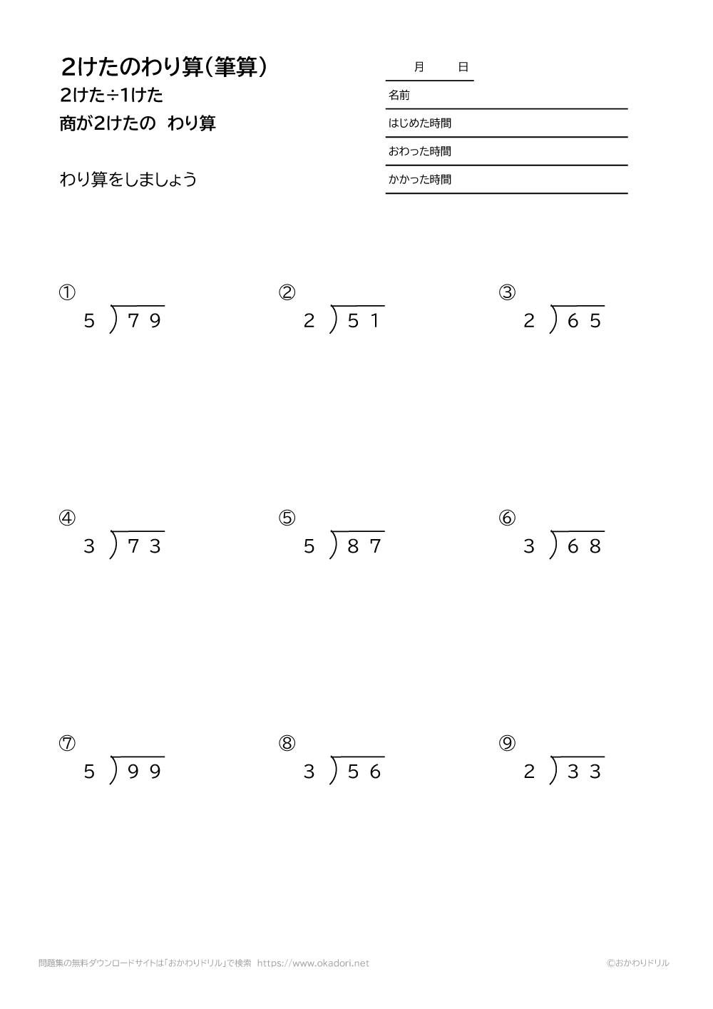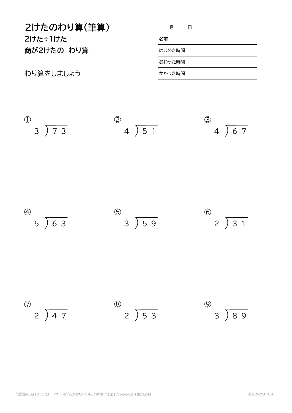 2桁と1桁の割り算の問題です。割り切れないときは余りが出ることに注意して割り算を解く問題です。